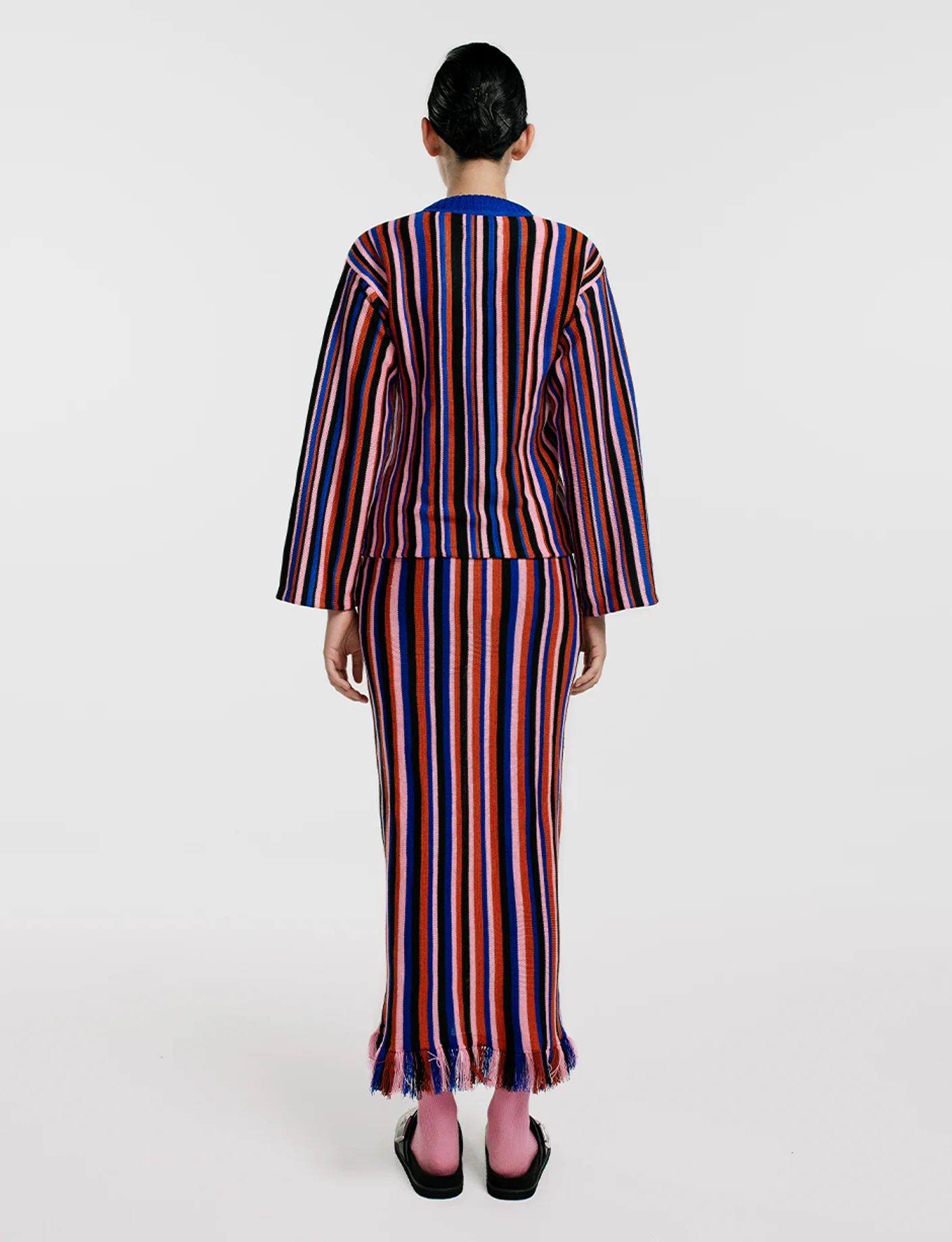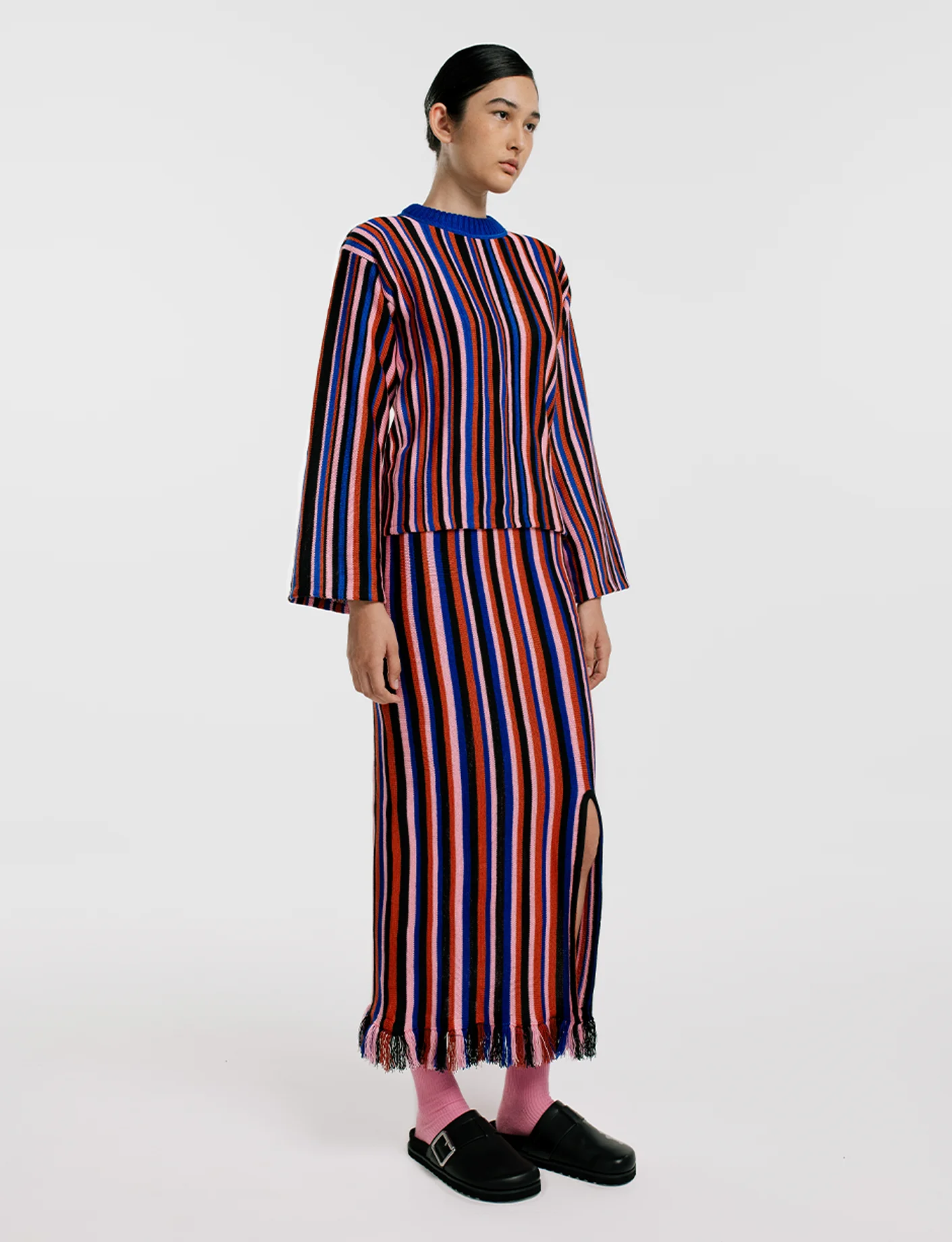 Sweater con franjas verticales en colores vibrantes. Multicolor con fondo claro. Silueta recta. Técnica de intarsia + bordado.