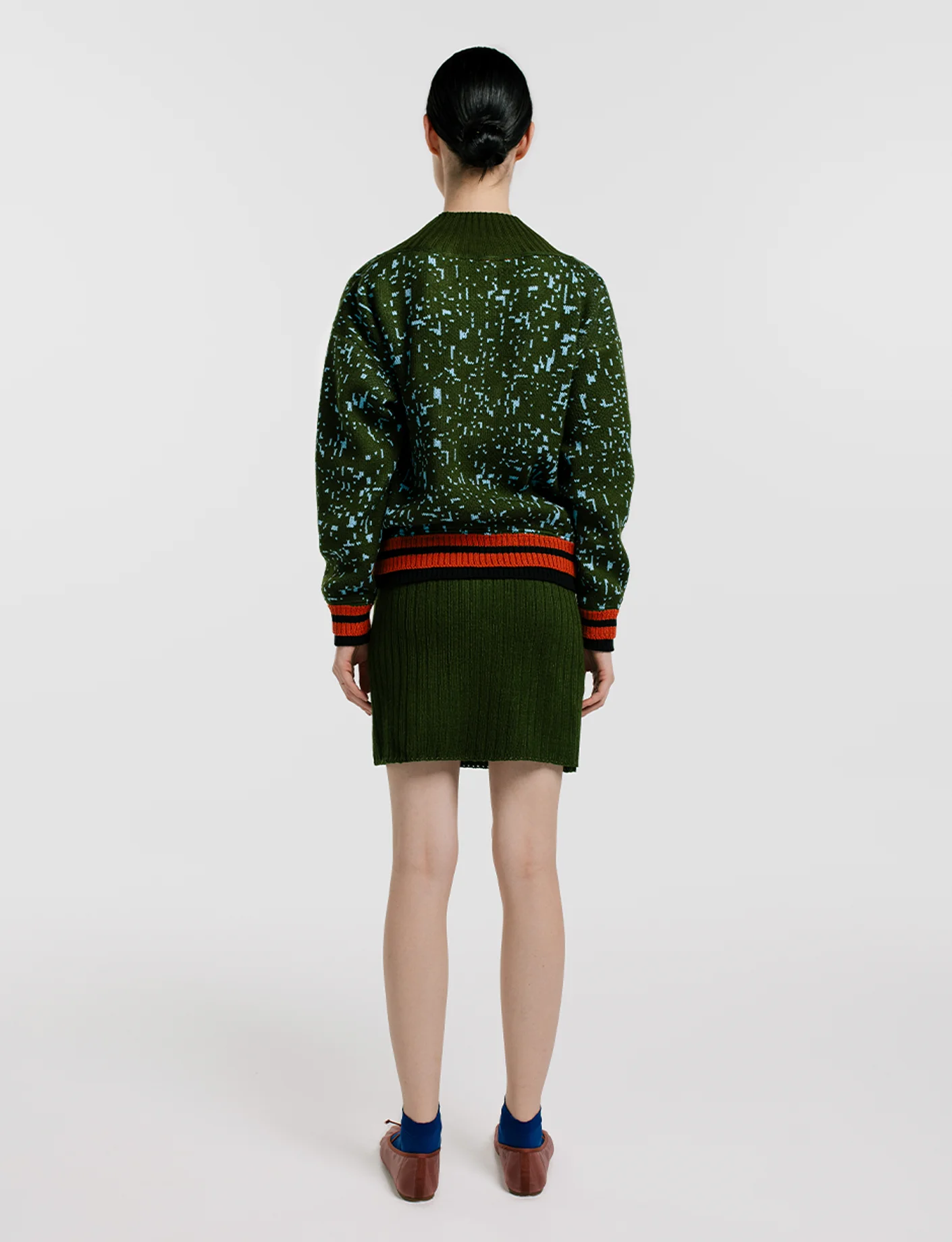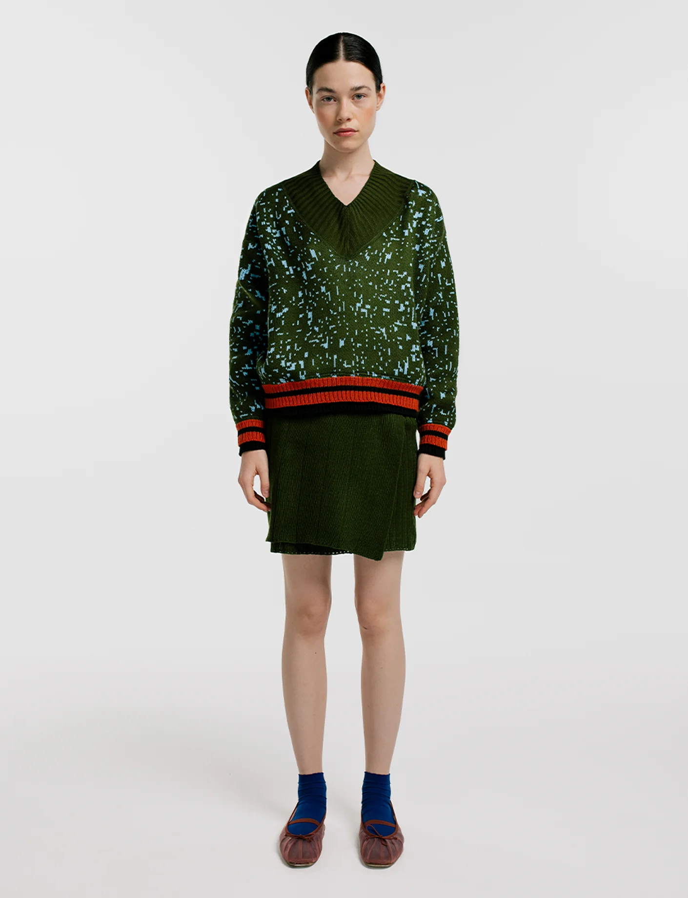 Sweater con cuello en V y diseño de pixeles. Colores: Verde Militar, terracota y azul. Fit suelto. Diseño tejido con detalles a mano. Hecho en Sogamoso, Boyacá, Colombia.