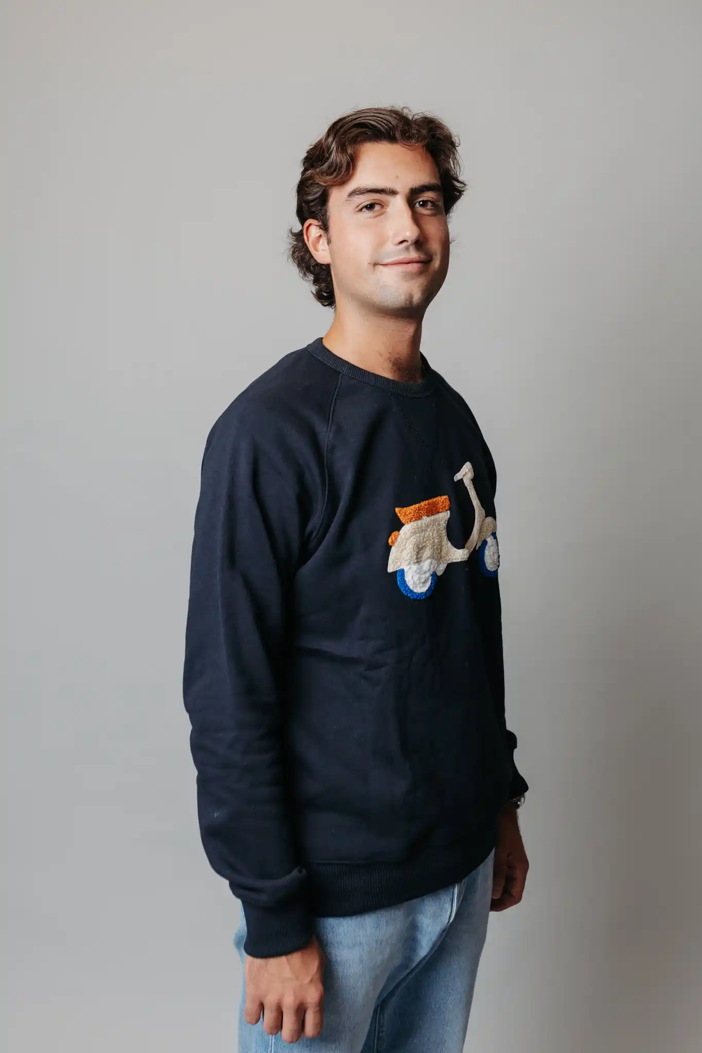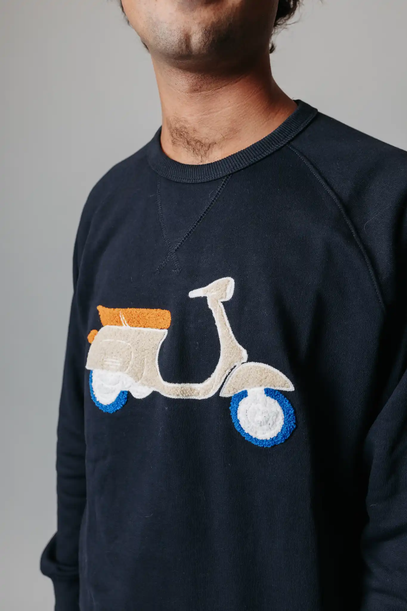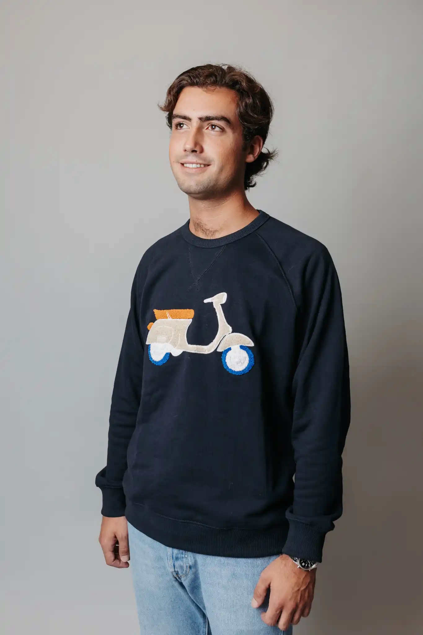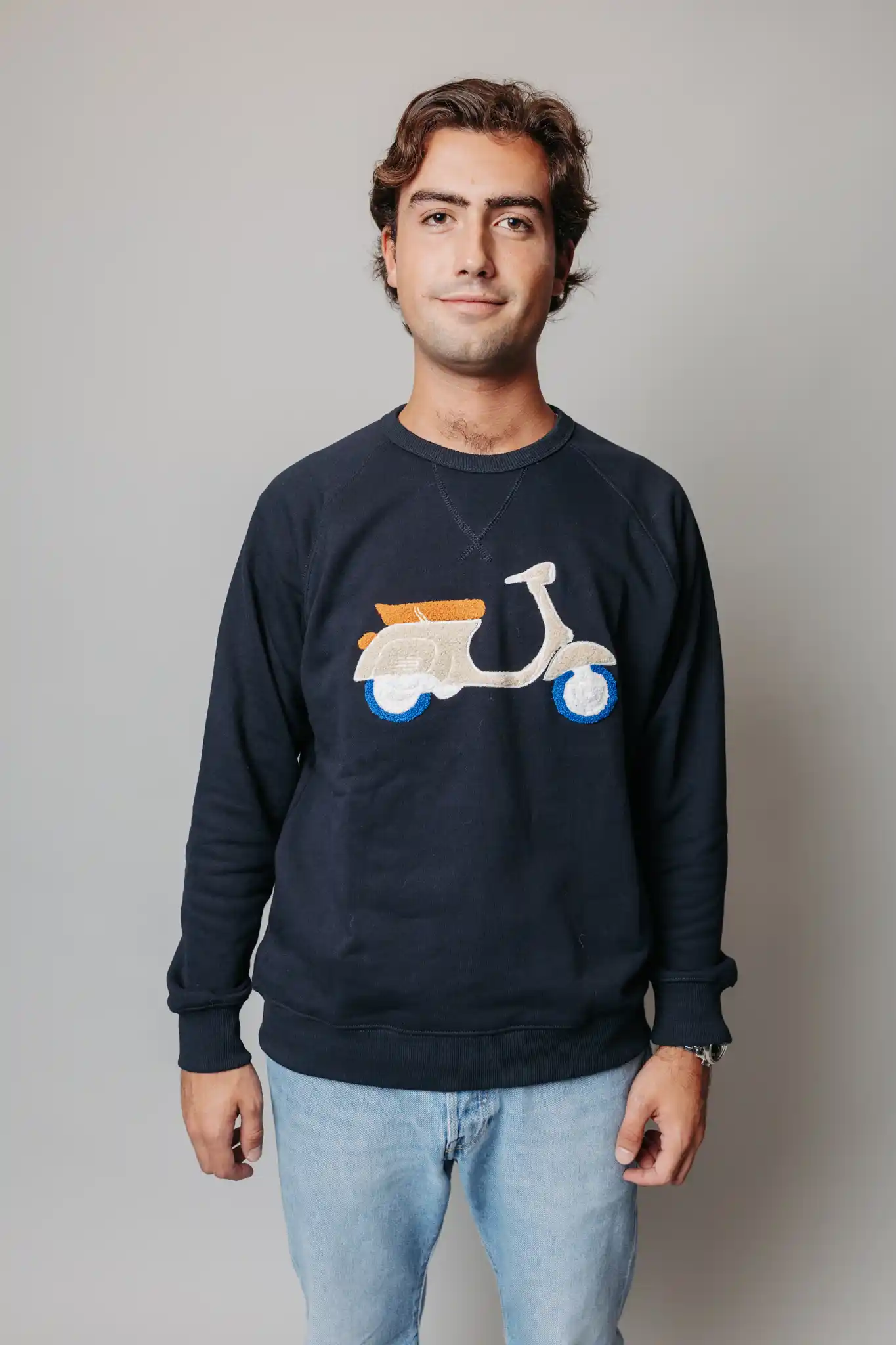 ¡Novedad en Nud&Clo! Sudadera de hombre con manga larga azul marino con detalle de motivo Vespa aplicado en la parte delantera.¡Todos desearán una! ¡Haz tu pedido ahora!
