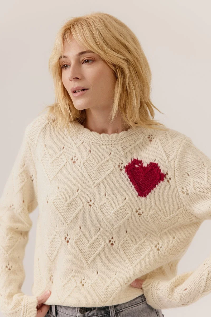 Suéter de punto con estampado de corazones calados, cuello redondo y manga larga. Detalle de corazón de punto en contraste en el pecho. Bajo, puños y cuello acanalados.