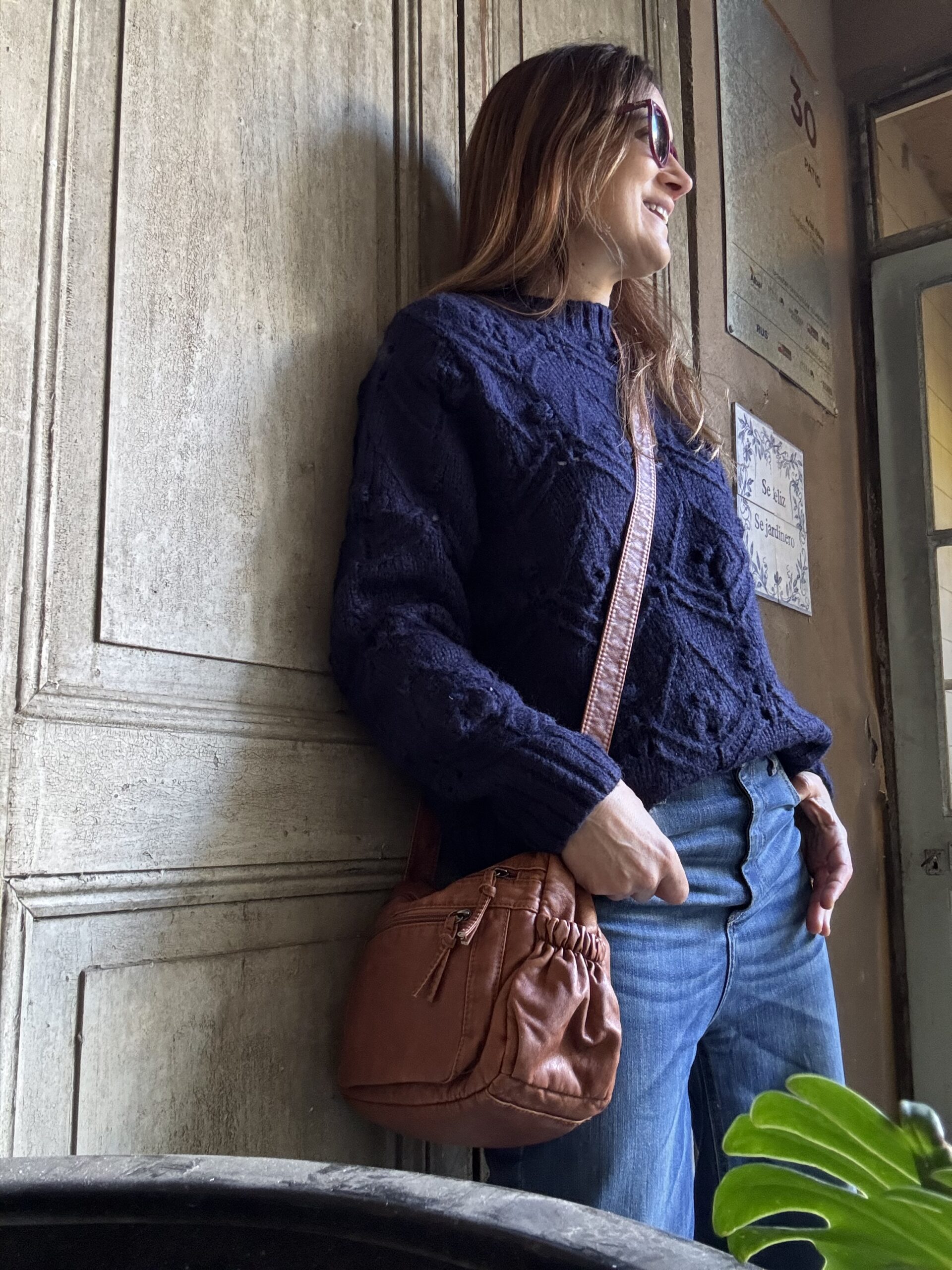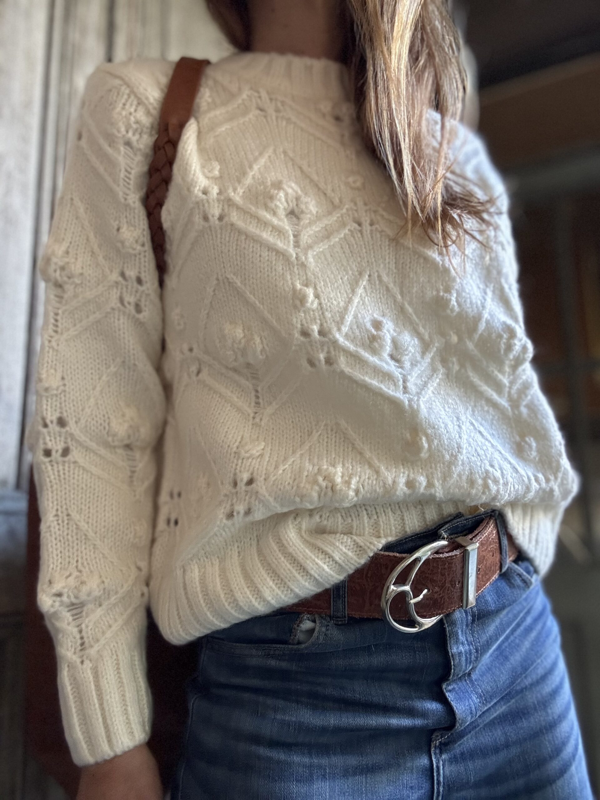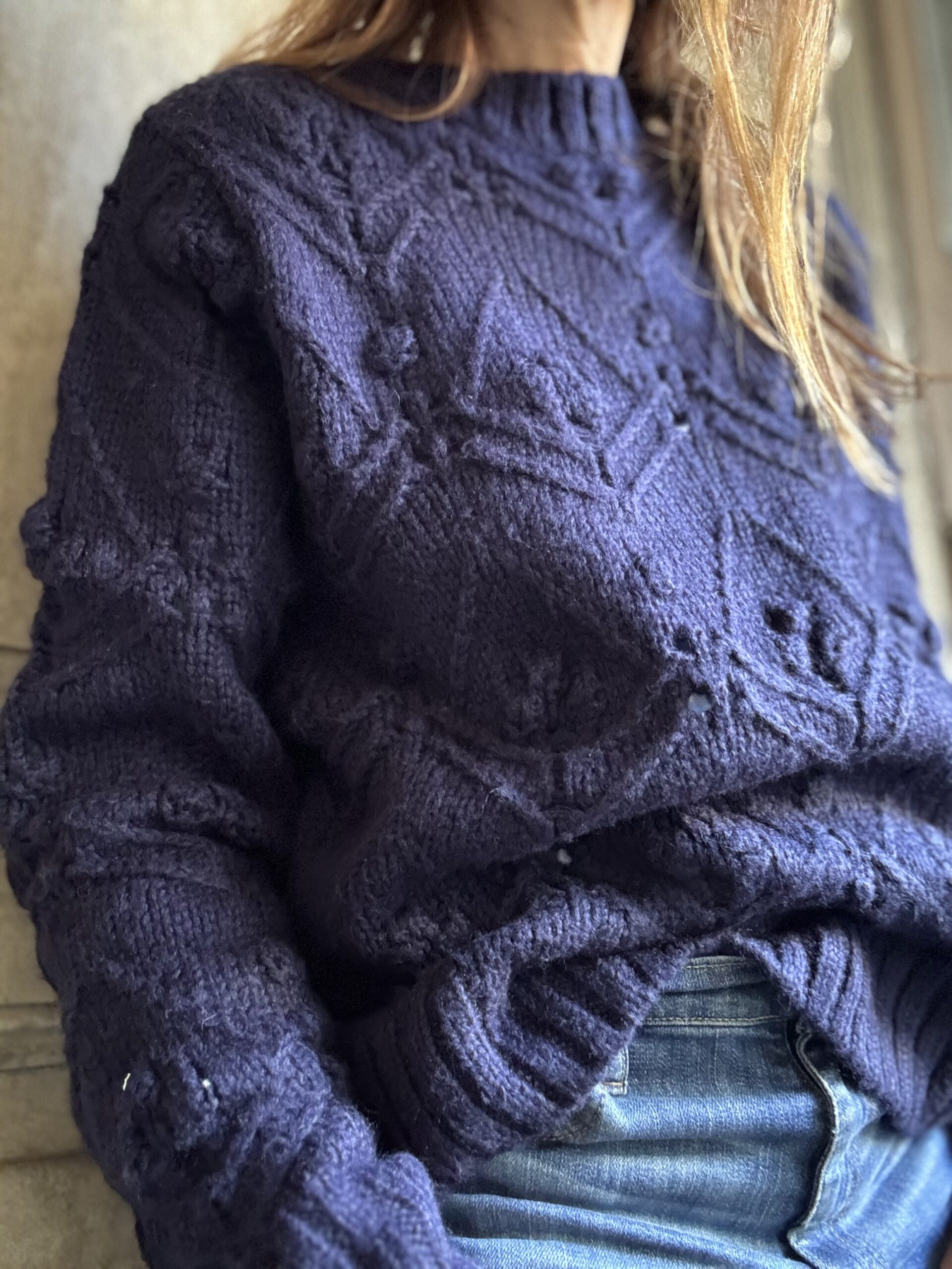 Sweater cuello redondo, calado con detalle de flores.