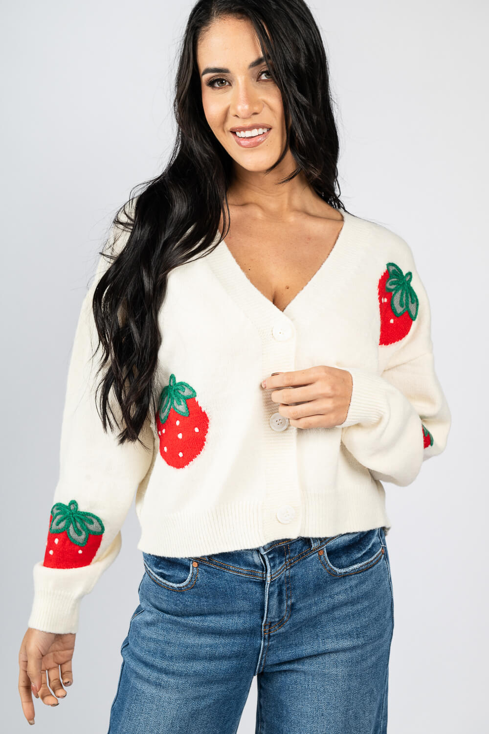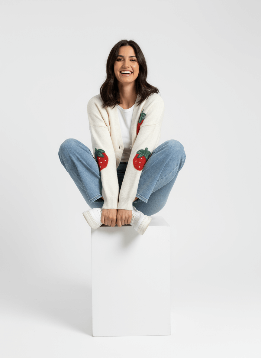 Sweater tipo cardigan con mega fresas