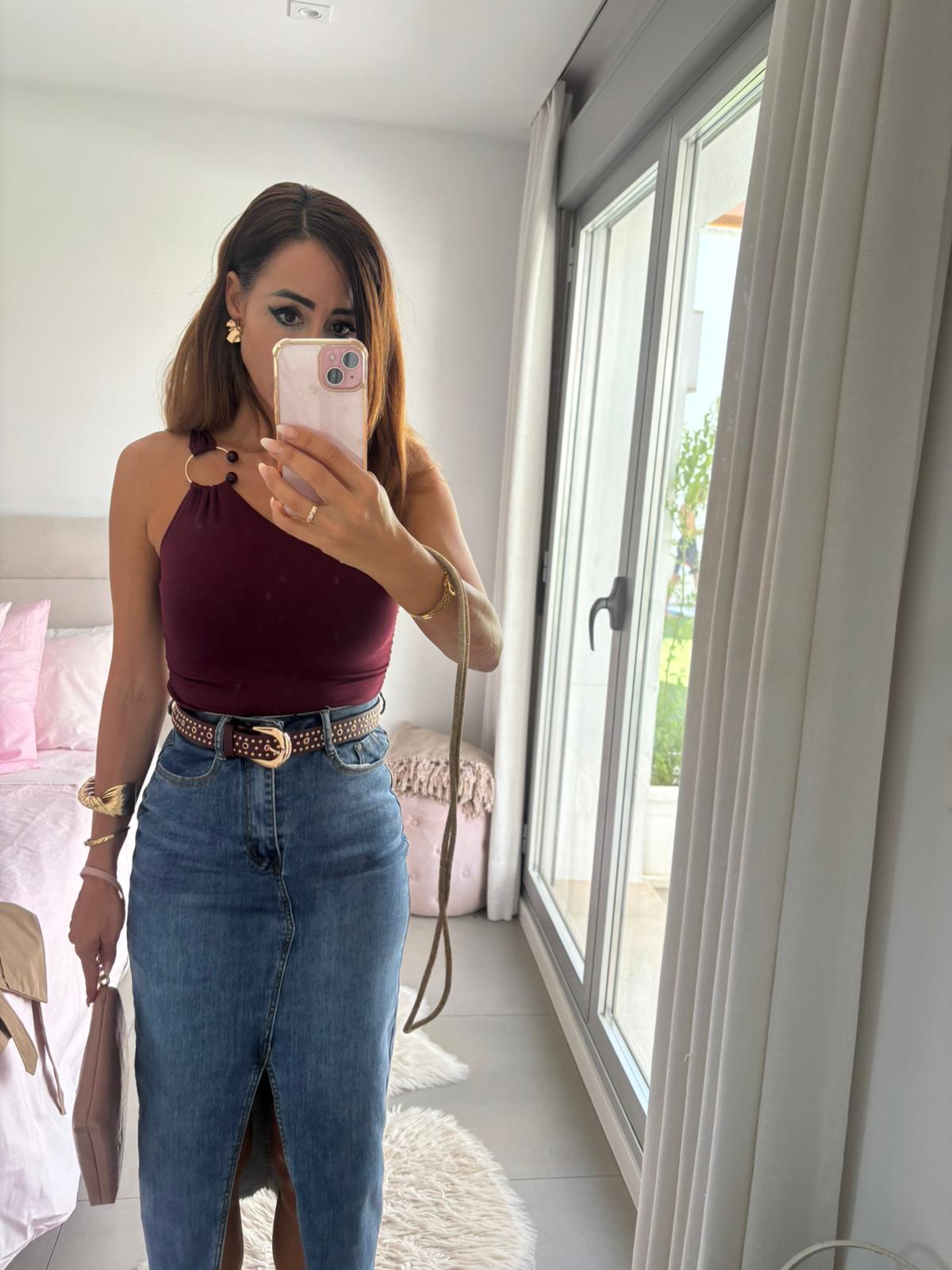 Top halter ajustado con detalle de aro decorativo en el tirante.
