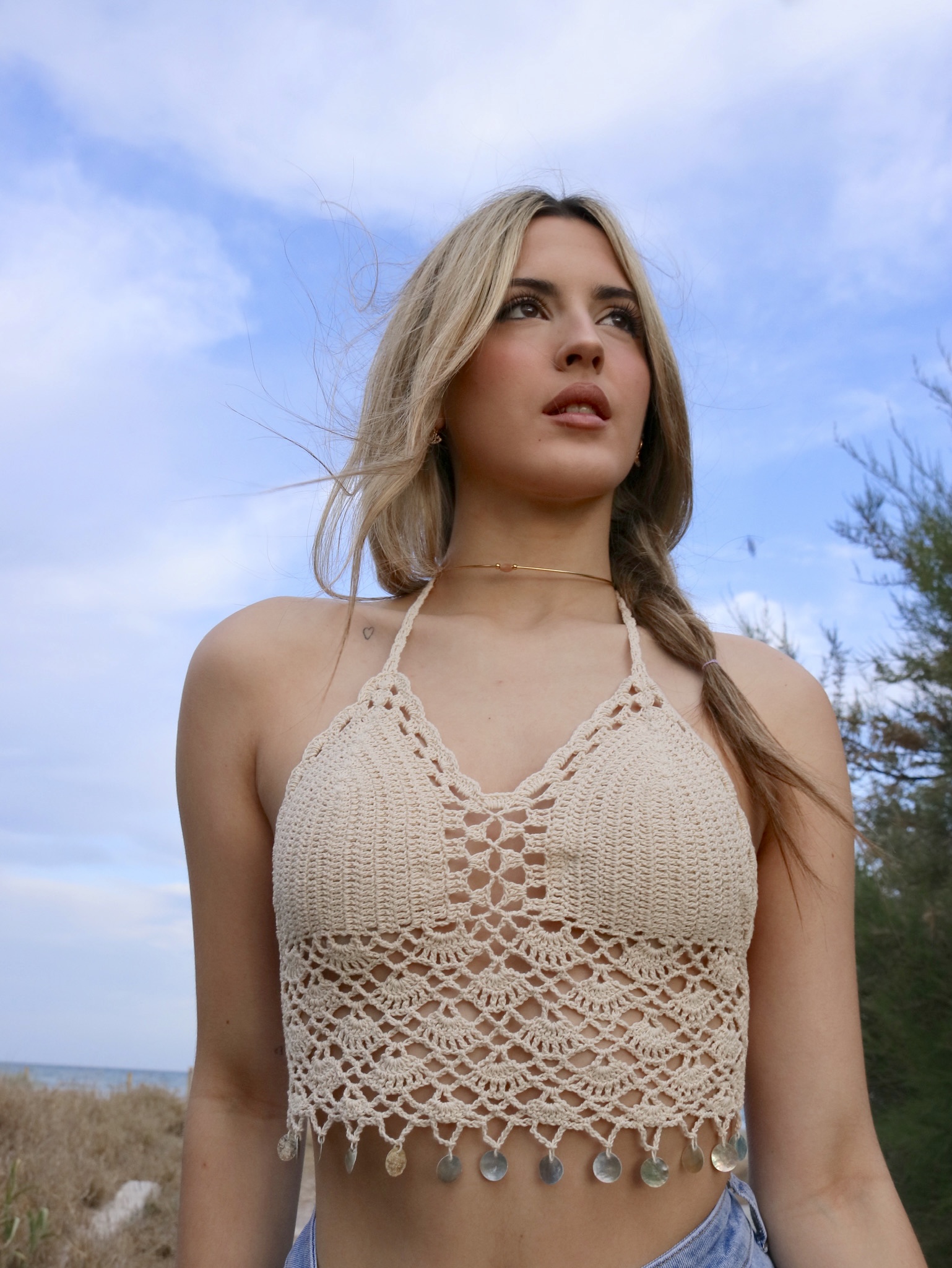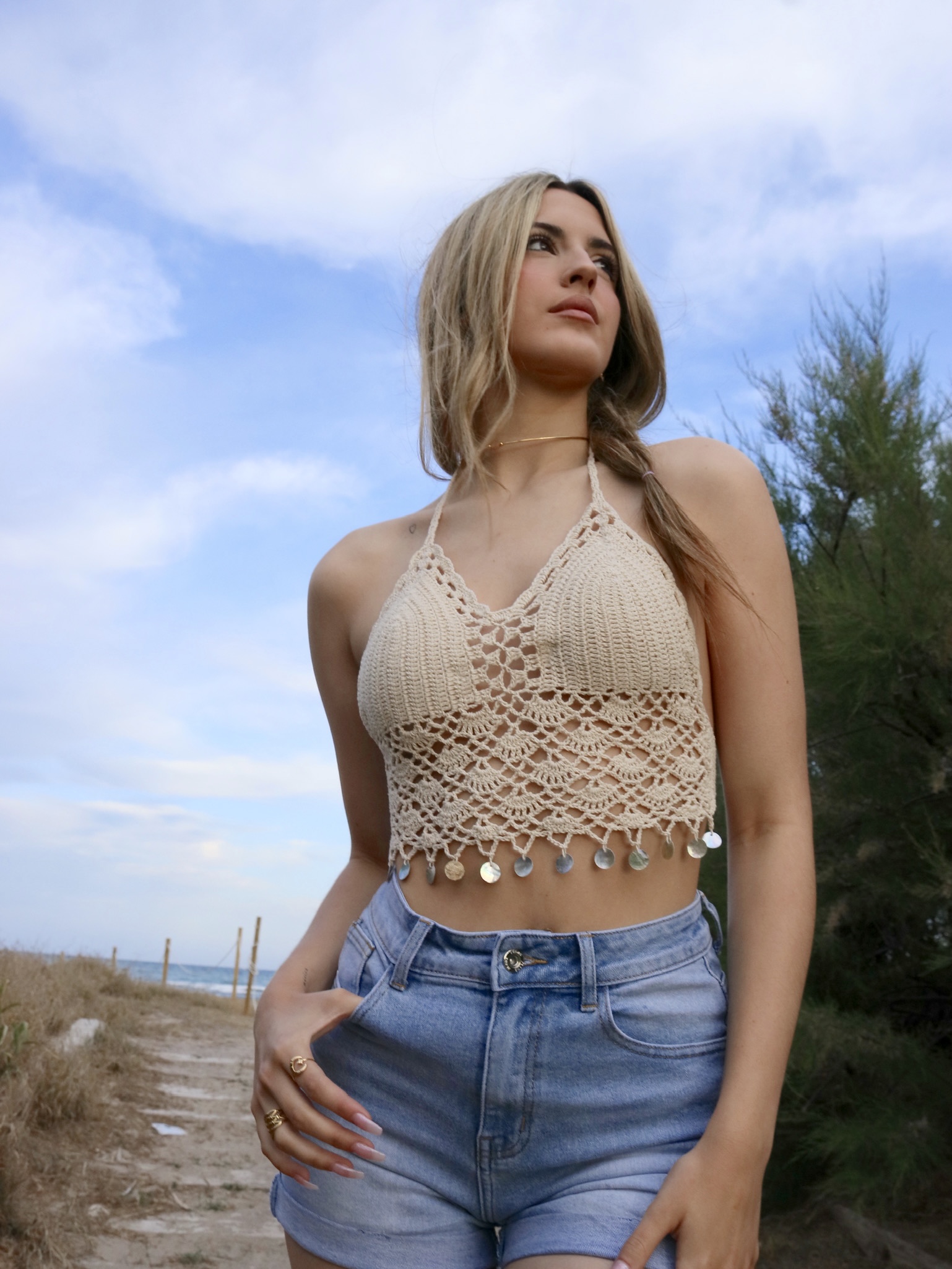 Si hay un top que no puede faltar en tu armario este verano es el top de crochet y este con toda la espalda descubierta se convertirá en tu top favorito, además las monedas le dan el toque boho que nos encanta en esta época del año.