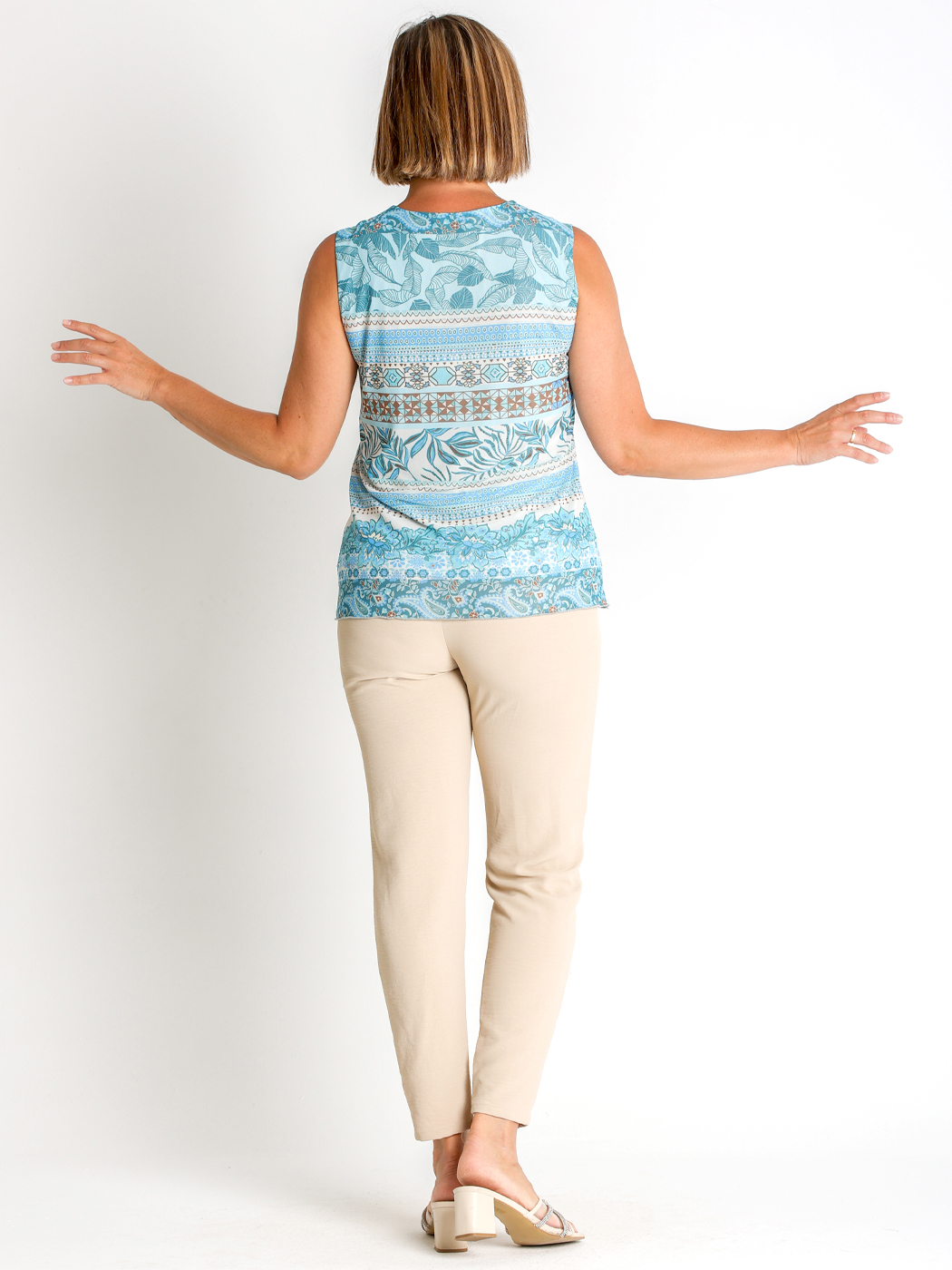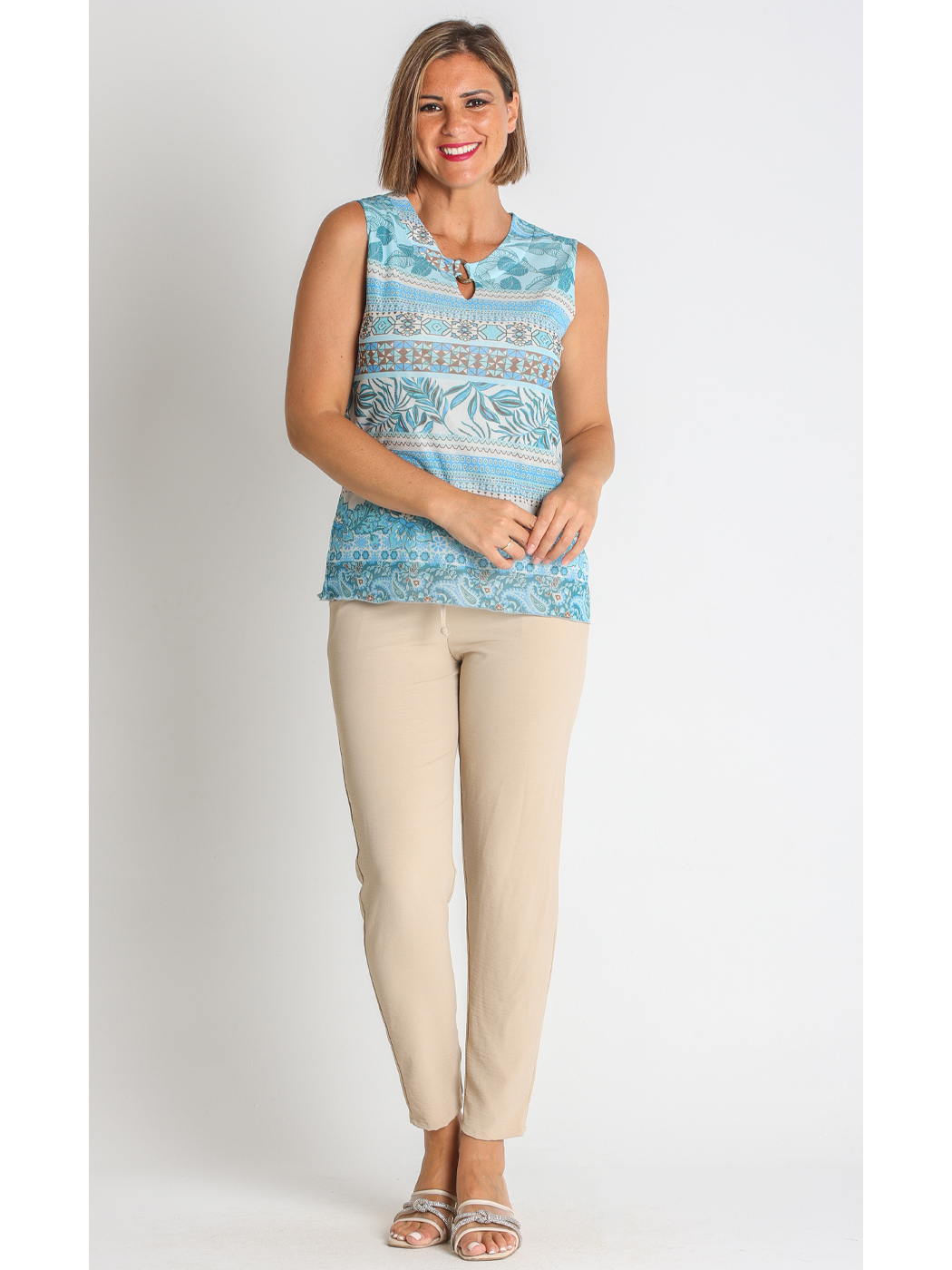 Camiseta fabricada en tul estampado; tejido fluido, elástico y muy cómodo.