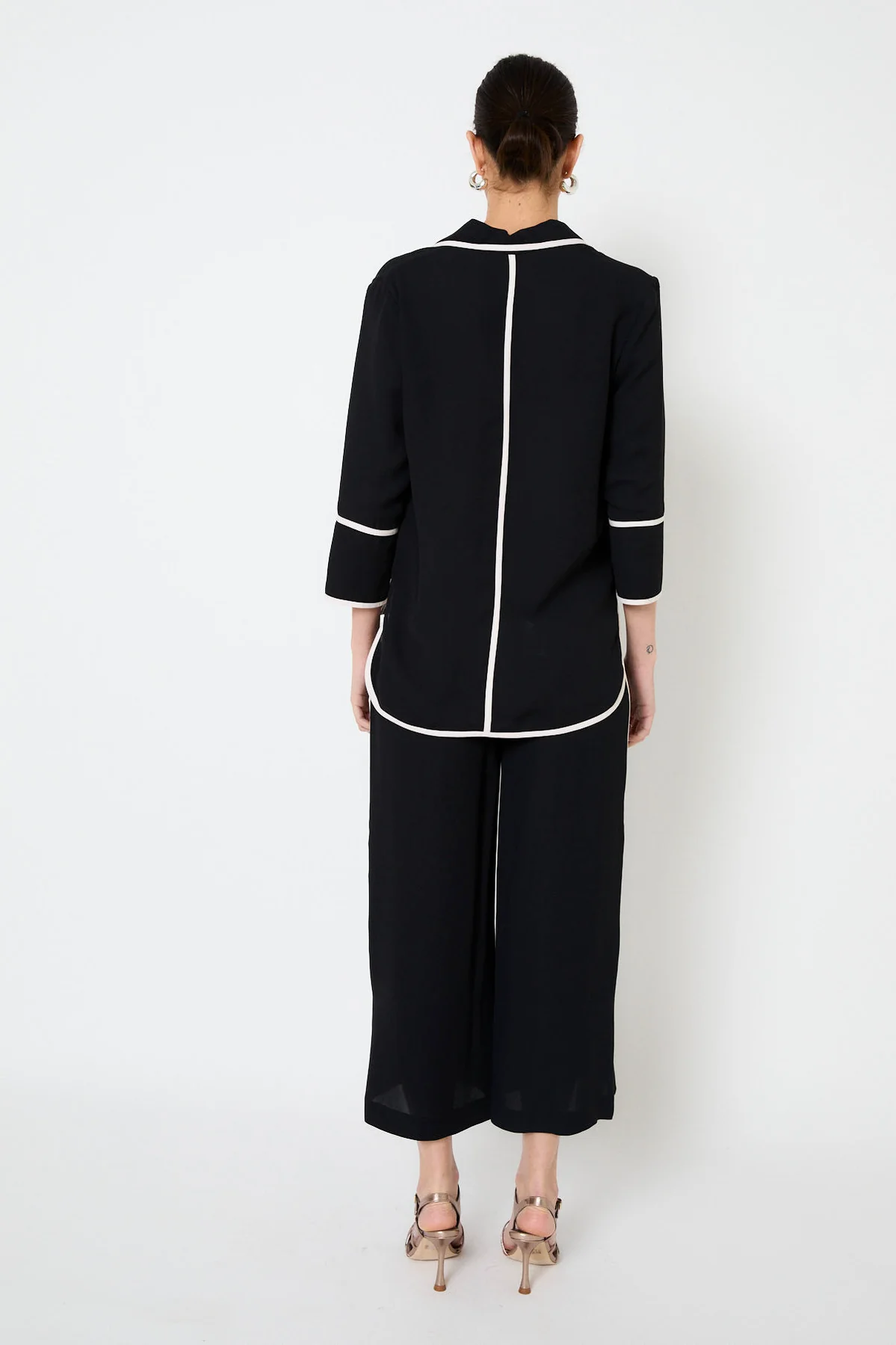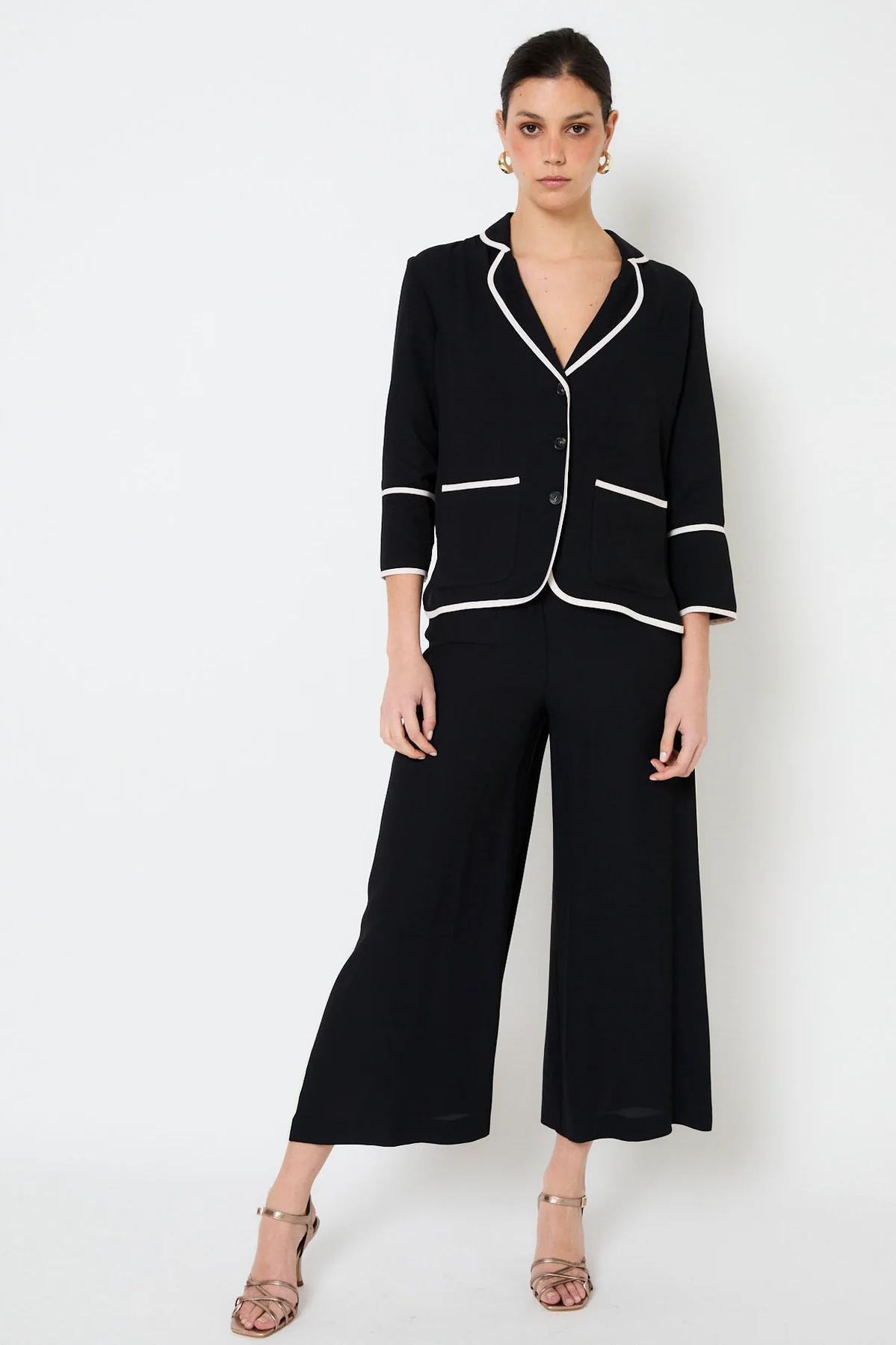 Total Look compuesto por una chaqueta y un pantalón confeccionado en color negro con ribetes blancos; Chaqueta estilo pijamero con un corte recto y cuello solapa redondeado. Se abrocha con tres botones en la parte delantera y presenta dos bolsillos de parche; y pantalón de tiro alto y pernera ancha. Se cierra en la parte delantera con botón y cremallera oculta.