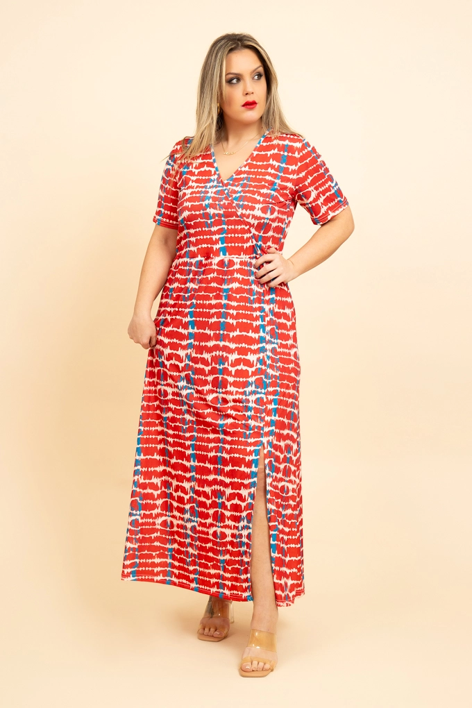 Este vestido largo estampado en talla grande es la prenda perfecta si buscas estilo, movimiento y personalidad. Su escote en V cruzado realza el pecho con elegancia, mientras que la abertura lateral en la falda aporta un toque sensual sin perder comodidad.