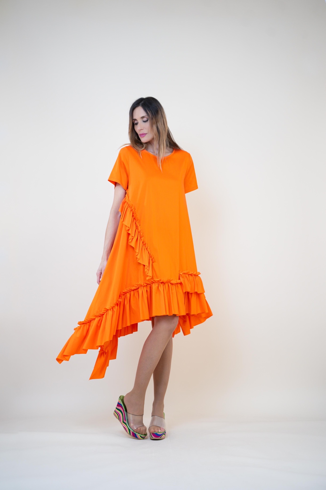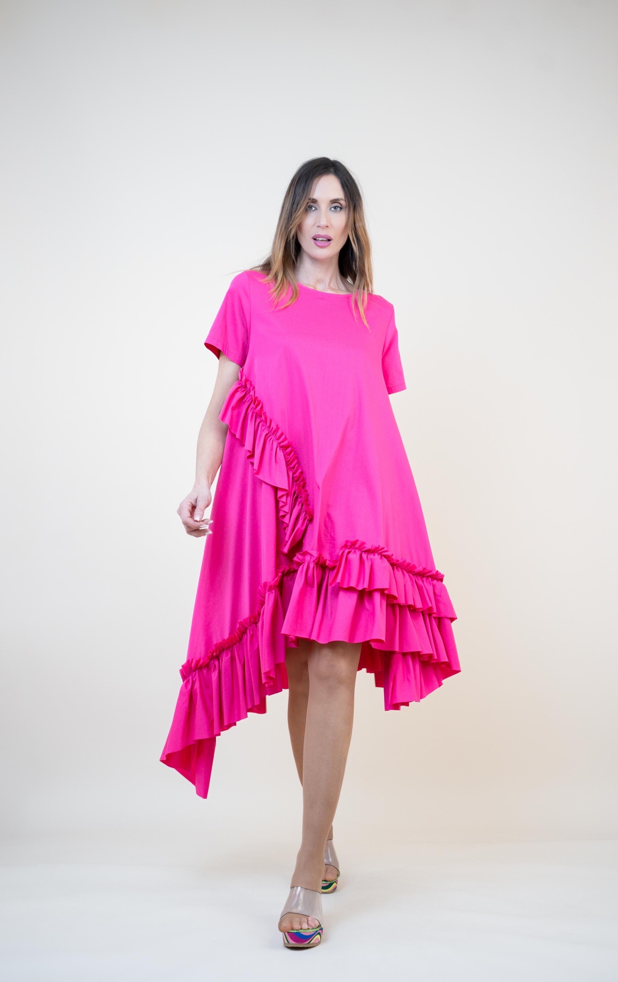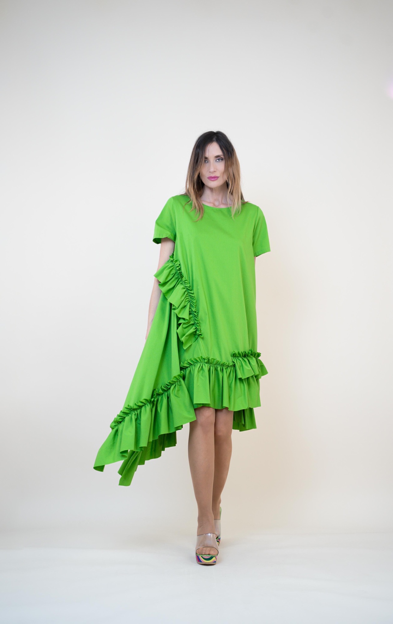 Déjate seducir por la ligereza y frescura de este vestido confeccionado en suave algodón. Su corte asimétrico y los delicados volantes crean una silueta moderna y llena de encanto. Perfecto para un look casual con un toque especial.