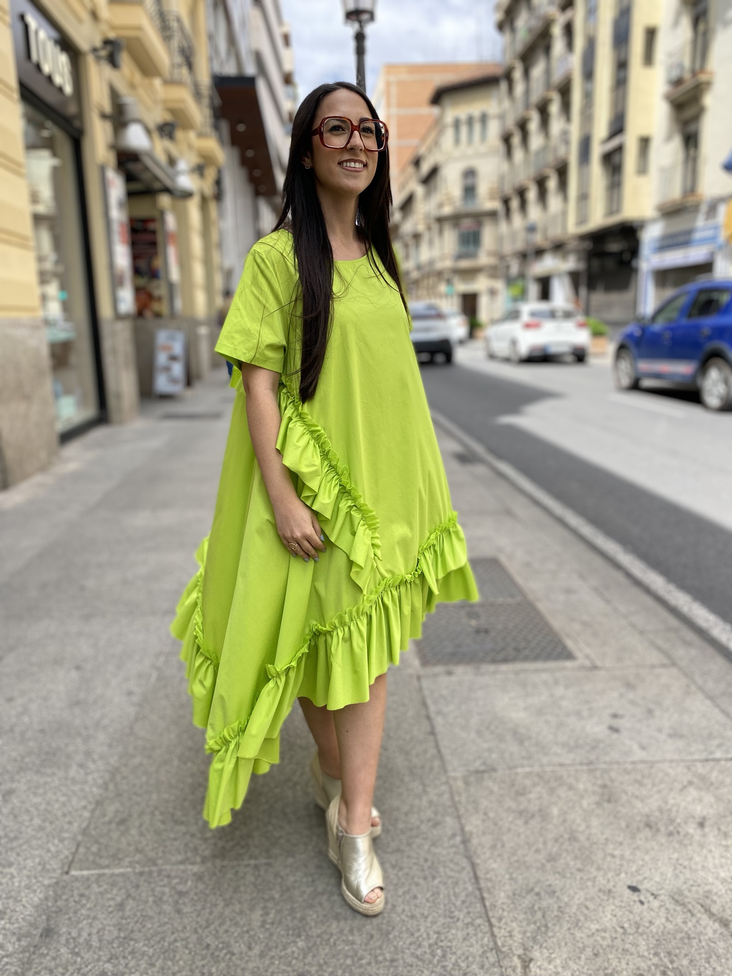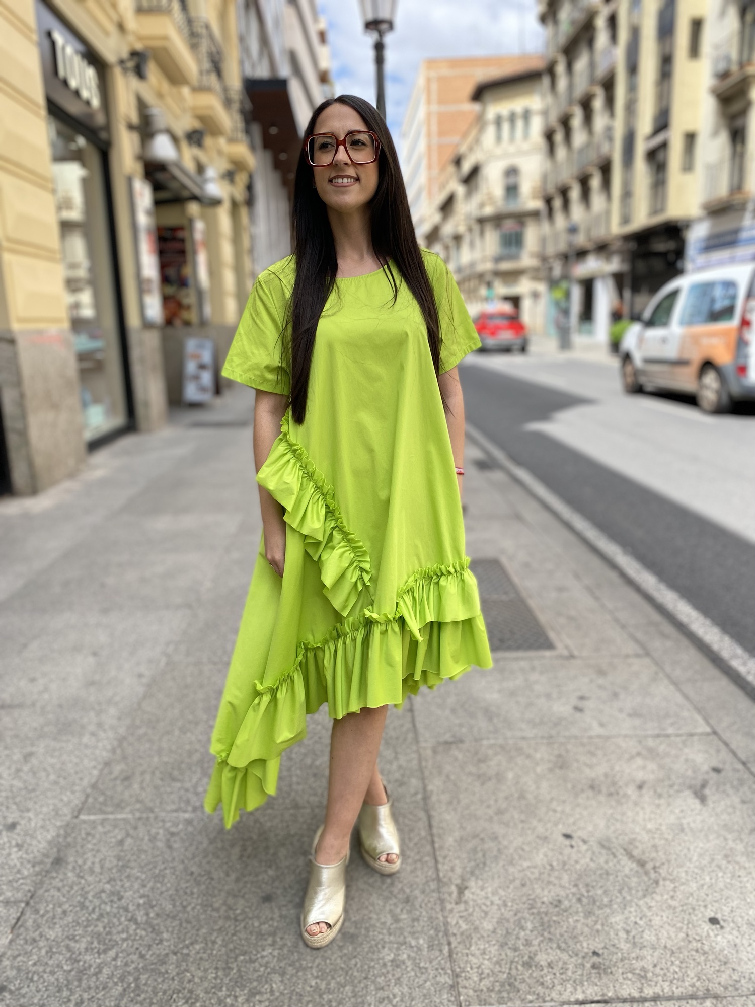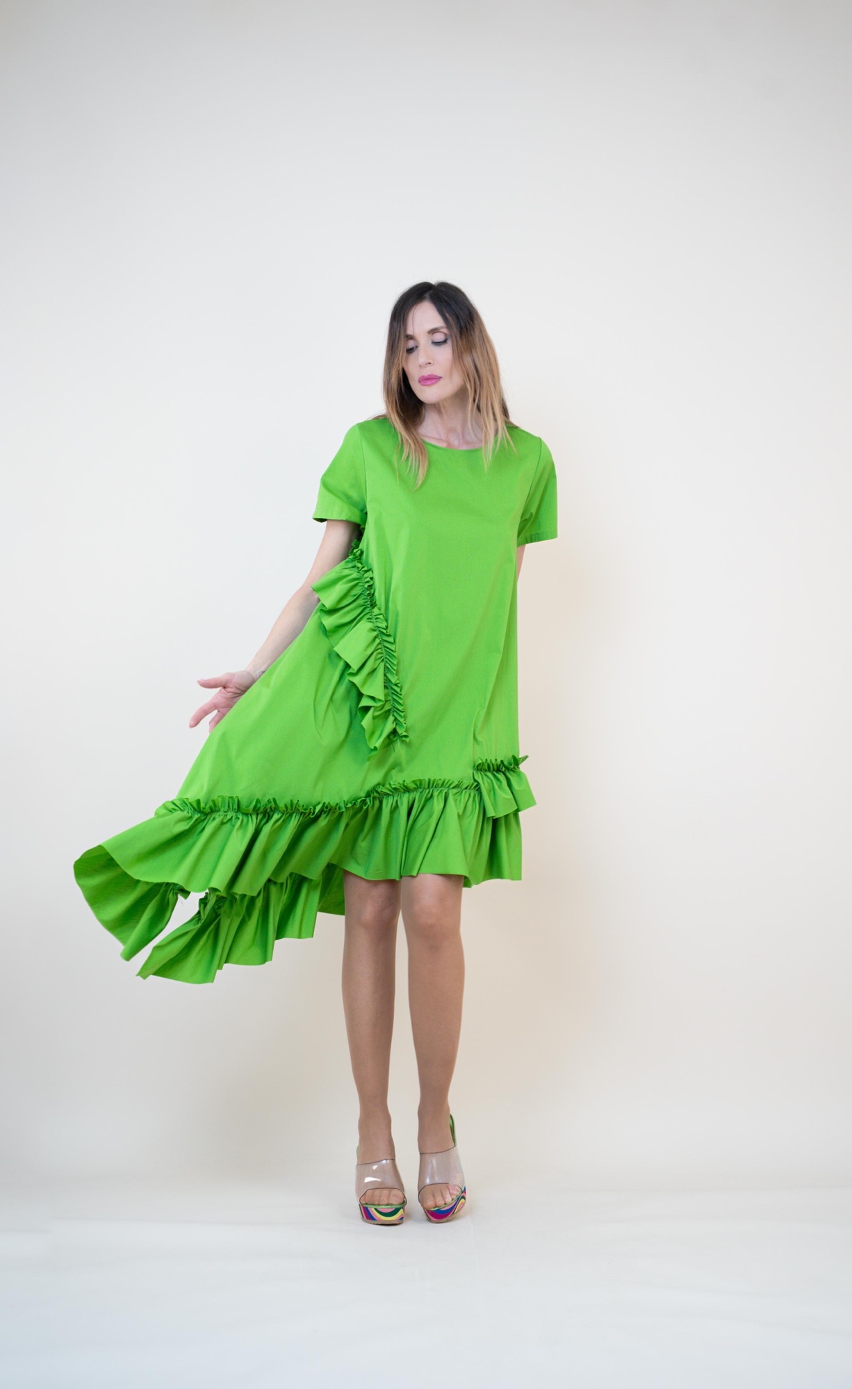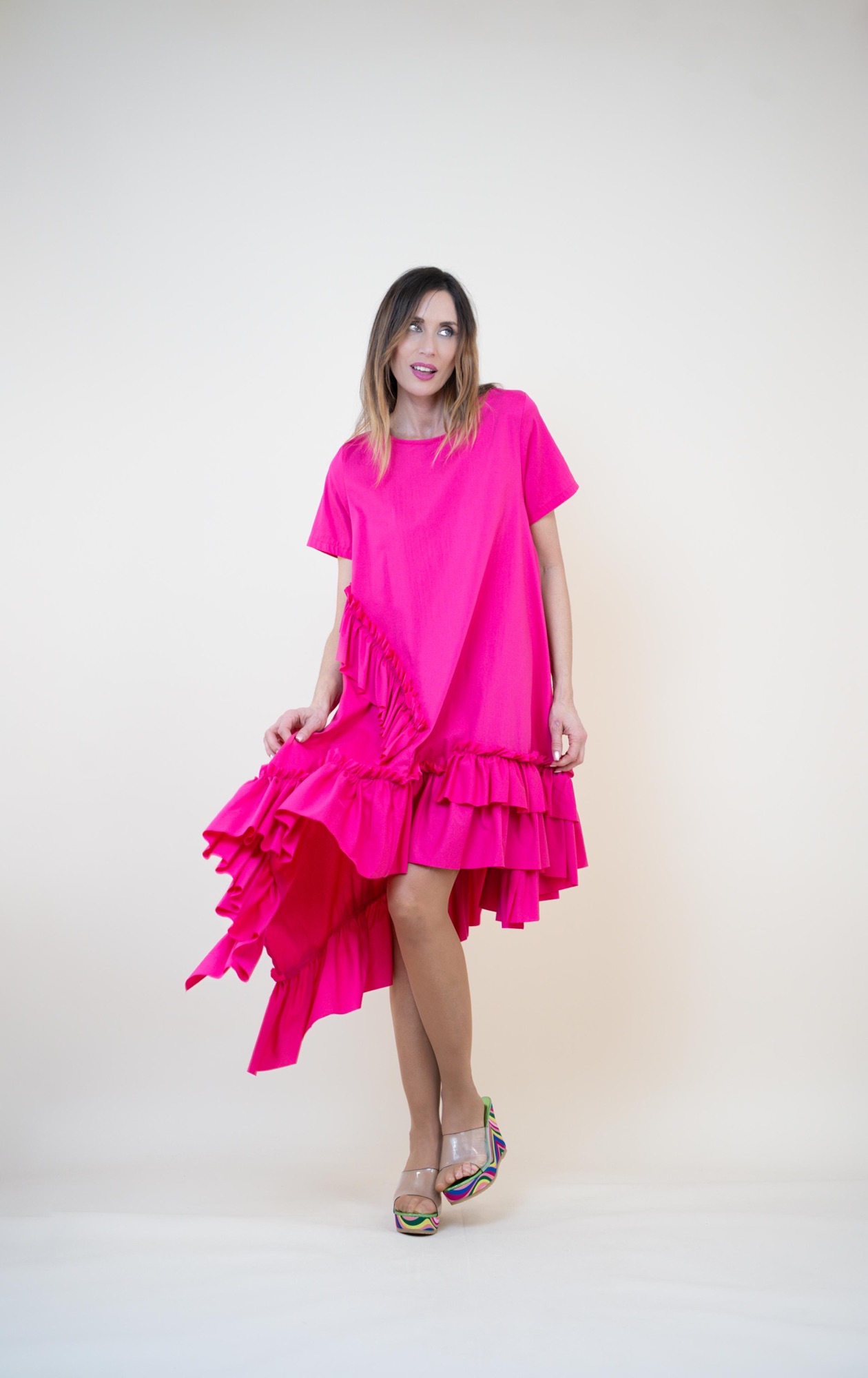 Déjate seducir por la ligereza y frescura de este vestido confeccionado en suave algodón. Su corte asimétrico y los delicados volantes crean una silueta moderna y llena de encanto. Perfecto para un look casual con un toque especial.