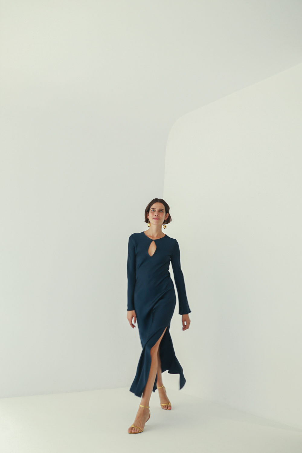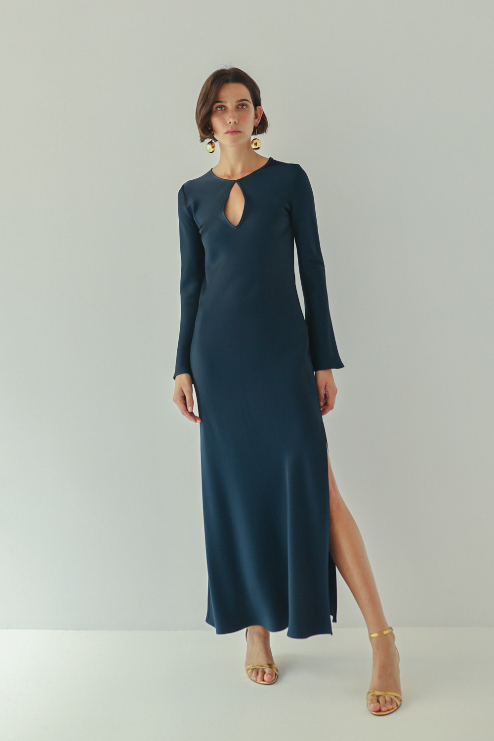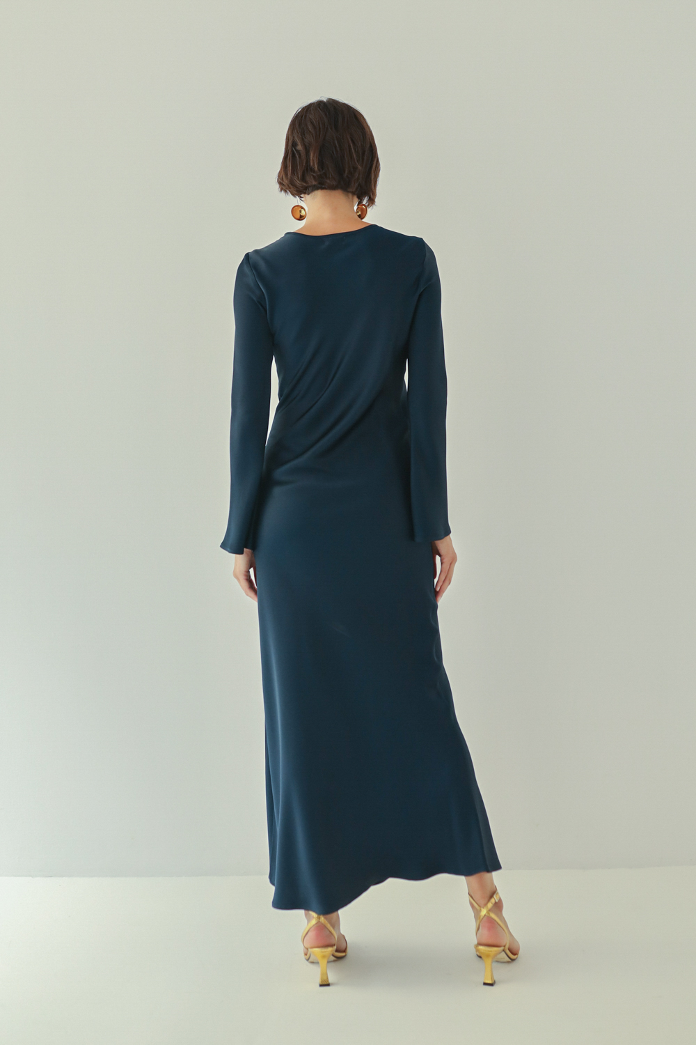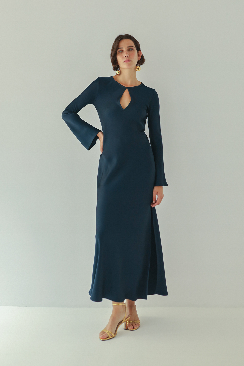Vestido exclusivo de nuestra colección. Un diseño muy elegante confeccionado en tejido de crepe satinado. Manga larga acampanada, escote en lágrima y apertura en el lateral de la falda. Talla entallado ajustado por lo que recomendamos escoger una talla más grande de la habitual.
