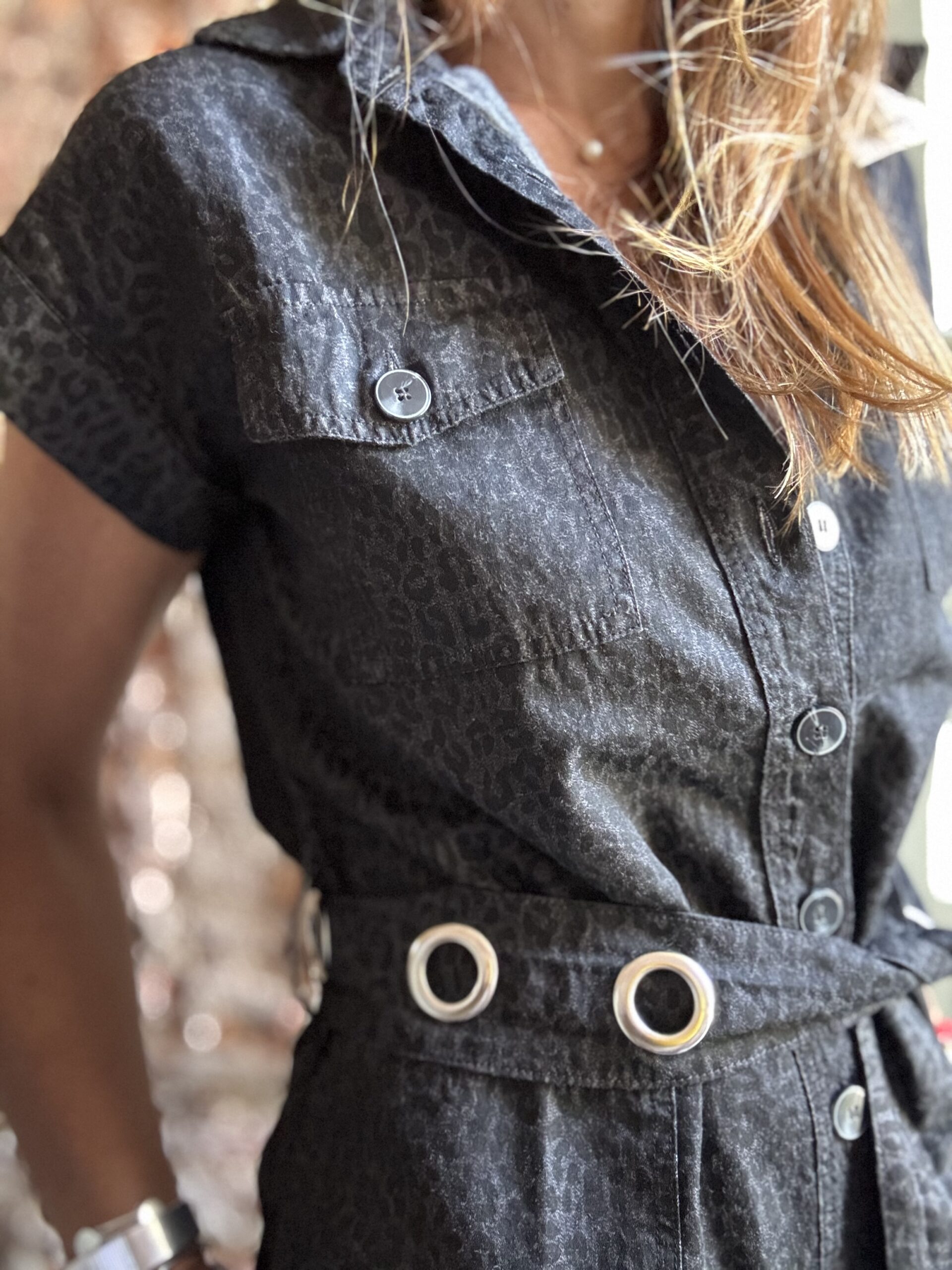 Es un vestido de mangas cortas con bolsillos laterales y botones en el frente. El género animal print gastado lo hace muy canchero y el lazo lo es todo. Tiene arandelas en acero inoxidable que como lo indica el nombre no se oxidan, permitiendo de esa forma un lavado seguro.