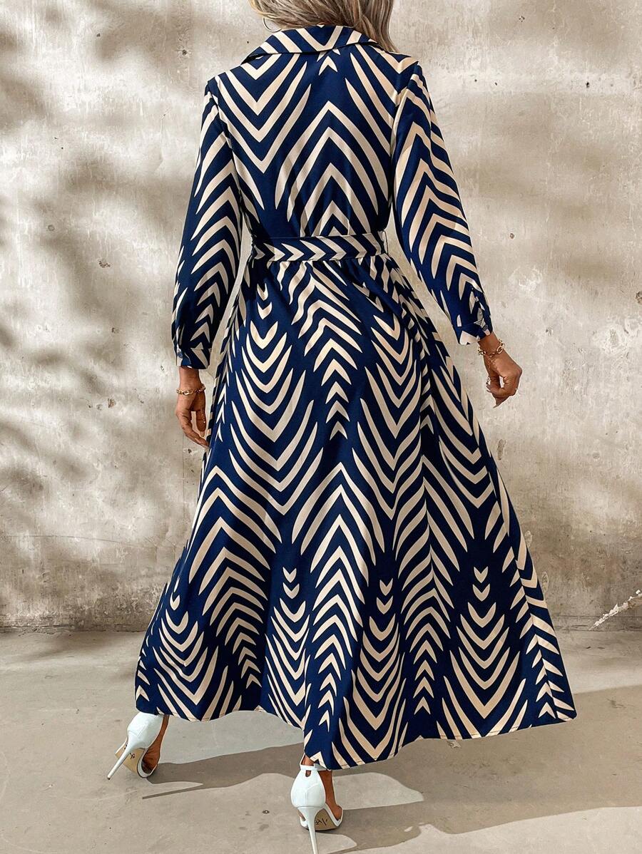 Composición: 95% Soft Poliéster (símil algodón), 5% Elastano. Este vestido camisero maxi con cinturón combina sofisticación y modernidad en un diseño impactante. Su estampado zigzag y cuello camisero le aportan un aire elegante y versátil, mientras que el talle alto estiliza la figura. Las mangas largas y la abertura en el bajo agregan fluidez y movimiento, ideal para un look casual con un toque refinado. Perfecto para lucir chic en cualquier ocasión.