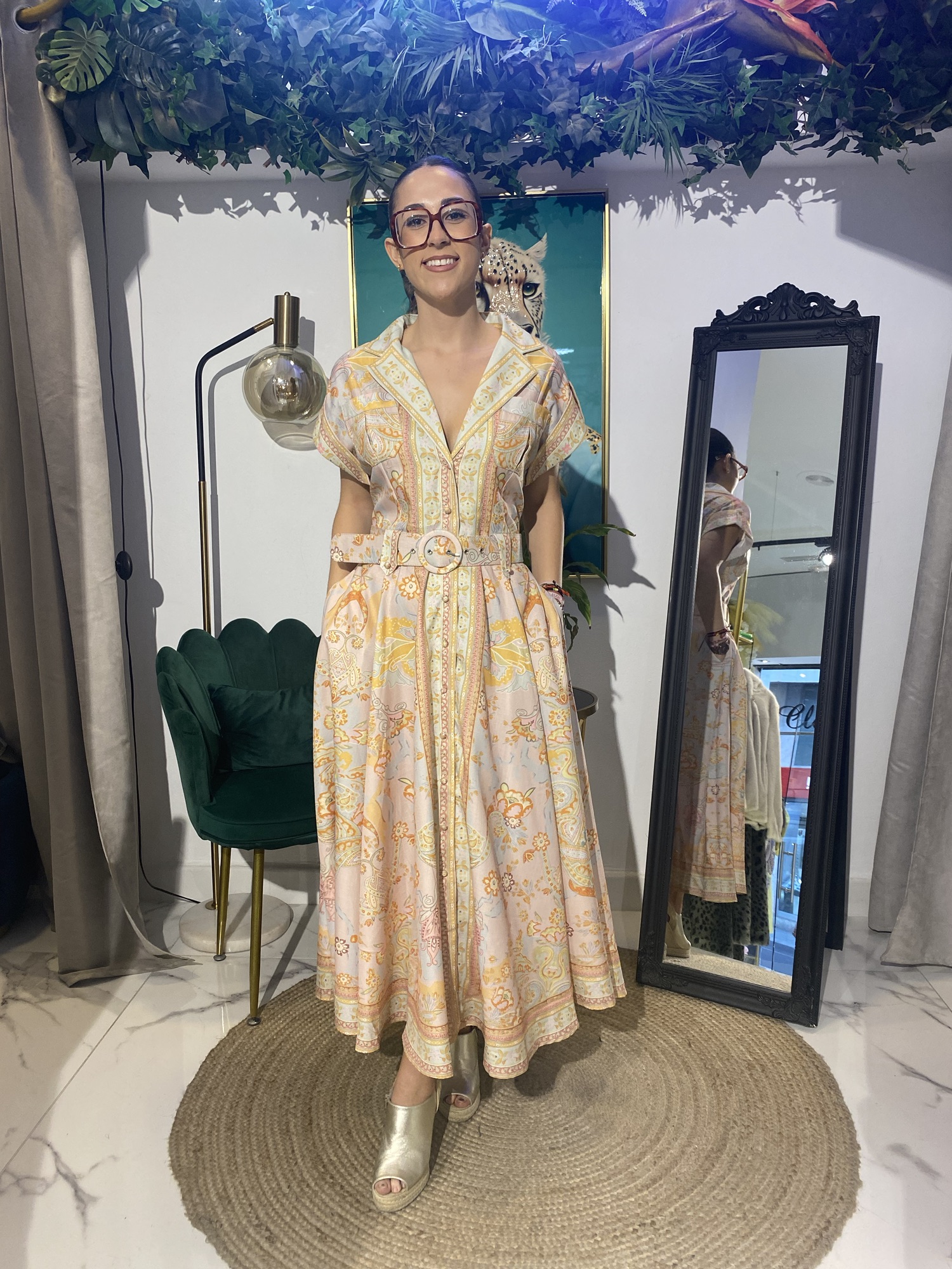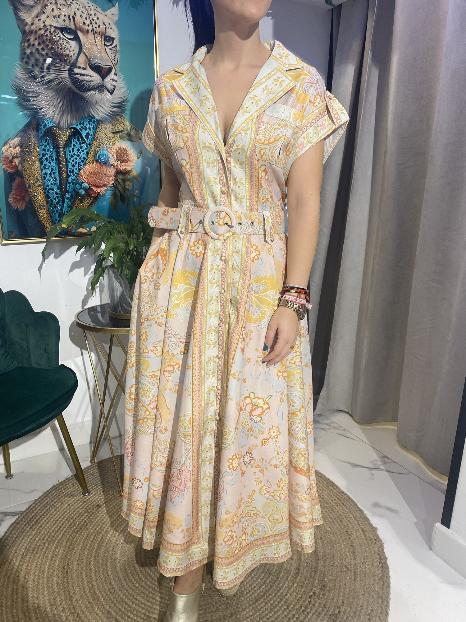 “Este vestido camisero estampado es la prenda perfecta para un look casual y chic. Su estampado vibrante y el cinturón a juego realzan la figura, mientras que el tejido ligero garantiza comodidad durante todo el día.