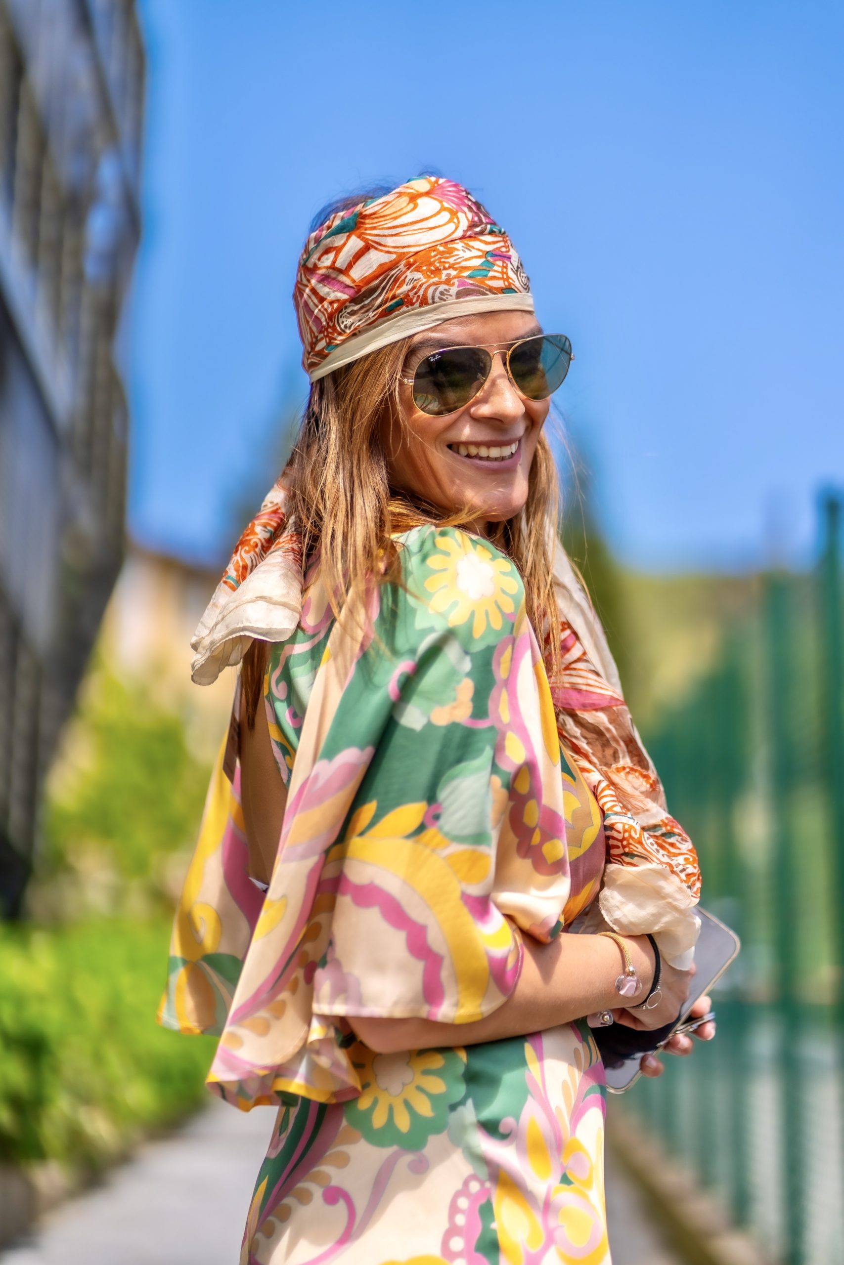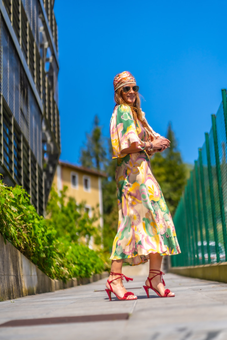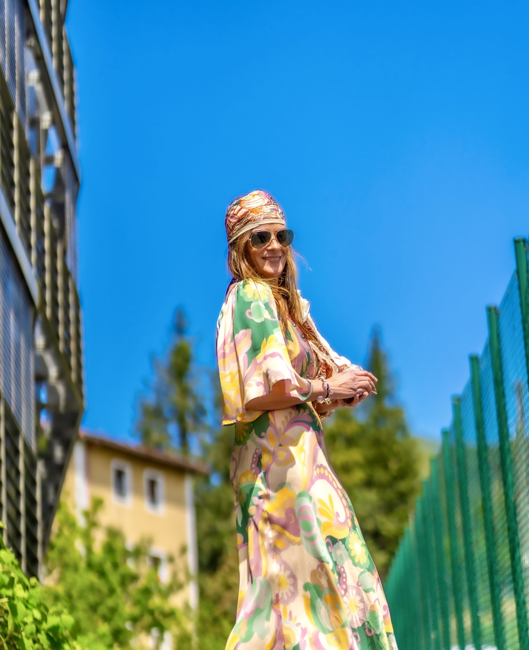 Elegante vestido largo en tejido satinado, estampado setentero y maravilloso con tonos verdes y rosas.