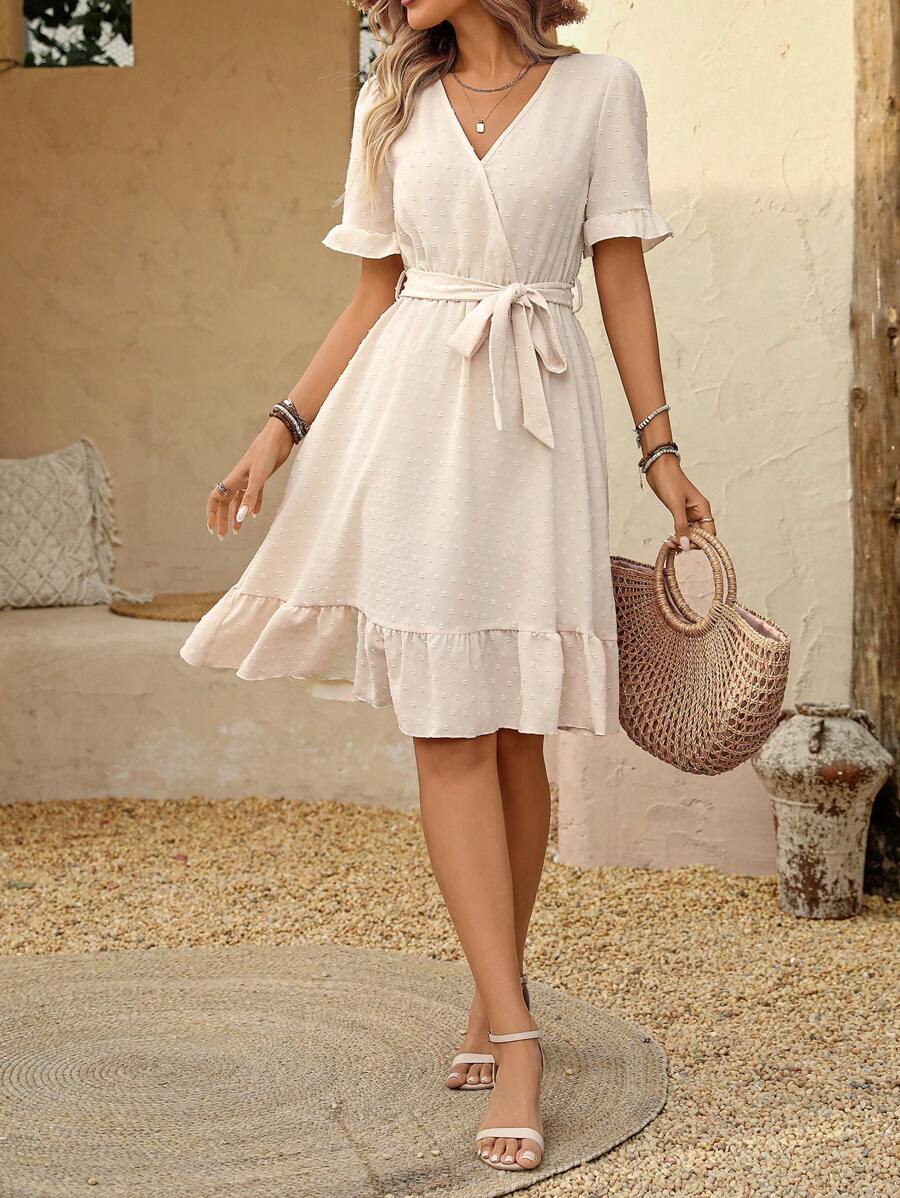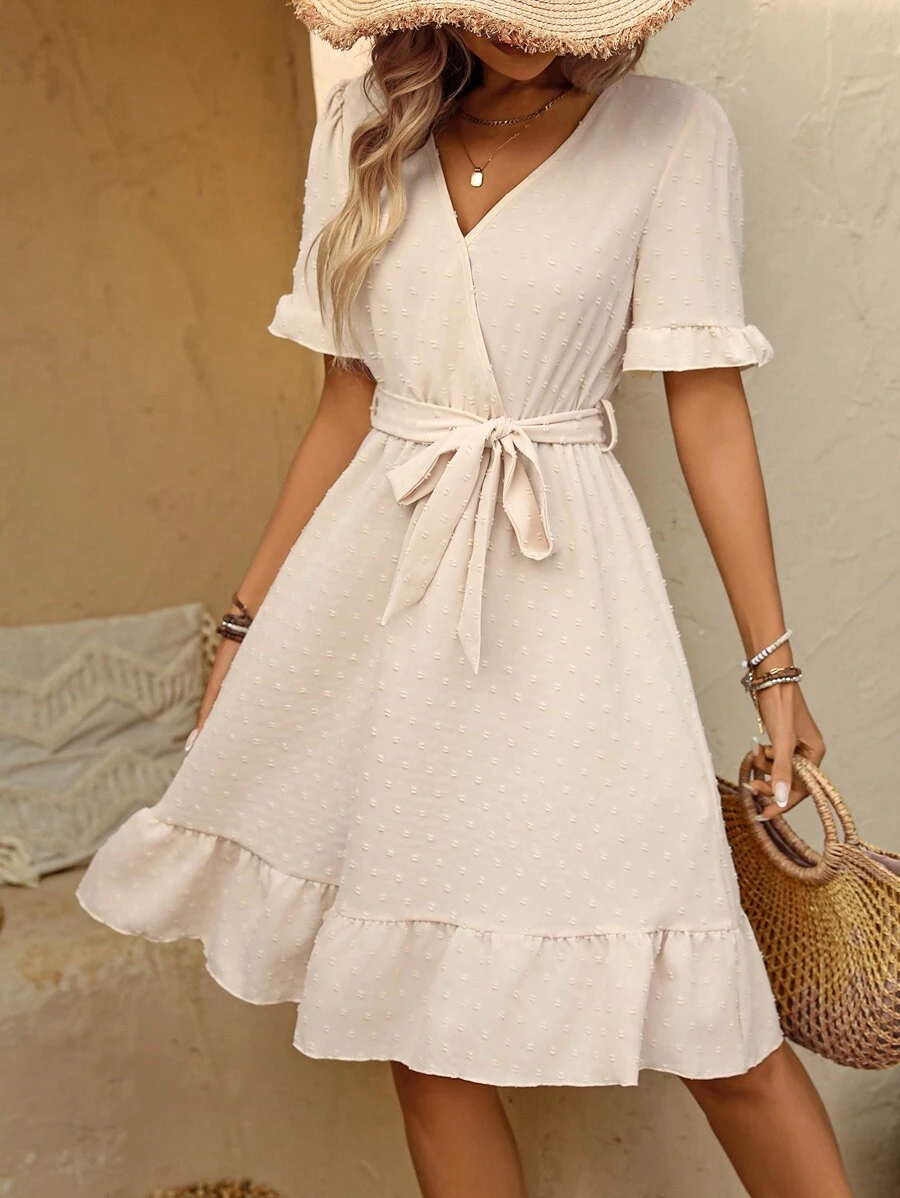 Composición: 100% softpoliéster (simil algodón). Este vestido a línea de talle alto es perfecto para un look casual y femenino, gracias a su diseño liso en color durazno chic, corte con volantes y detalles como cinturón, bajo envolvente y mangas cortas con volantes. La tela tejida, de textura suave y no elástica, ofrece comodidad y frescura, mientras que el escote en ‘v’ o pico realza la silueta. La longitud a la altura de la rodilla y el ajuste regular lo hacen ideal para el día a día. No es transparente, no lleva forro y su cuidado es muy sencillo, ya que puede lavarse en lavadora o mediante limpieza en seco profesional.
