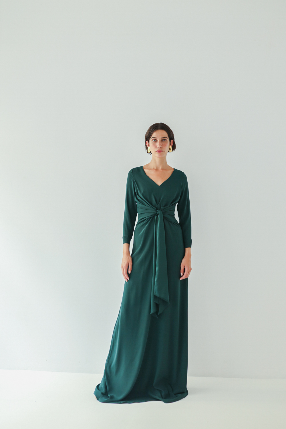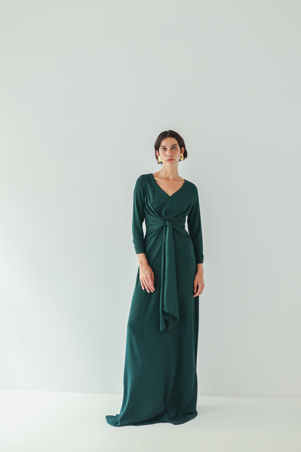 Vestido exclusivo de la colección propia By Biombo. Un diseño largo con tejido de seda natural y manga larga. El vestido va anudado a la cintura, lo que da una forma entallada en la cintura y con una caída muy elegante.