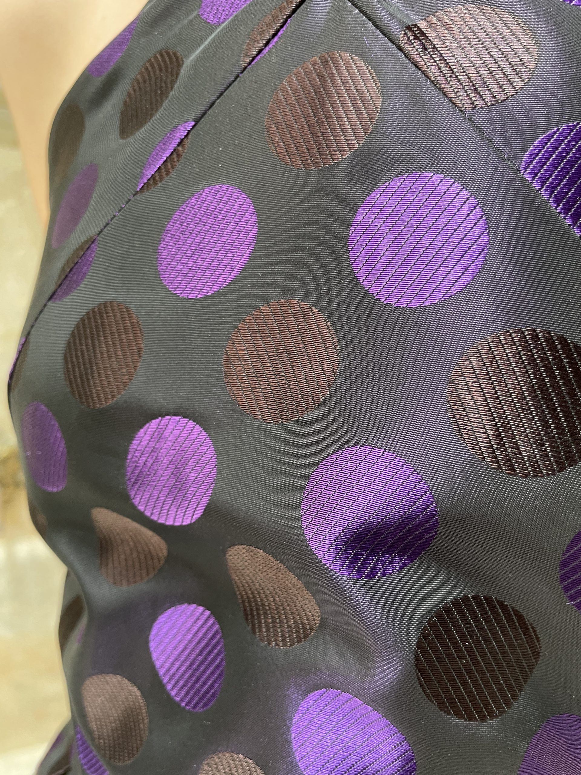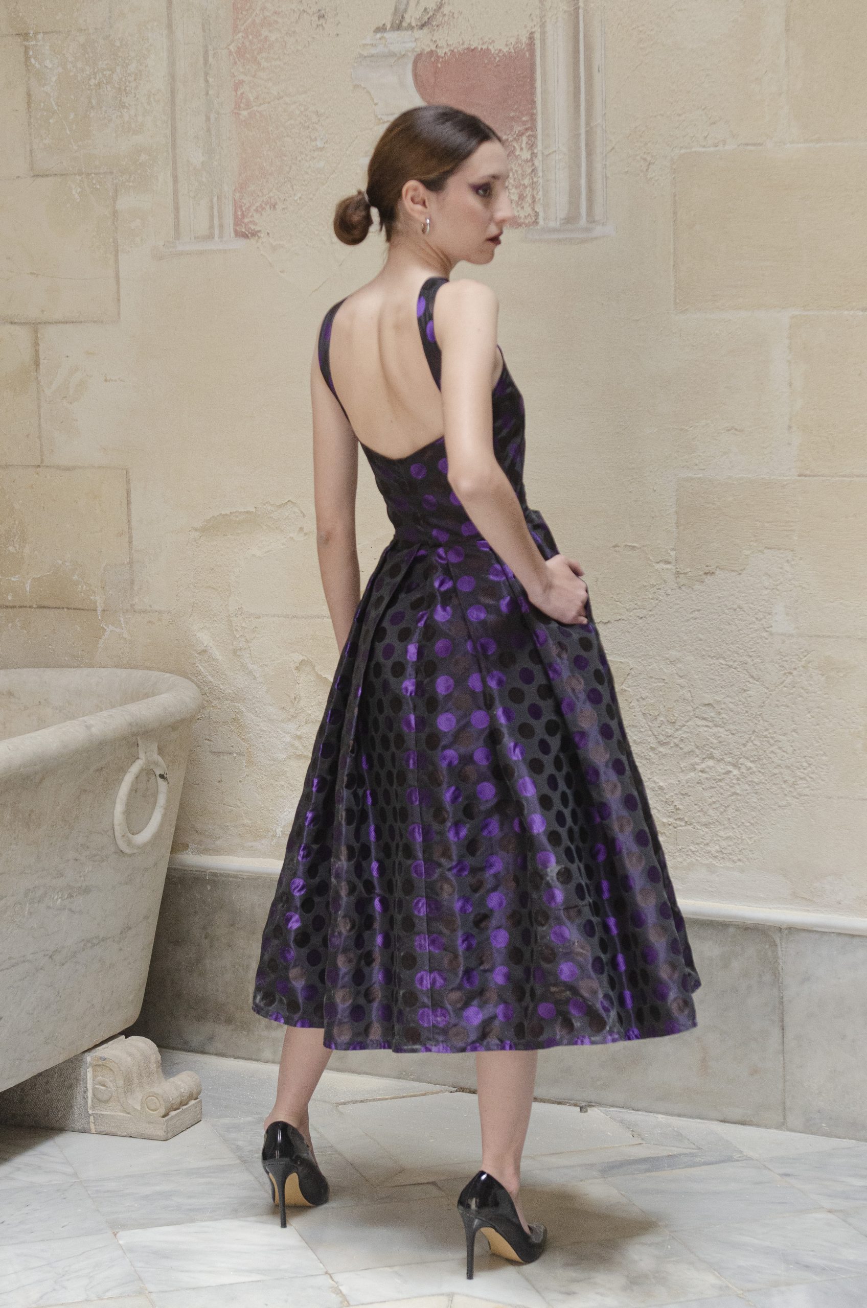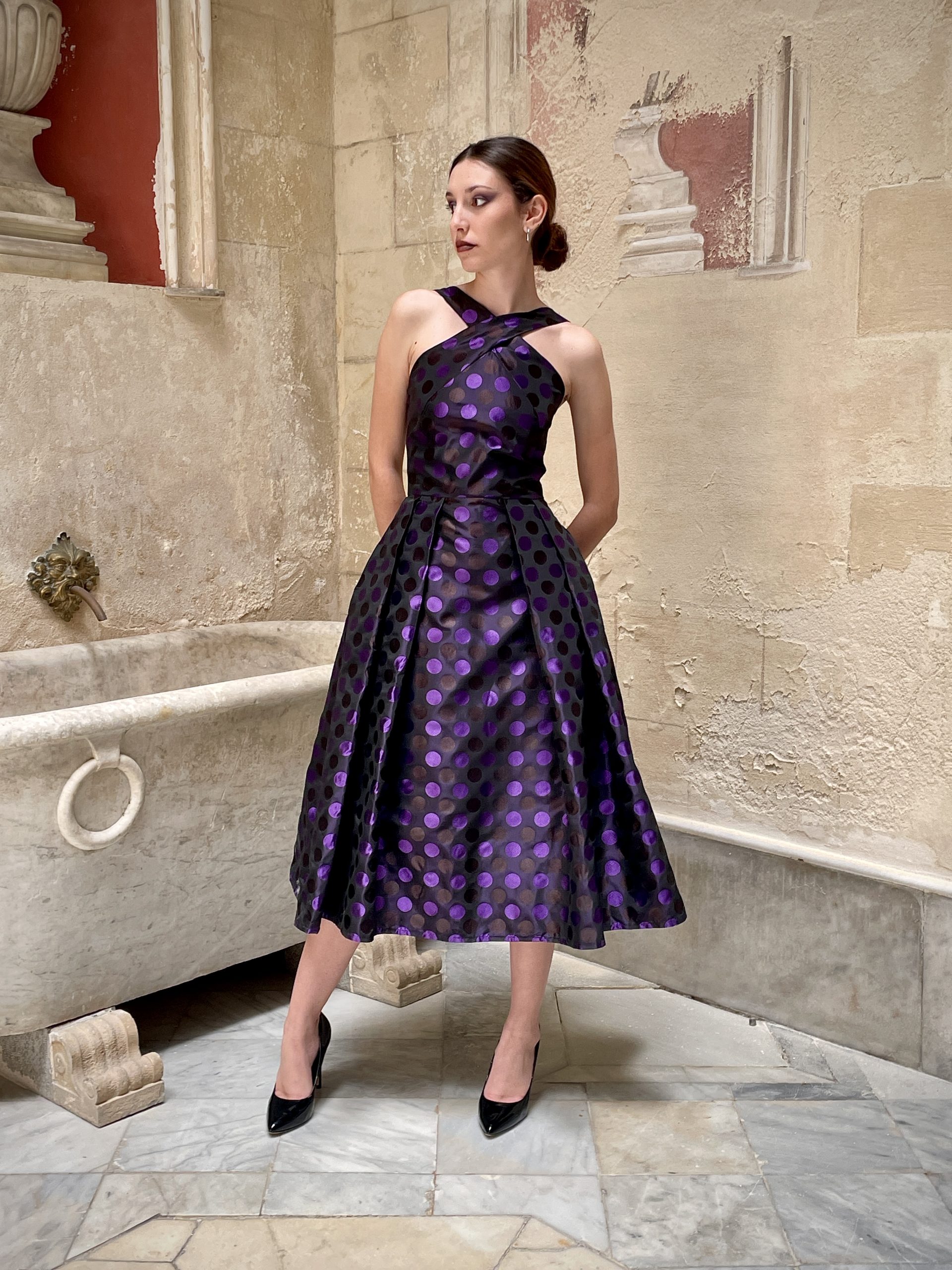 Vestido de fiesta tipo cocktail con mucho cuerpo, escote halter cruzado y espalda al aire. Largo midi, falda muy voluminosa con tablones y bolsillos invisibles en los laterales. En un tafetán precioso con lunares bordados en dos tonos, completamente forrado y con cierre de cremallera en la espalda. Su patrón es súper favorecedor. Perfecto para cualquier evento de día o de noche.