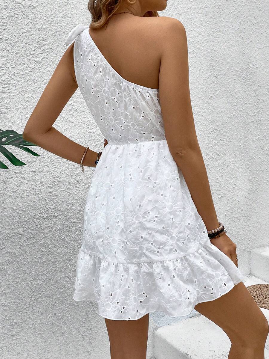 Composición: 100% Soft Poliéster (símil algodón). Este vestido corto de línea A destaca por su talle alto y corte del bajo con volantes, aportando un movimiento elegante y femenino. En tono blanco y confeccionado en tela tejida no elástica, presenta un original cuello asimétrico y un ajuste ceñido que estiliza la figura. Los detalles de bajo con volantes, nudo y bordado de ojal realzan su aire bohemio, convirtiéndolo en una opción ideal para celebraciones como el Ramadan o el Eid. Sin mangas y sin forro, resulta ligero y cómodo, mientras que su cuidado es sencillo gracias a que puede lavarse a máquina o mediante limpieza en seco profesional.