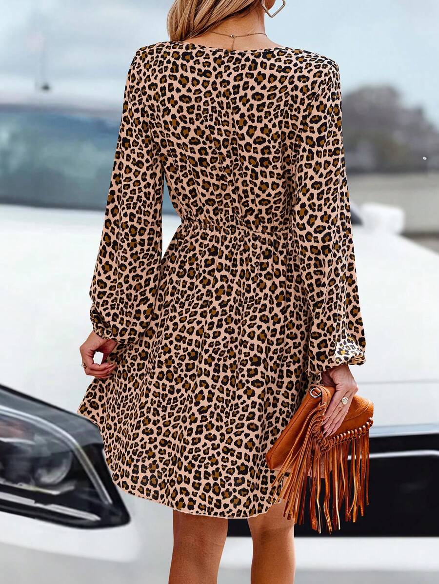 Confeccionado en 100% viscosa, este vestido de tela tejida sin elasticidad ofrece una caída ligera y fresca, ideal para un estilo relajado. Su diseño luce un elegante color caqui, realzado por un estampado de leopardo, estampado integral y estampado en textura, que aportan un aire moderno y desenfadado. Presenta un escote en cuello en ‘v’ o pico, manga larga de tipo obispo, línea A, talle alto, corte del bajo tipo campana, acompañado de detalle de volante fruncido, bajo con volante y fruncido, logrando una silueta femenina y dinámica. Tiene un ajuste regular, longitud corta y sin almohadillas en el sujetador. La prenda no tiene forro, no está forrada para aportar calidez y no es transparente. Puede cuidarse mediante lavado en lavadora o limpieza en seco profesional.