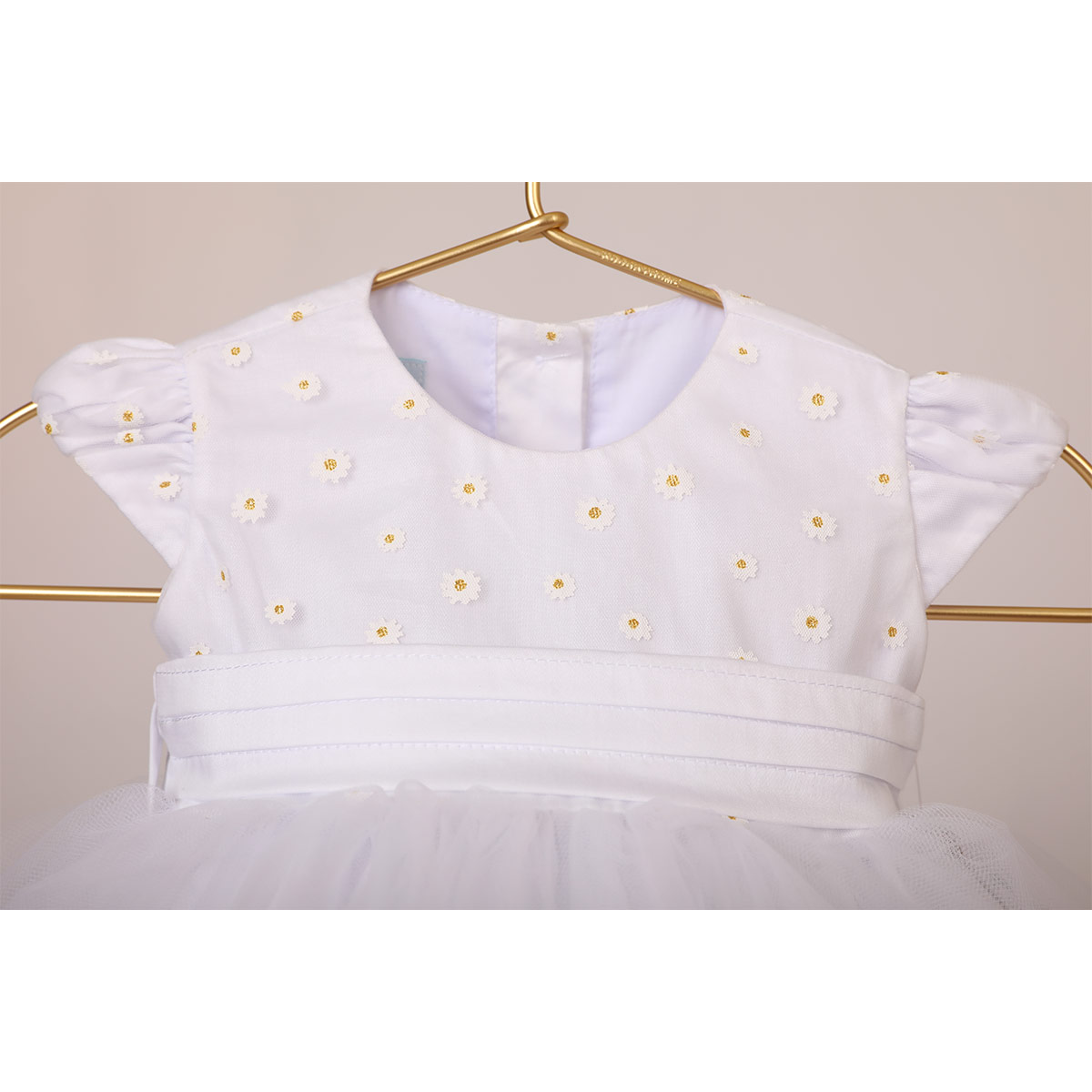 Vestido en tono blanco con tul de girasoles en el pecho y festones.