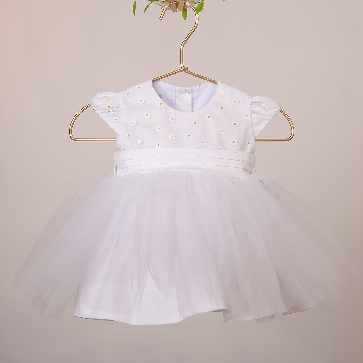 Vestido bautizo en tono blanco con tul de girasoles en el pecho y festones. Confeccionado en tela 100% algodon.