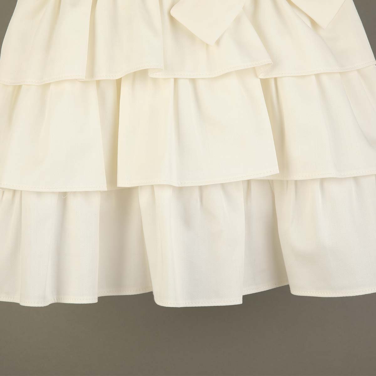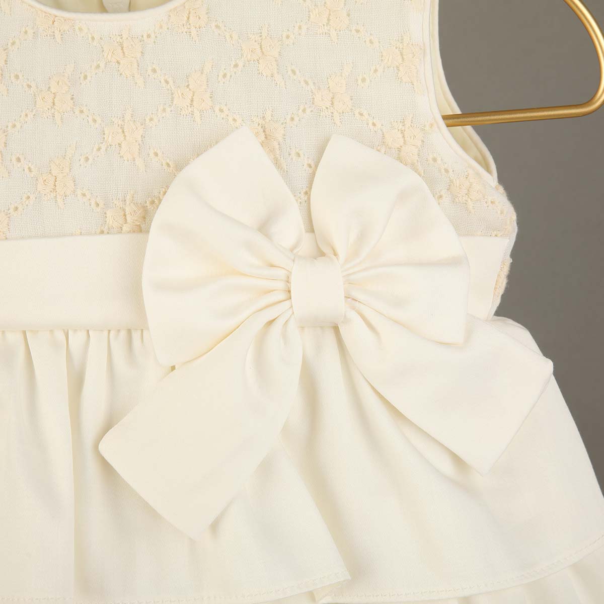 Vestido bautizo en tono beige con vuelos y detalle de lazo en la cintura. Confeccionado en tela 100% algodon.