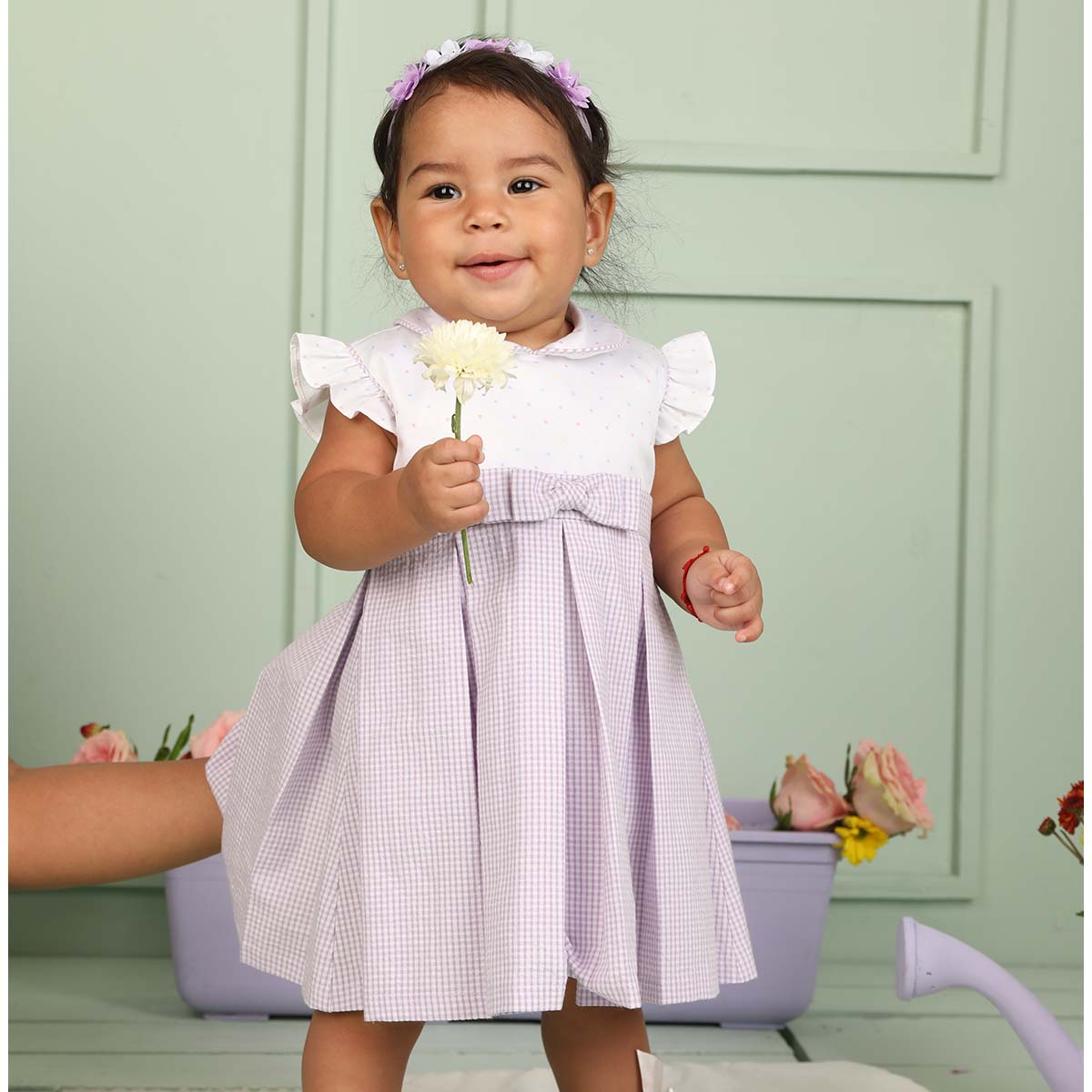 Vestido en tono blanco con cuadros lilas detalle de lazo en cintura