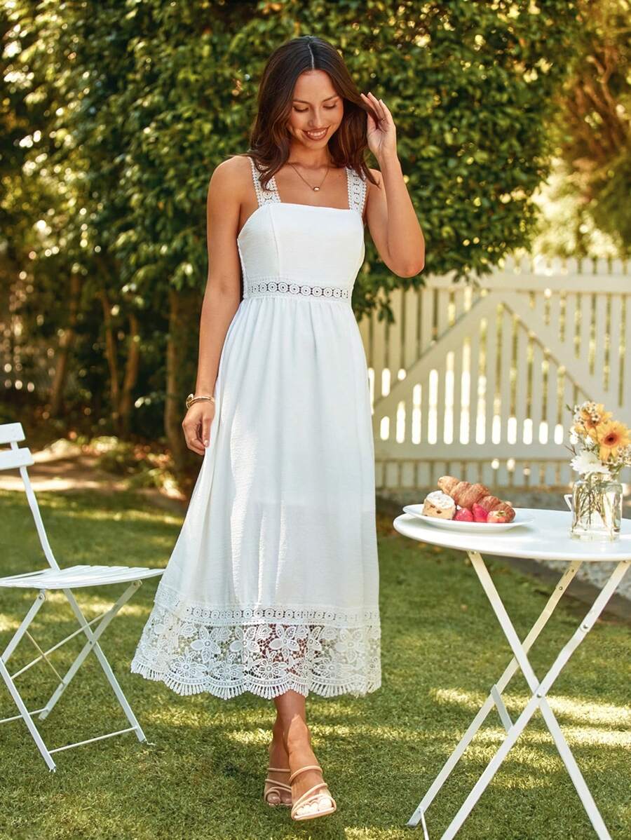 Composición: 97% Soft Poliéster (símil algodón), 3% Elastano. Este vestido maxi de tirantes es la definición de frescura y elegancia. Su delicado encaje en contraste y la espalda al aire le dan un toque romántico, mientras que el talle alto y el corte campana realzan la silueta con fluidez. Confeccionado en una tela ligera y elástica, ofrece comodidad y movimiento sin perder sofisticación. Perfecto para lucir radiante en días soleados o eventos especiales.