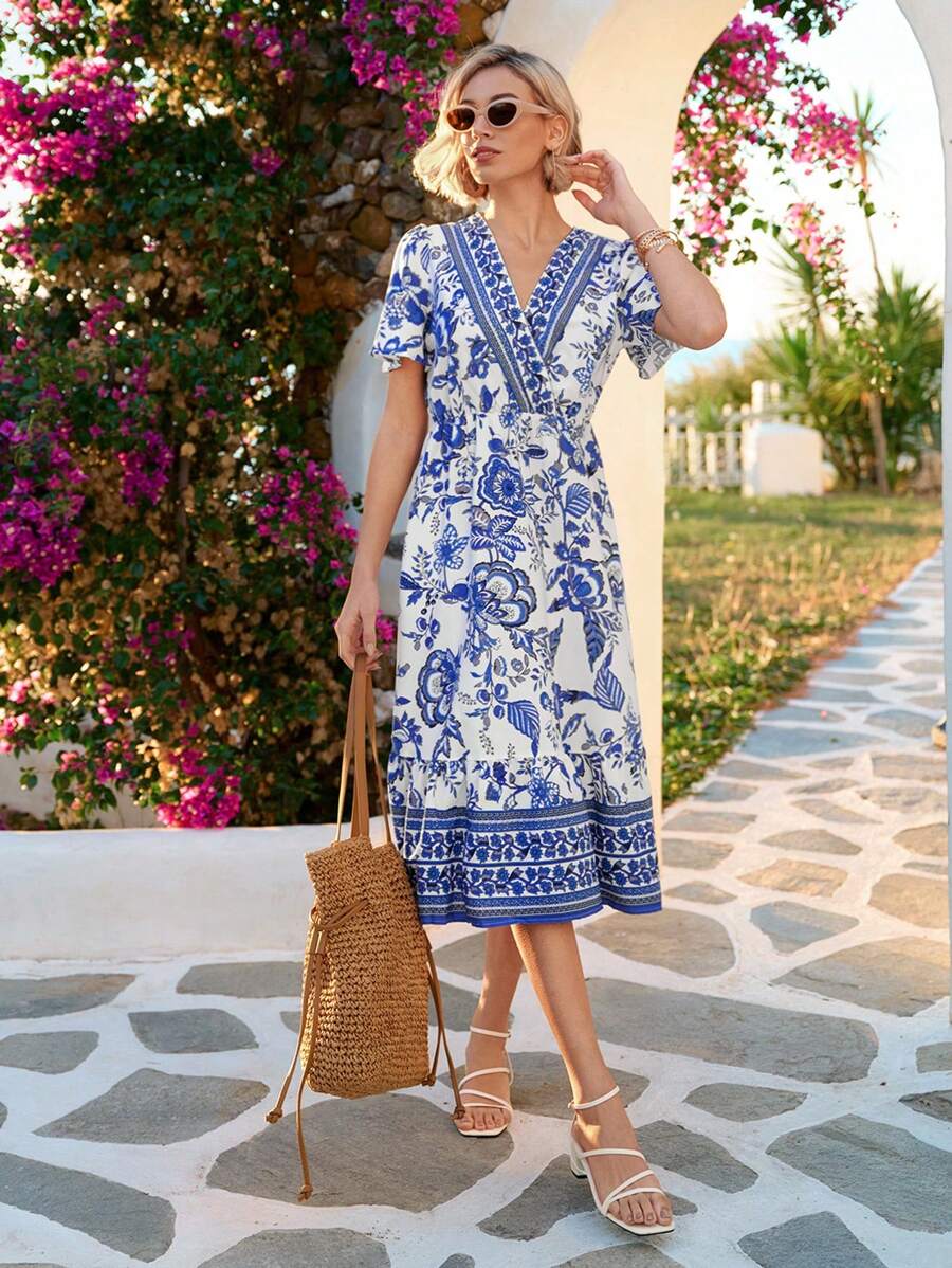 Composición: 95% soft poliéster (símil algodón), 5% elastano. Este vestido midi en azul y blanco exhibe un corte a línea con talle alto que realza la figura, y un escote en ‘v’ o pico que aporta un toque bohemio y moderno. Sus mangas cortas con volantes suman movimiento y frescura, mientras que el bajo recto con detalles envolventes y aberturas le confiere un estilo distintivo y atractivo. El estampado integral floral combina la elegancia con un aire juvenil y vibrante. Está confeccionado en tela tejida no elástica, sin forro, ideal para temporadas de clima templado. Su cuidado es sencillo con lavado a máquina o limpieza en seco profesional, evitando blanqueadores para preservar la suavidad y los colores vivos de la tela.
