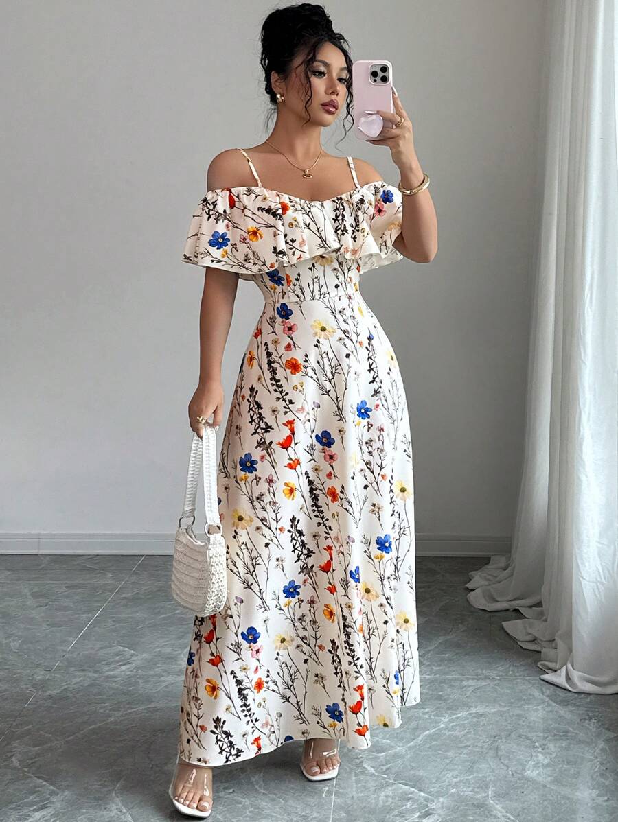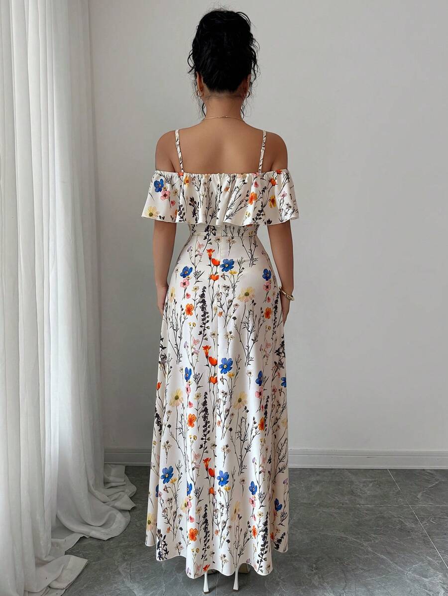 Composición: 95% Soft Poliéster (símil algodón), 5% Elastano. Este vestido largo tipo “A línea” combina elegancia y feminidad con un diseño de inspiración floral. Confeccionado en tela tejida no elástica, presenta un talle alto que define la silueta y un corte campana que aporta un movimiento fluido. Los tirantes finos y los hombros descubiertos realzan el escote, mientras que los delicados volantes y la abertura alta en el bajo añaden un toque sofisticado y sensual. El estampado de plantas en tonos multicolor le da un aire fresco y natural, ideal para ocasiones especiales. Se recomienda lavar a máquina con detergente suave, evitando la limpieza en seco.