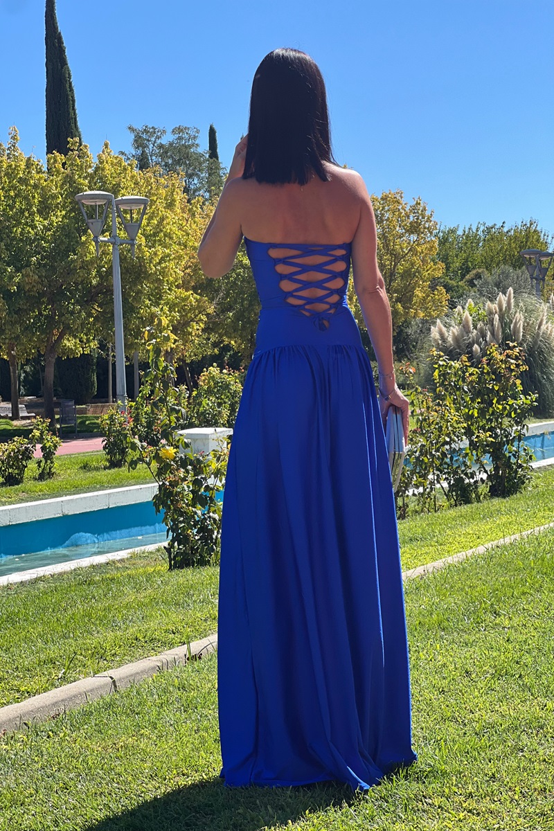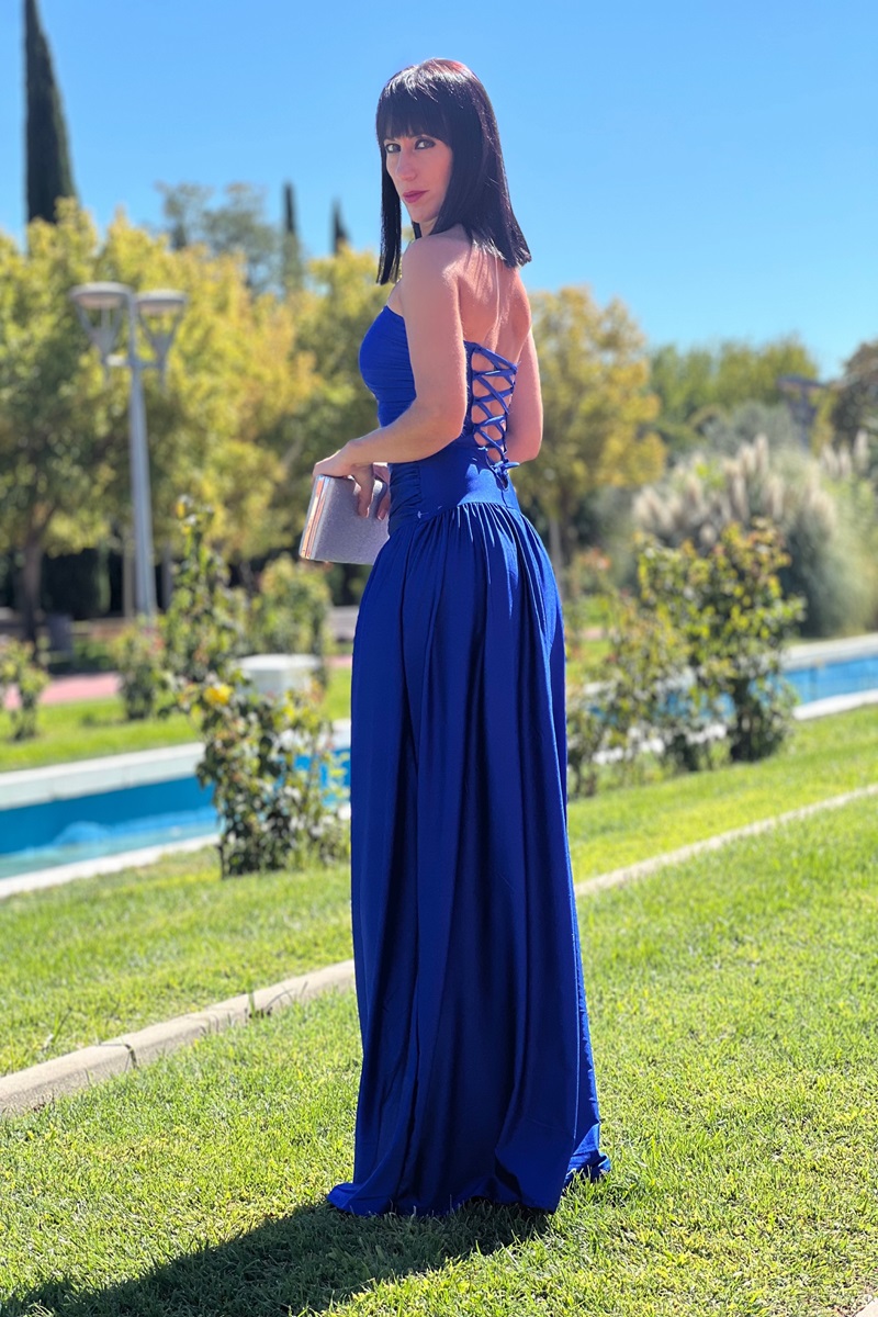 En la parte posterior, el atado entrecruzado no solo añade un detalle visual encantador, sino que también permite un ajuste personalizado, asegurando comodidad y estilo. La falda fluye con gracia, complementando el diseño general del vestido. Este vestido es perfecto para una ceremonia, ya que combina elegancia y un toque moderno. ¡Sin duda, será una elección deslumbrante para cualquier ocasión especial!
