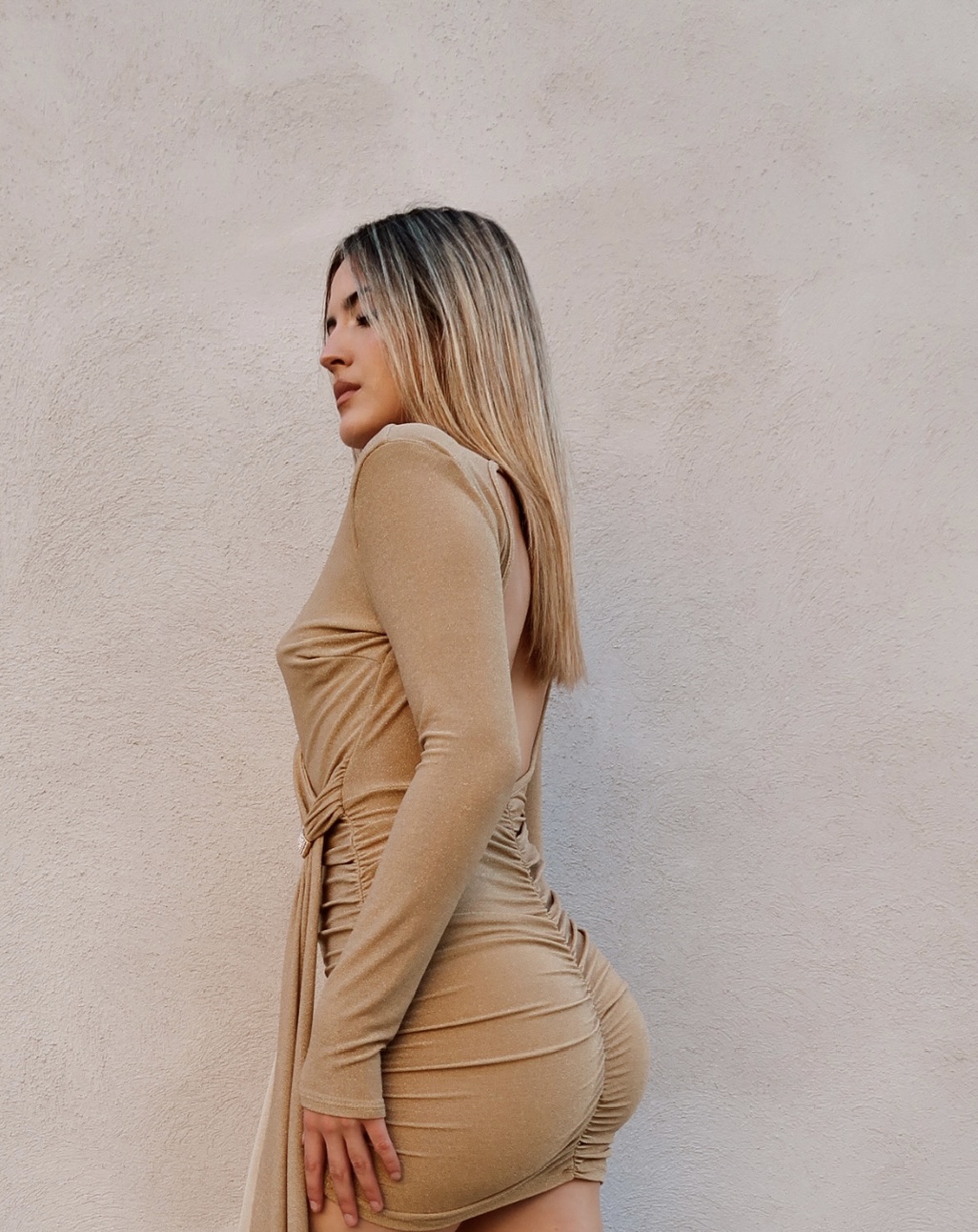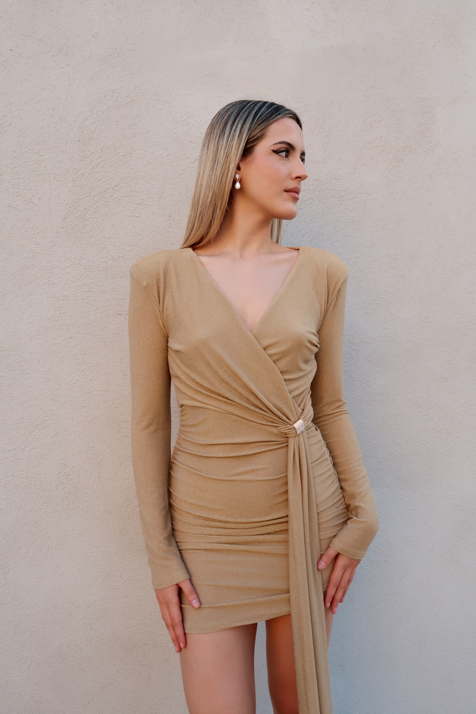 Atrévete a brillar como nunca con este espectacular vestido. Con manga larga y un escote cruzado que favorece a todo tipo de pecho.