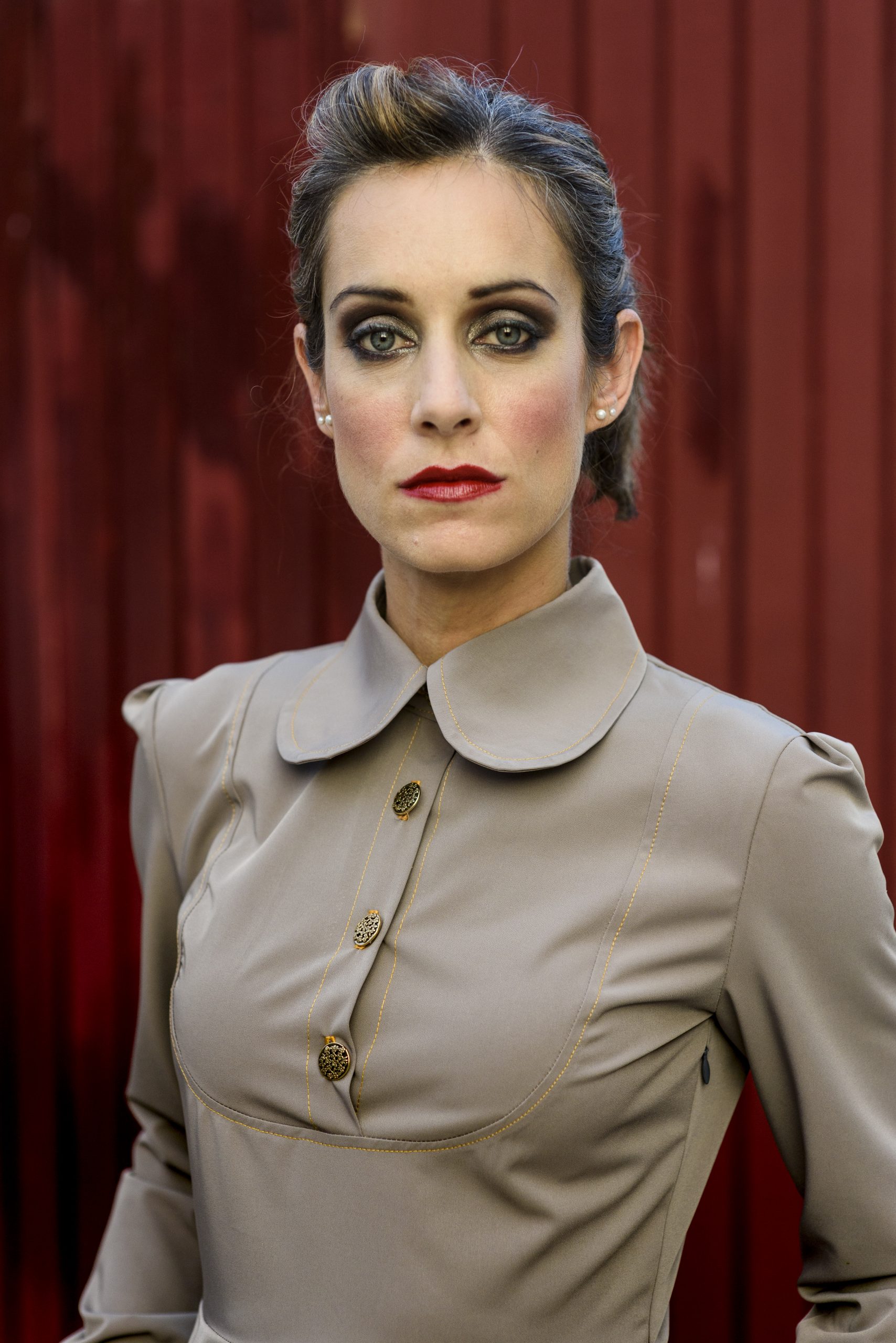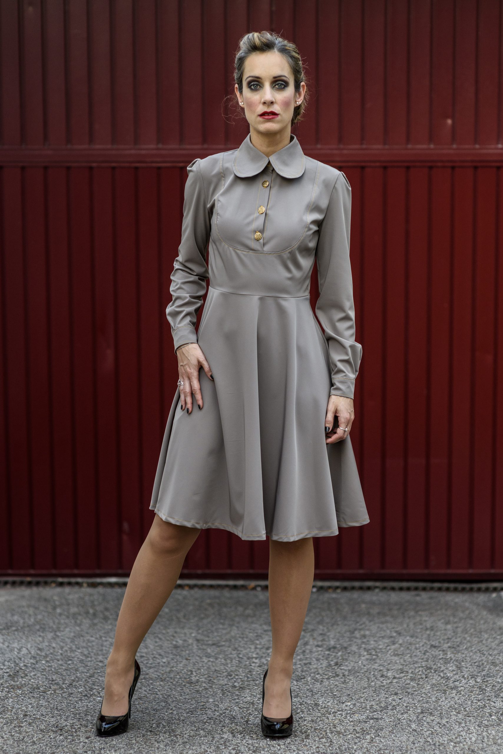 Vestido gris de manga larga y falda de vuelo, en crepe de alta calidad con bolsillos, cuello redondo y botones vintage labrados en delantero y puños. Muy TOP!