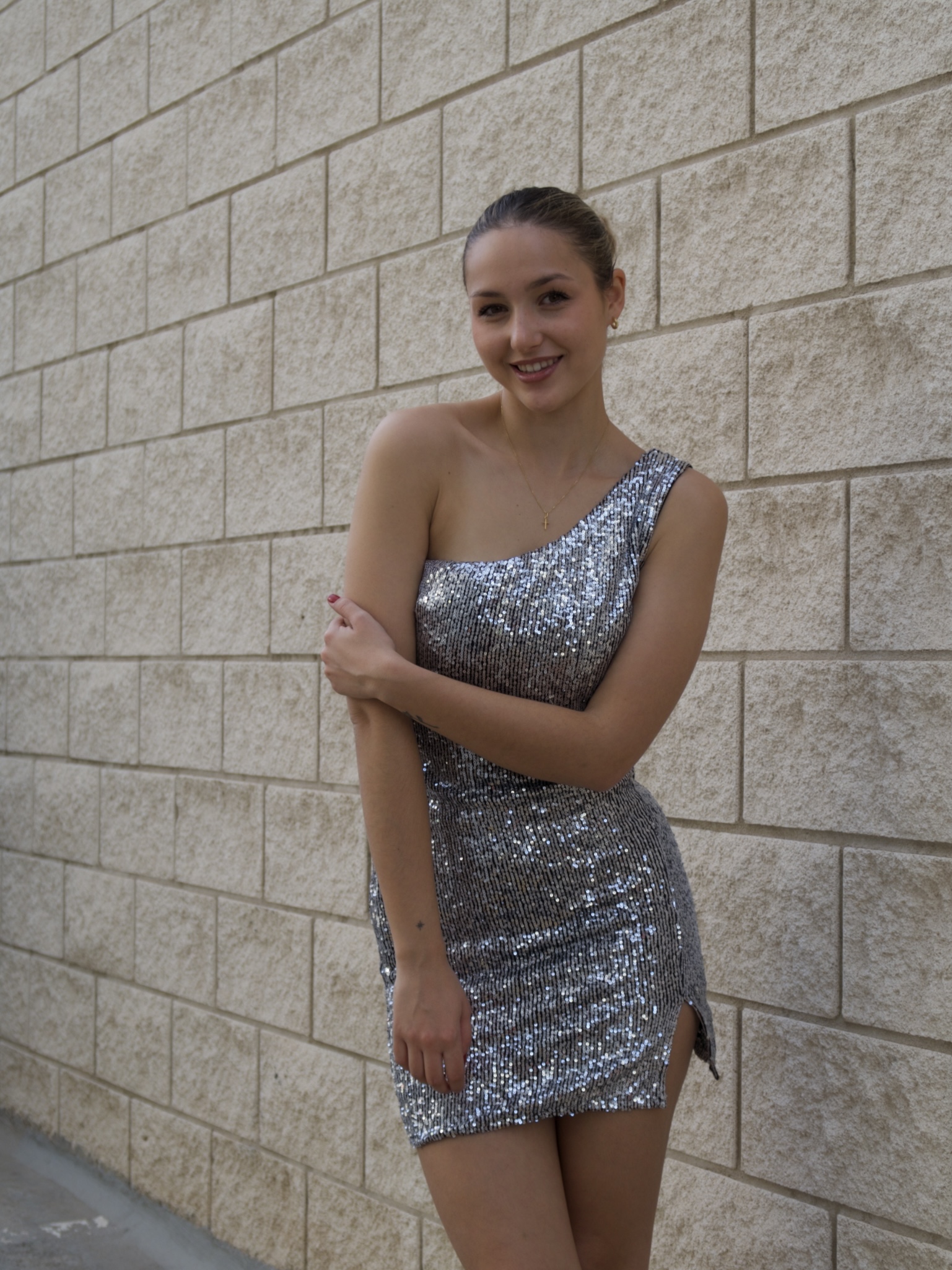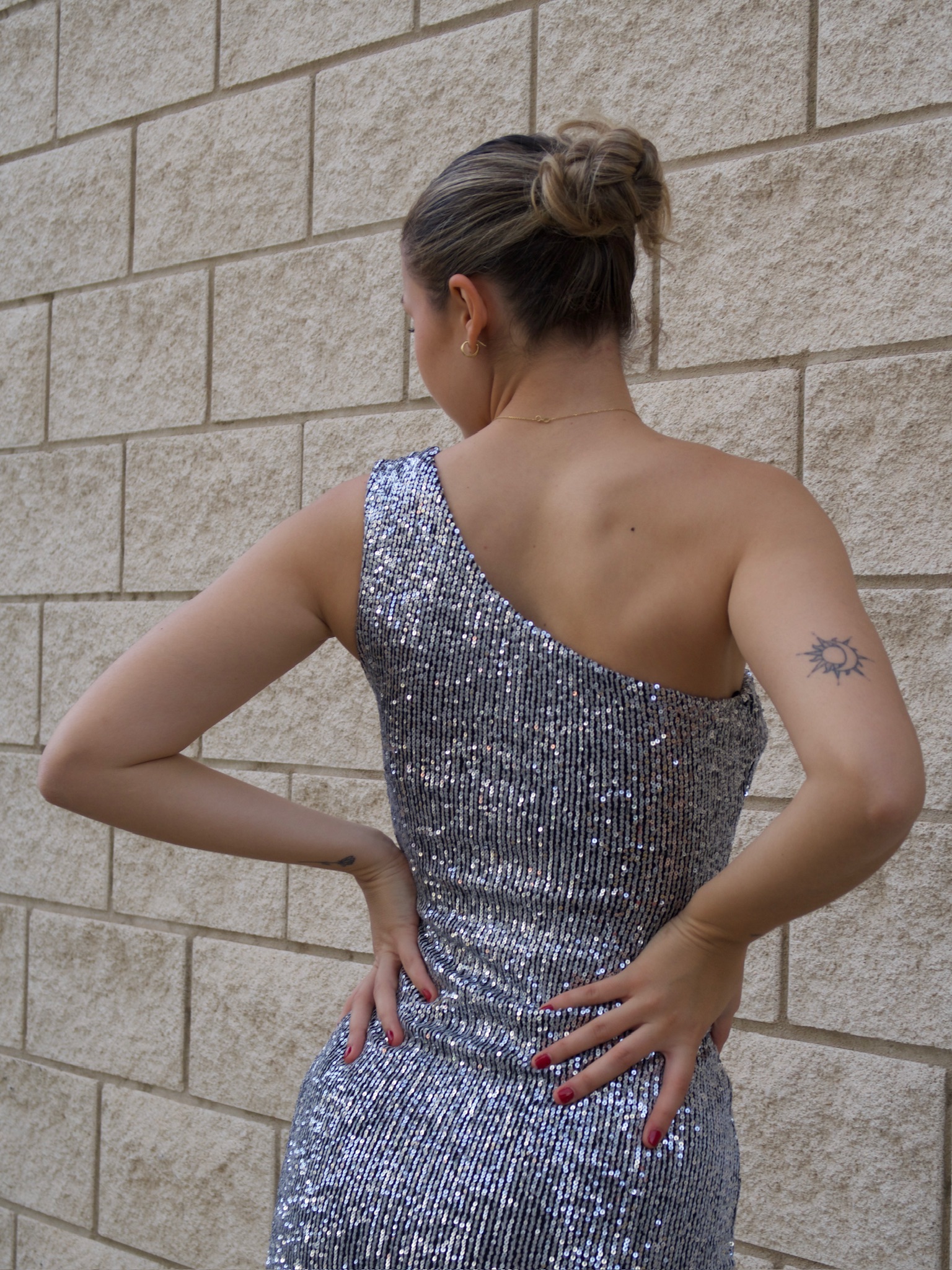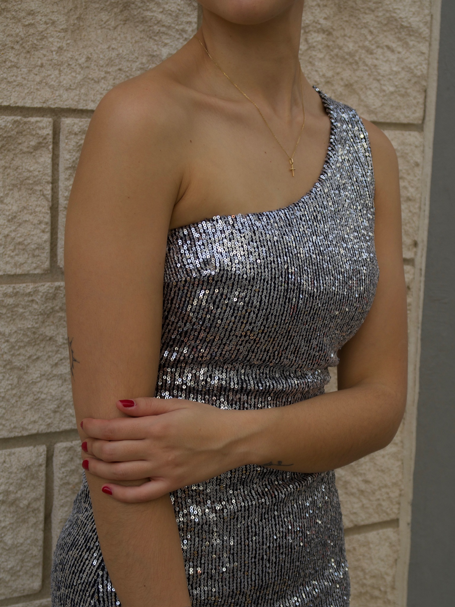 Vestido elástico de lentejuelas plateadas.
