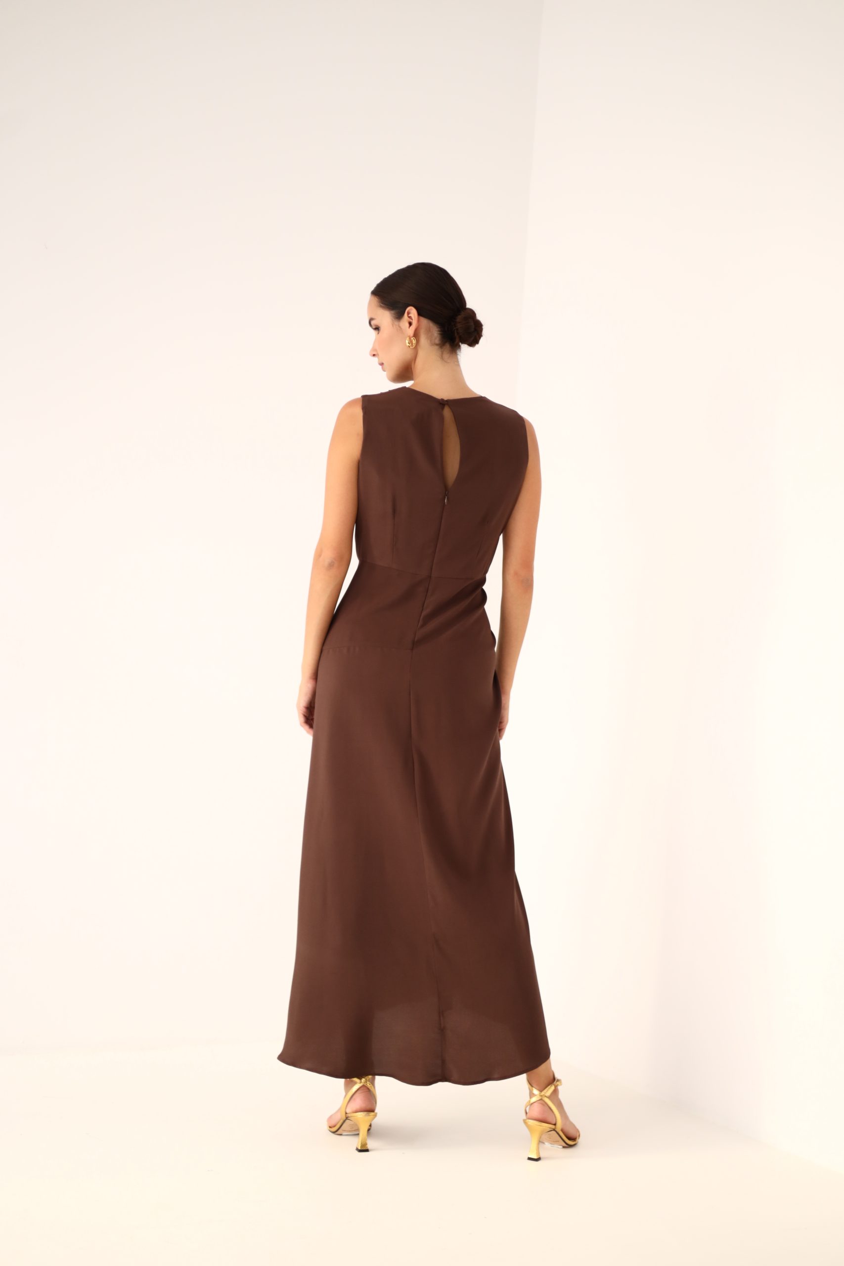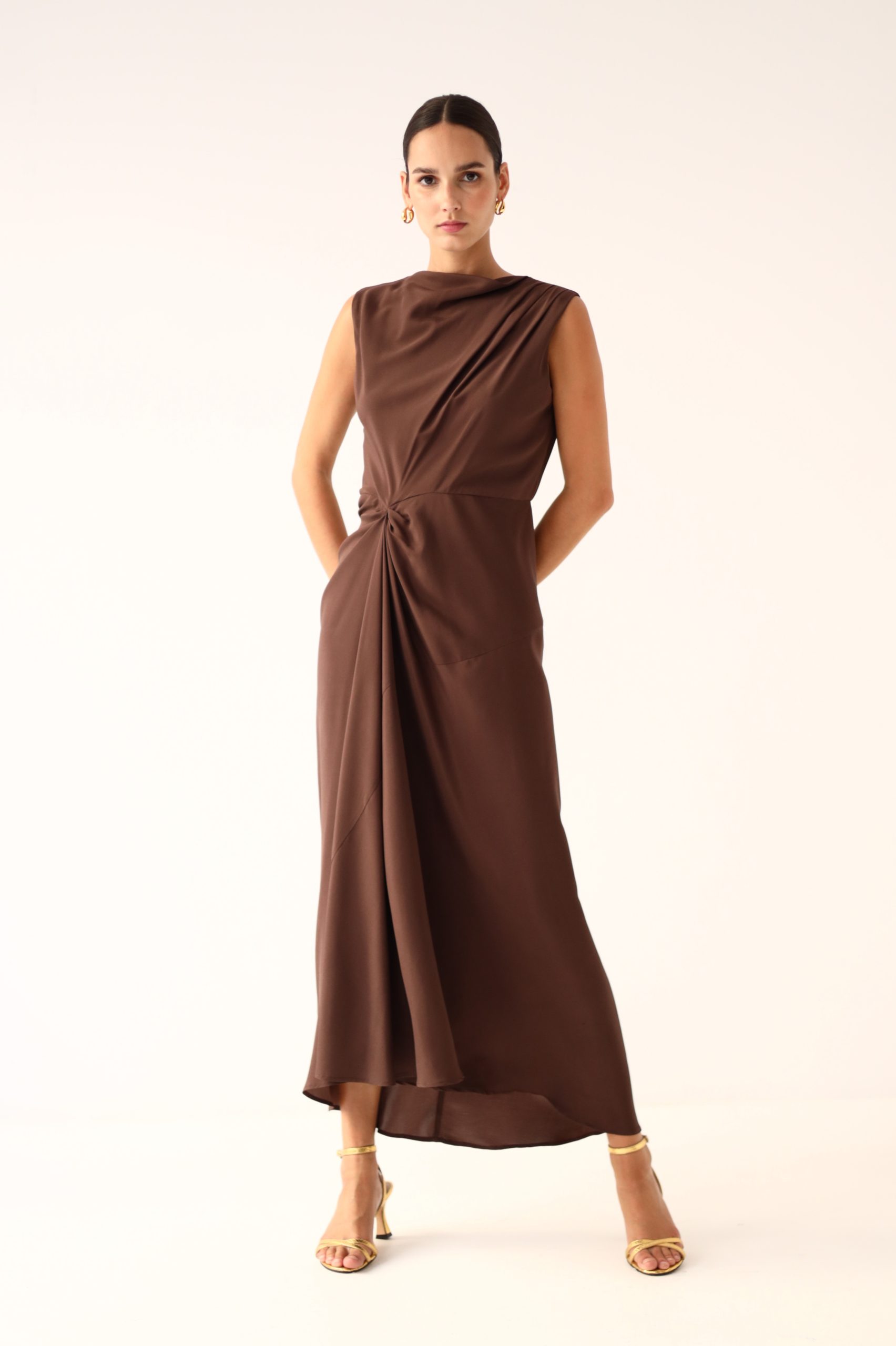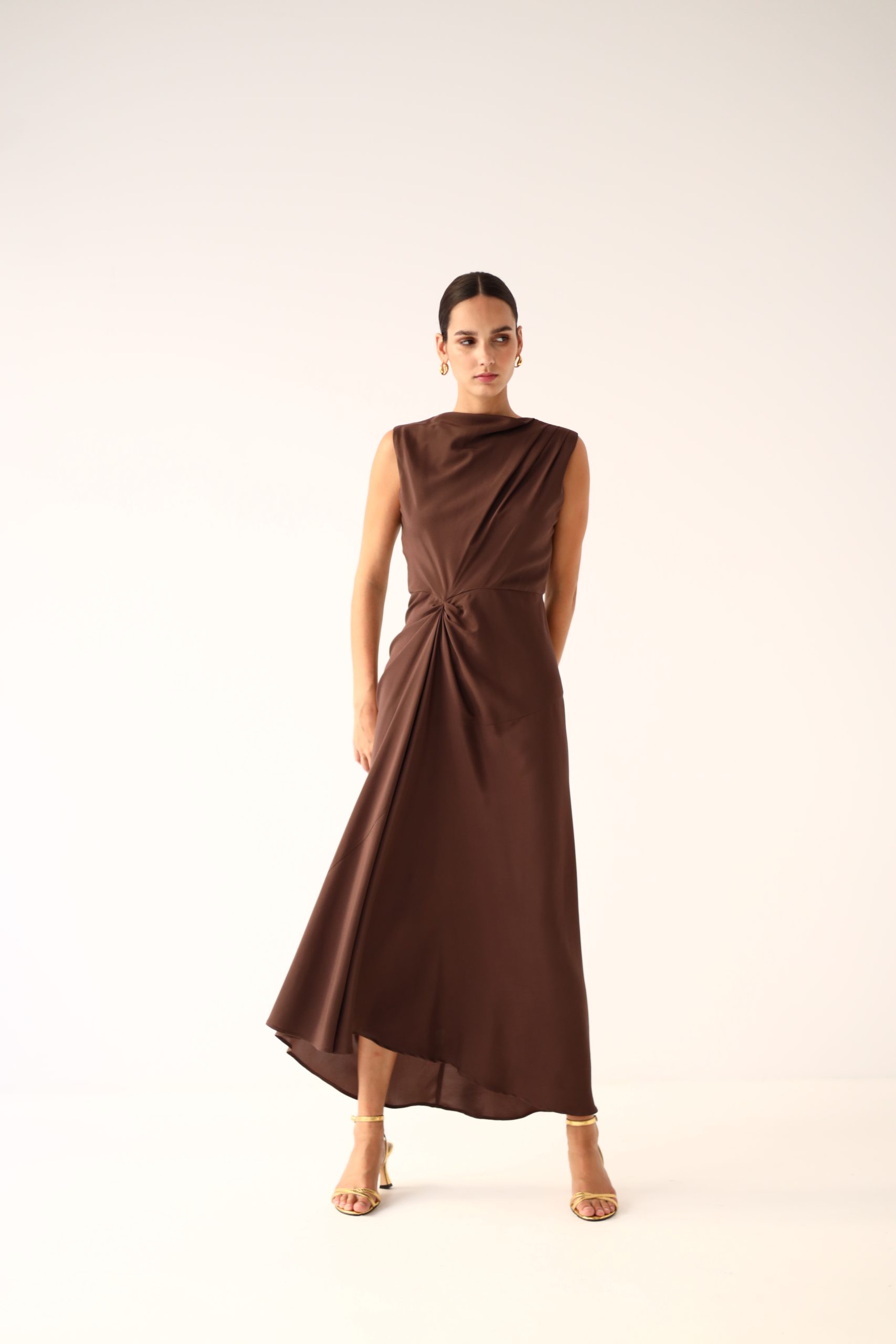 Elegante y estiloso vestido de la Colección Exclusiva By Biombo. Corte cuello barco cerrado con pliegues en un hombro, fruncido en la cintura y más largo por delante que por detrás. Seda 100% natural en color marrón chocolate.