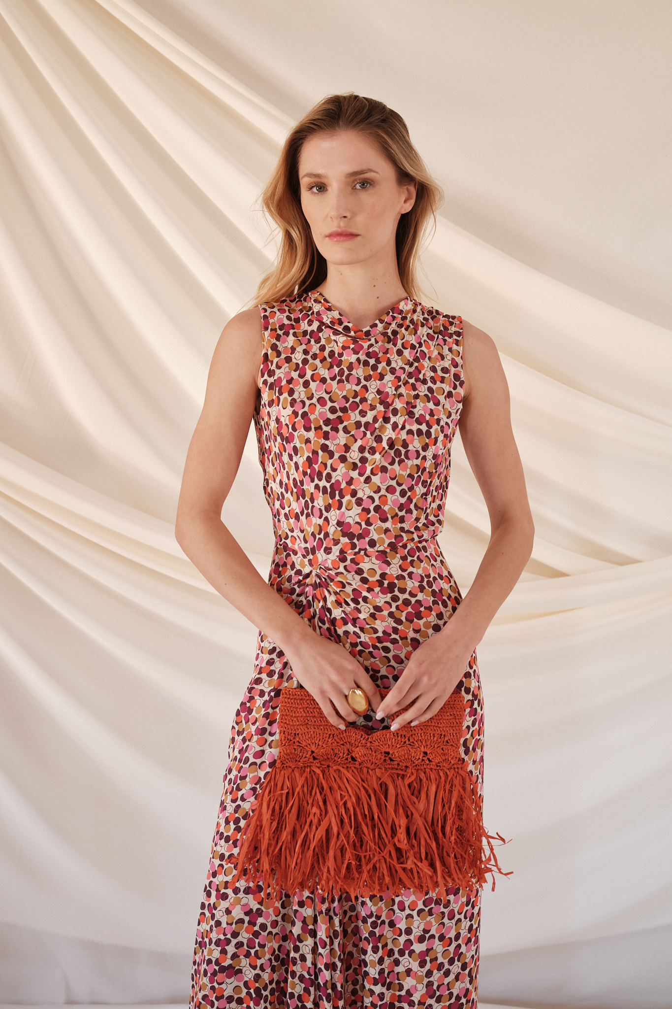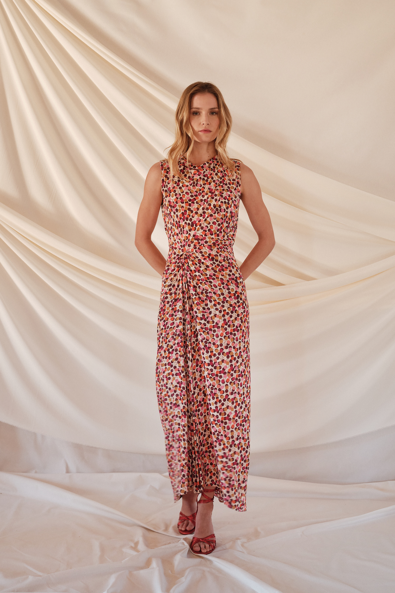 Elegante y estiloso vestido de la Colección Exclusiva By Biombo. Corte cuello barco cerrado con pliegues en un hombro, fruncido en la cintura y más largo por delante que por detrás. Tela estampada con alegres topitos en viscosa súper agradable y transpirable.