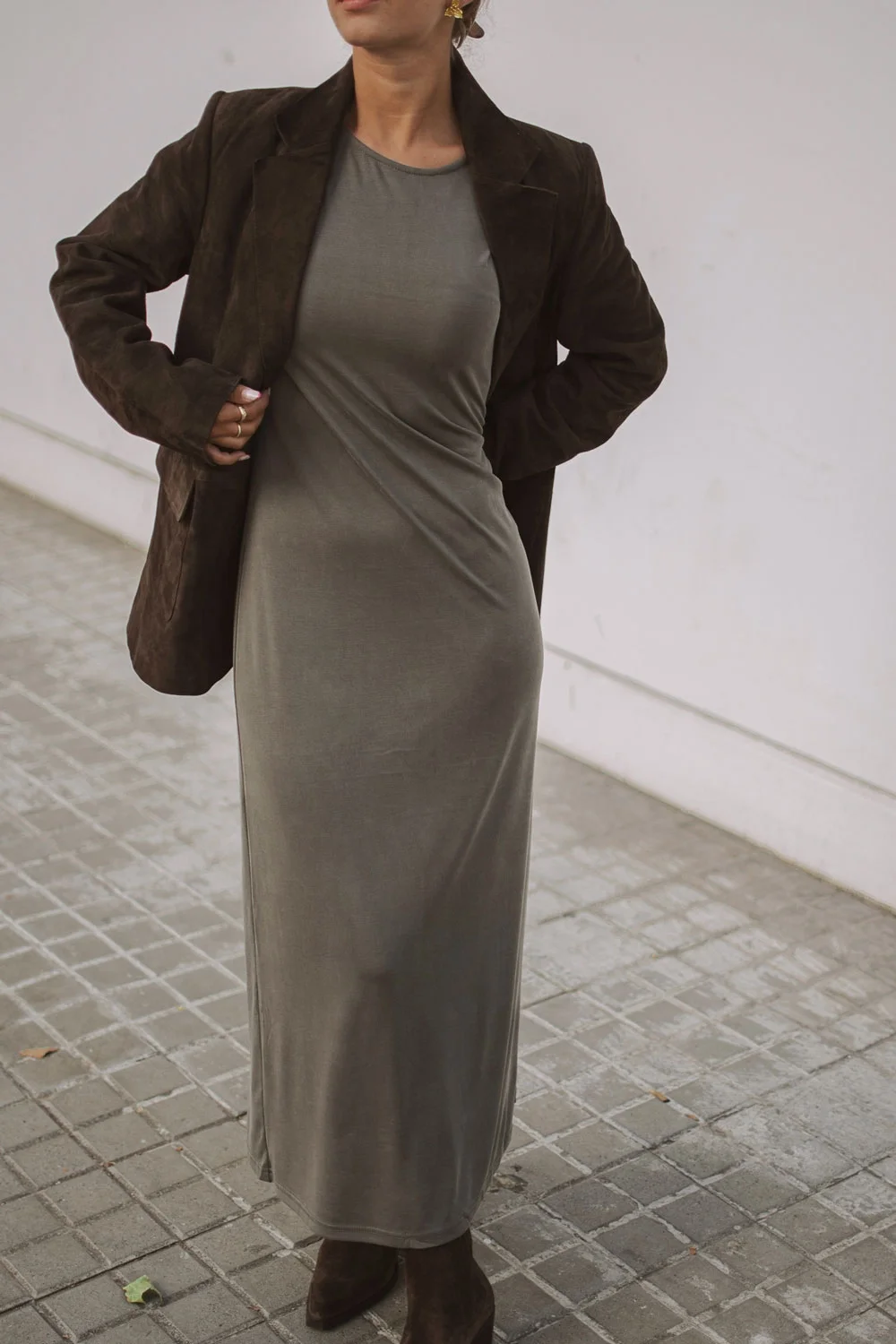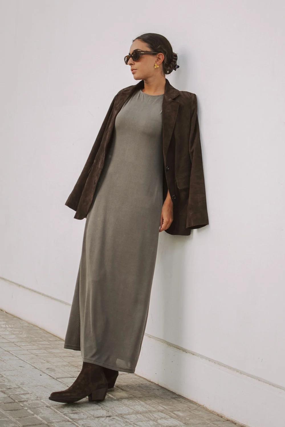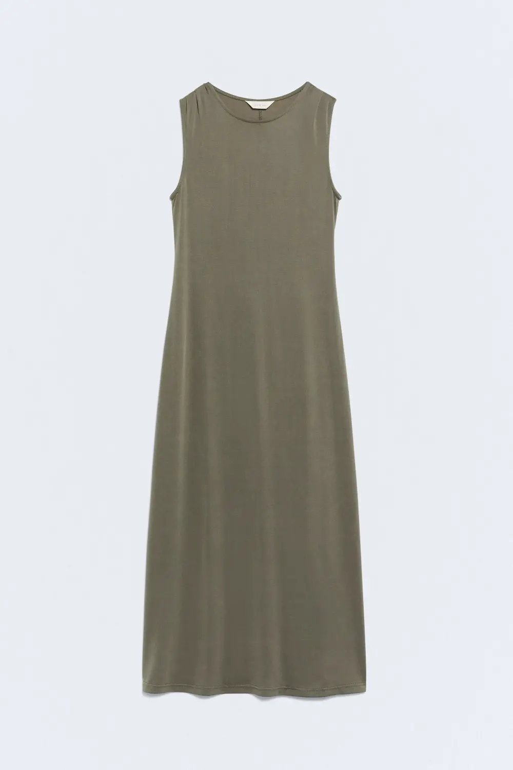 Vestido largo de tirantes fluido. Detalle pliegues hombros. Cuello redondo. Calidad del tejido tipo cupro.
