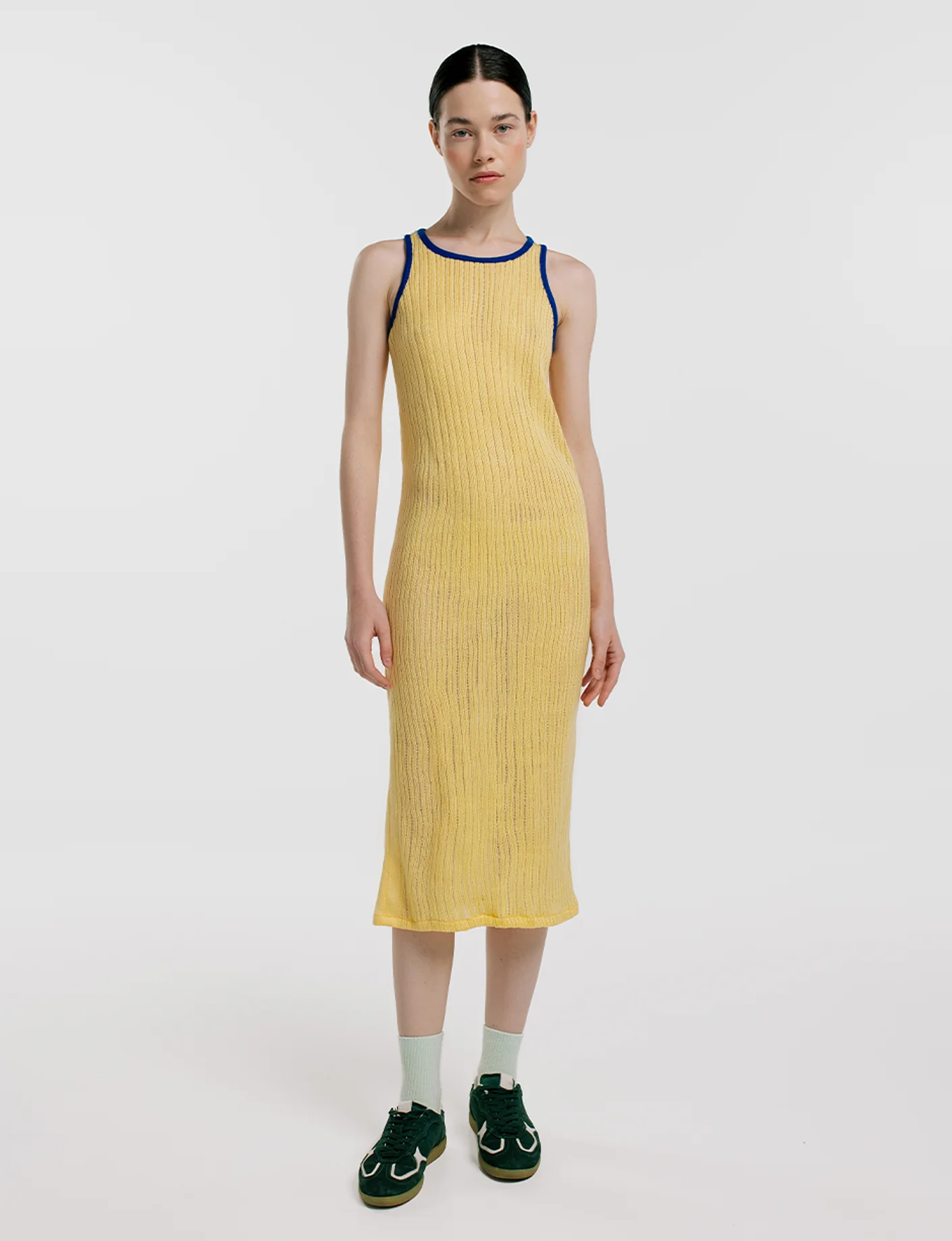 Vestido Midi tejido con cuello redondo y sisa. Unicolor. Disponibilidad en todas las tallas