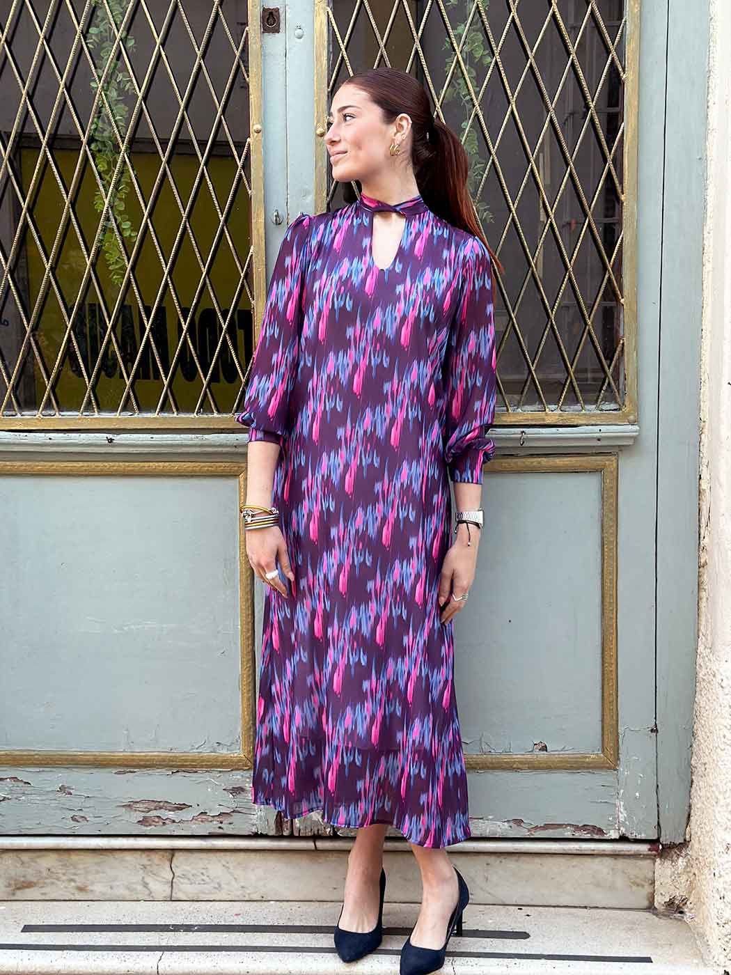 Este vestido midi con tiene un estampado como de gotas en tonos rosados, verdes y beiges. Su colorido es alegre y juvenil, aunque su corte es más clásico.