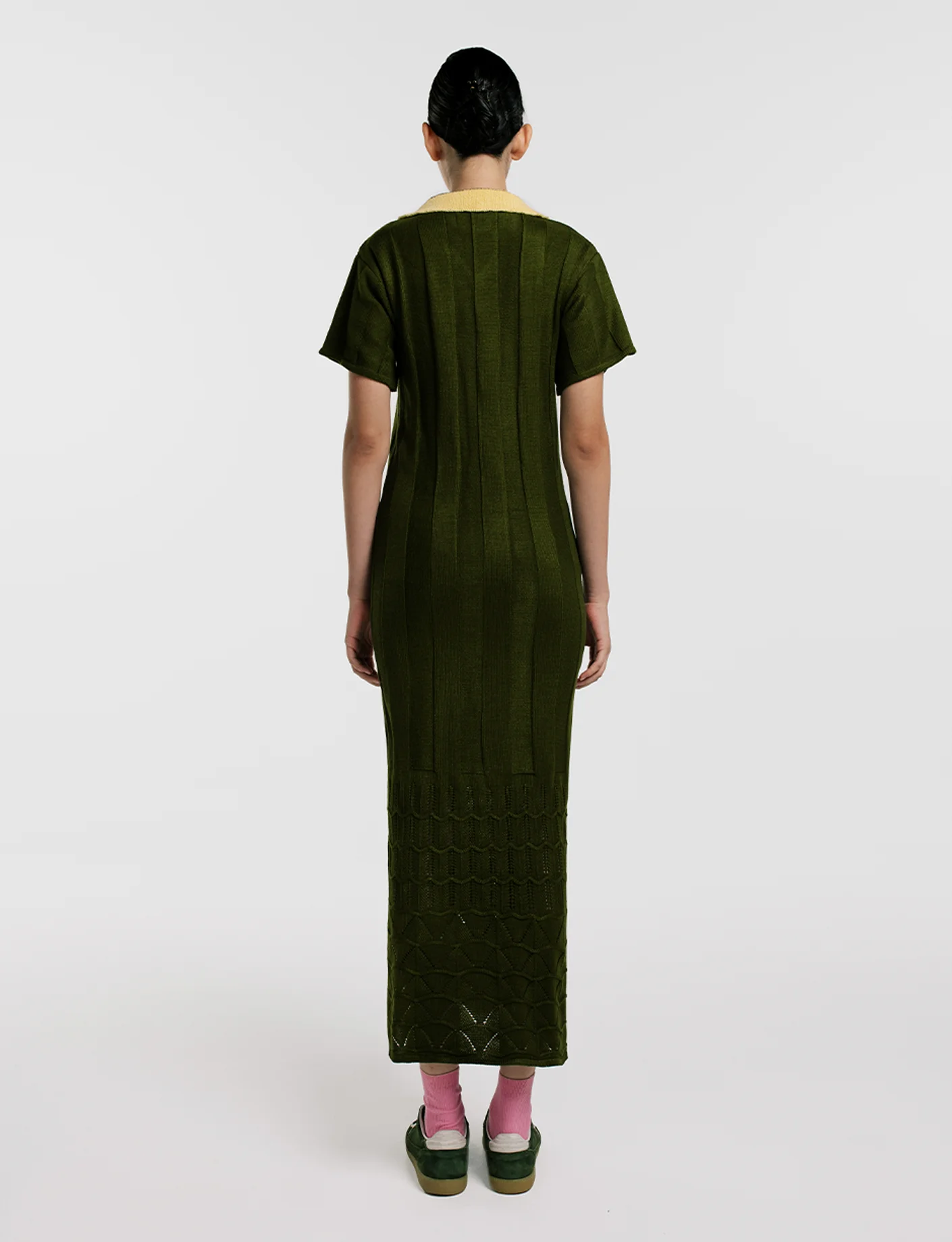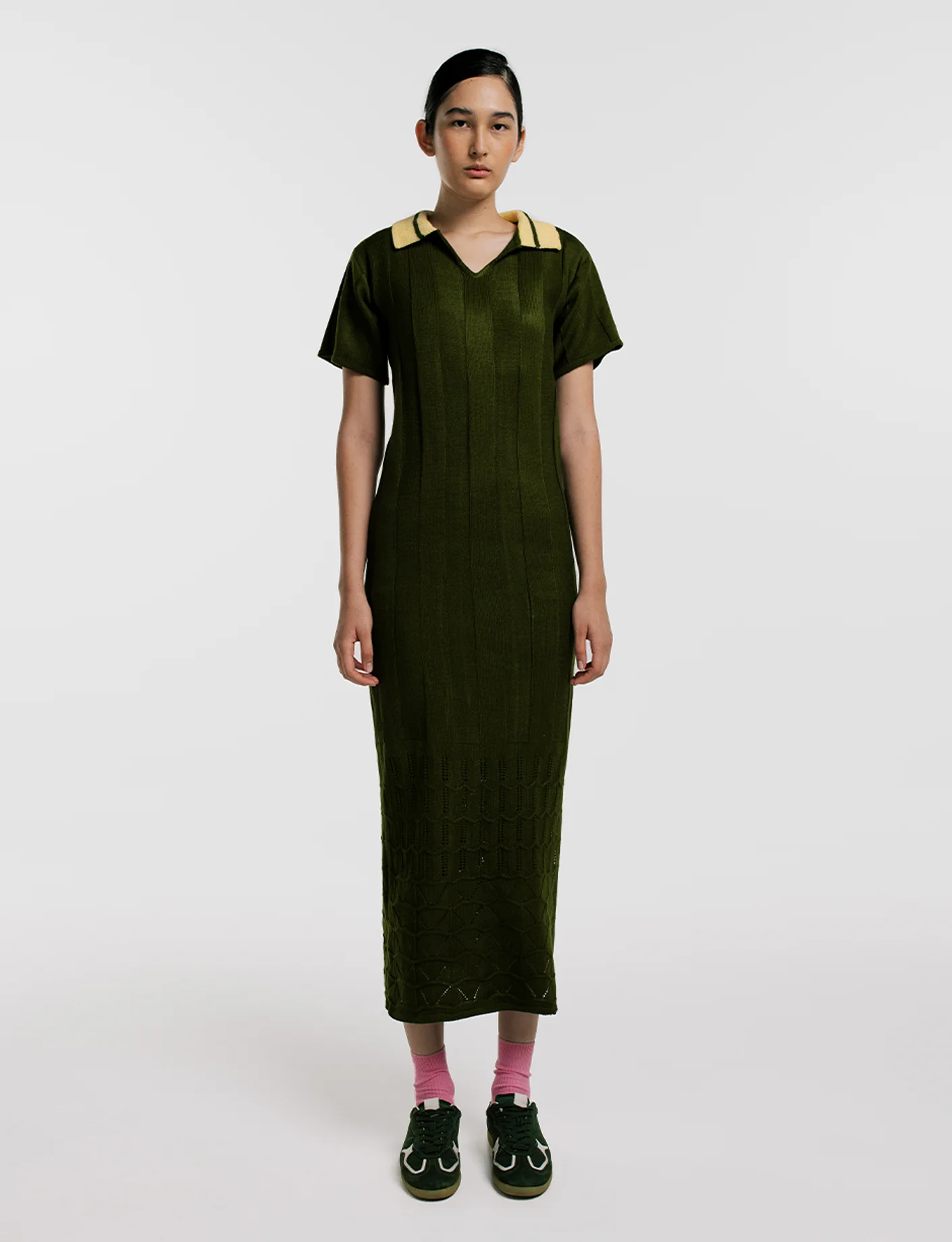 Vestido largo tejido en Hilo Hipoalergénico. Fit recto, manga sisa, largo al tobillo. Tejido de punto, terminado y bordado a mano. Hecho artesanalmente en Sogamoso, Boyacá. Disponibilidad en todas las tallas.