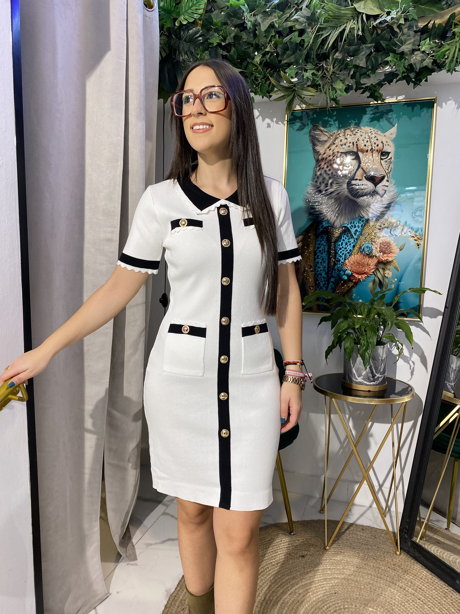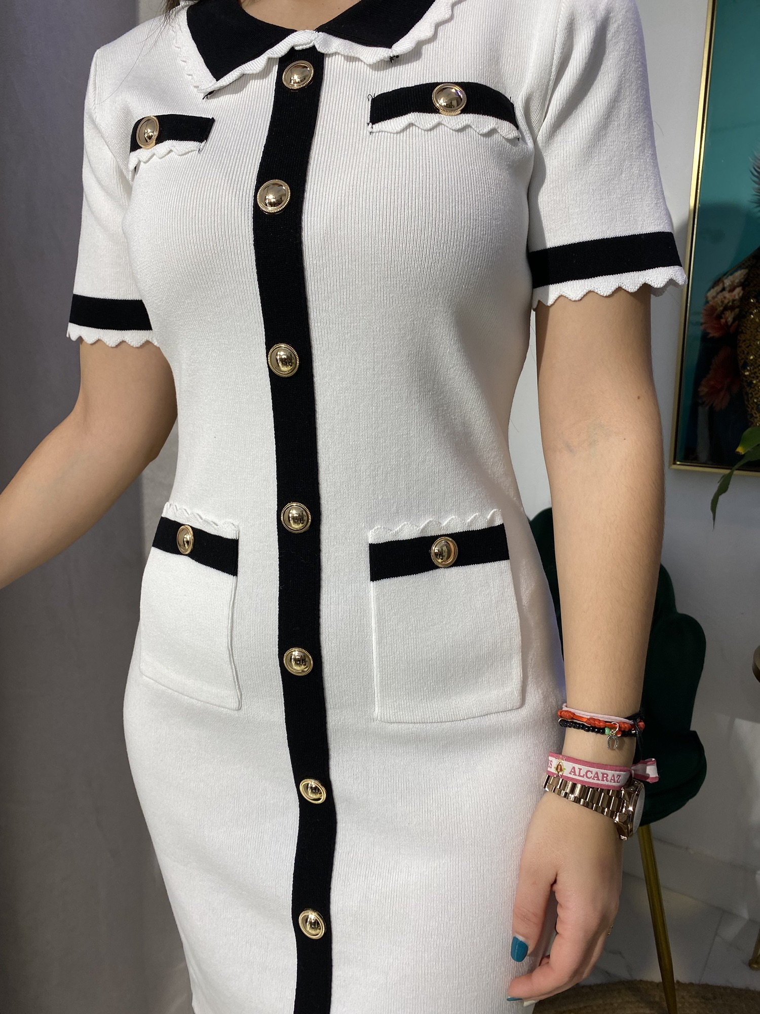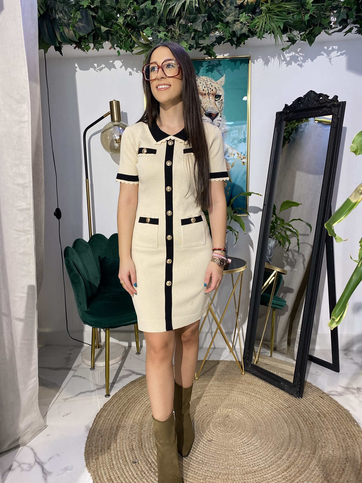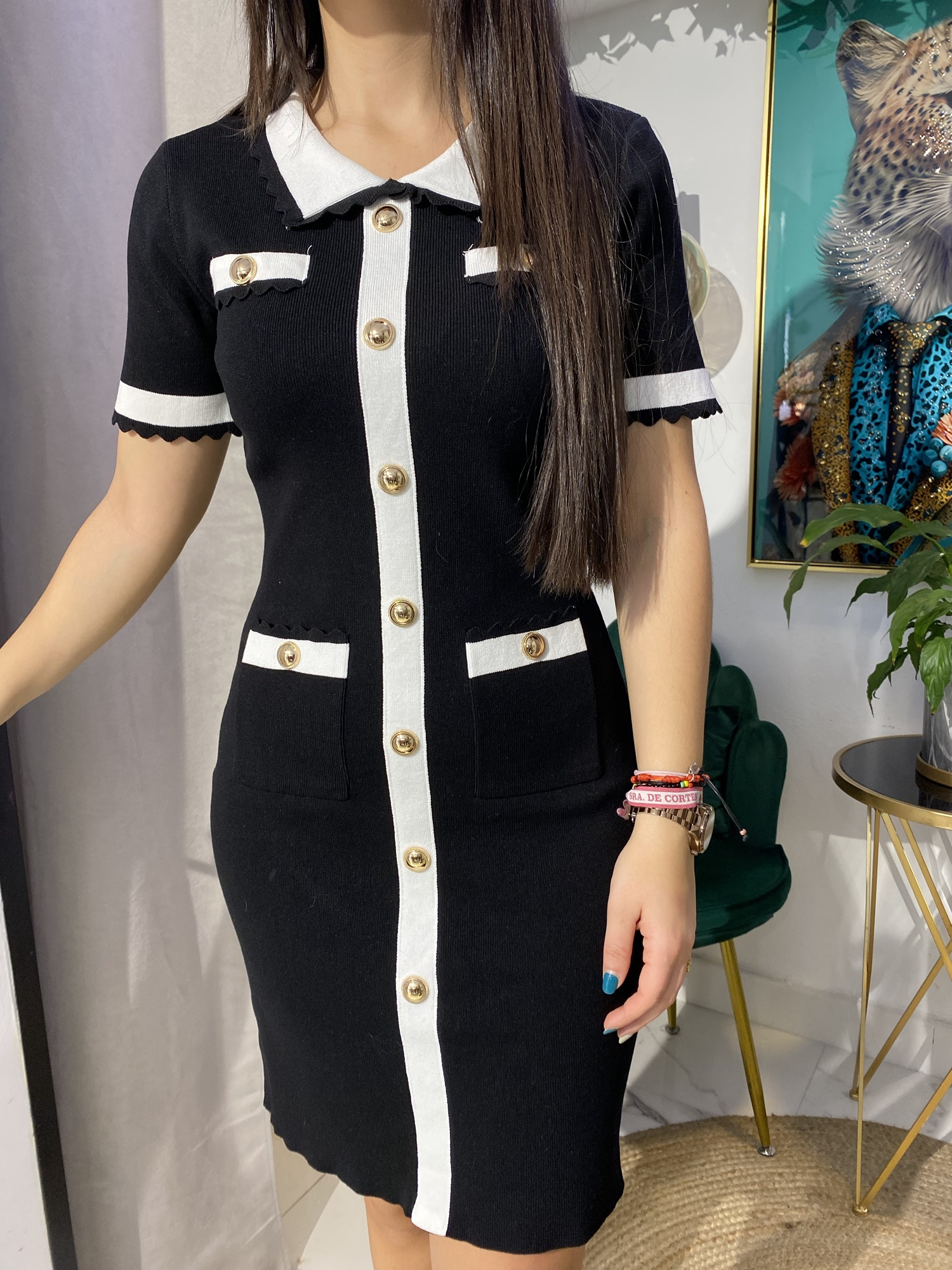 Este vestido de punto con botones dorados es una prenda imprescindible en tu armario. Su diseño atemporal te permite crear looks muy diferentes, desde un estilo clásico y elegante con zapatos de tacón hasta un outfit más moderno y casual con botas o zapatillas deportivas.