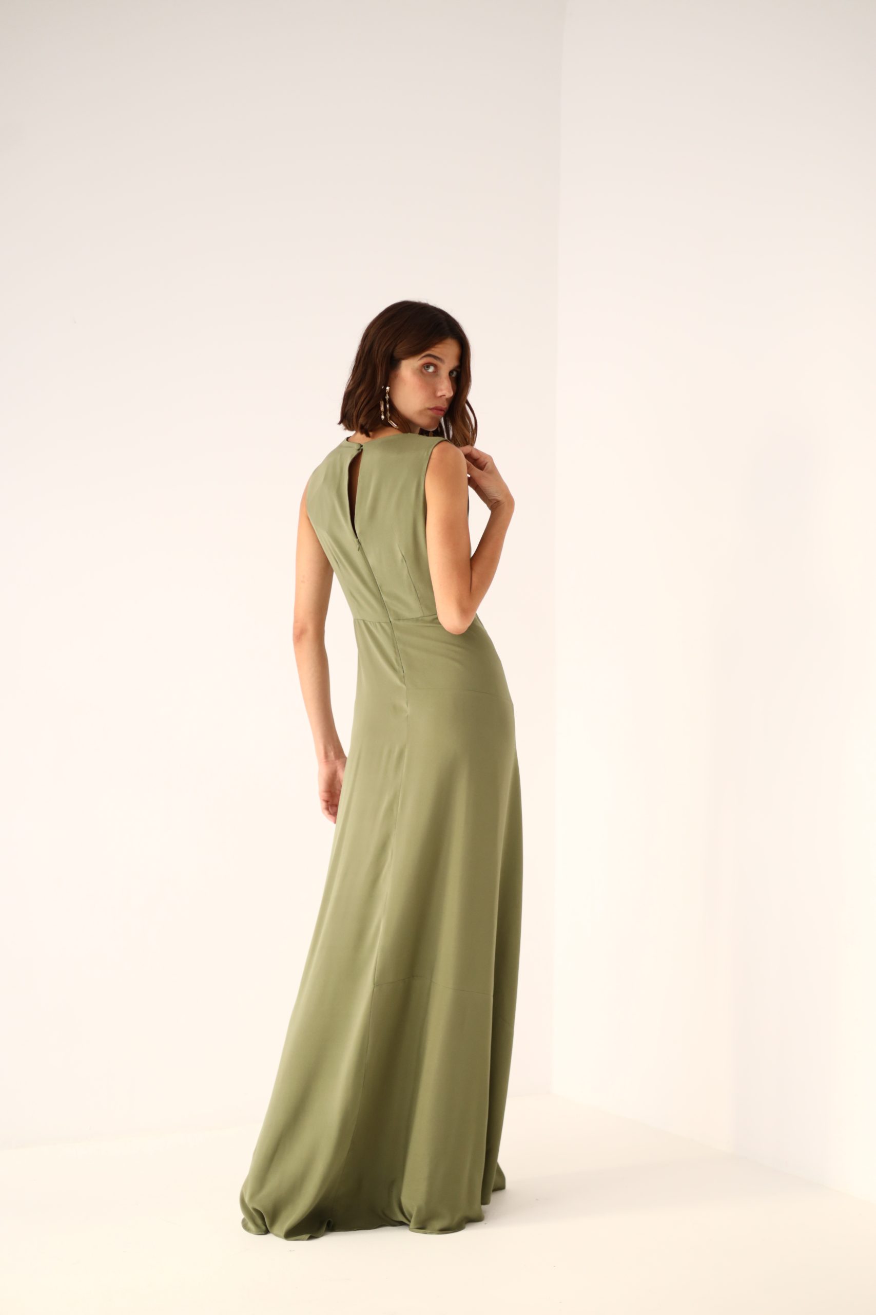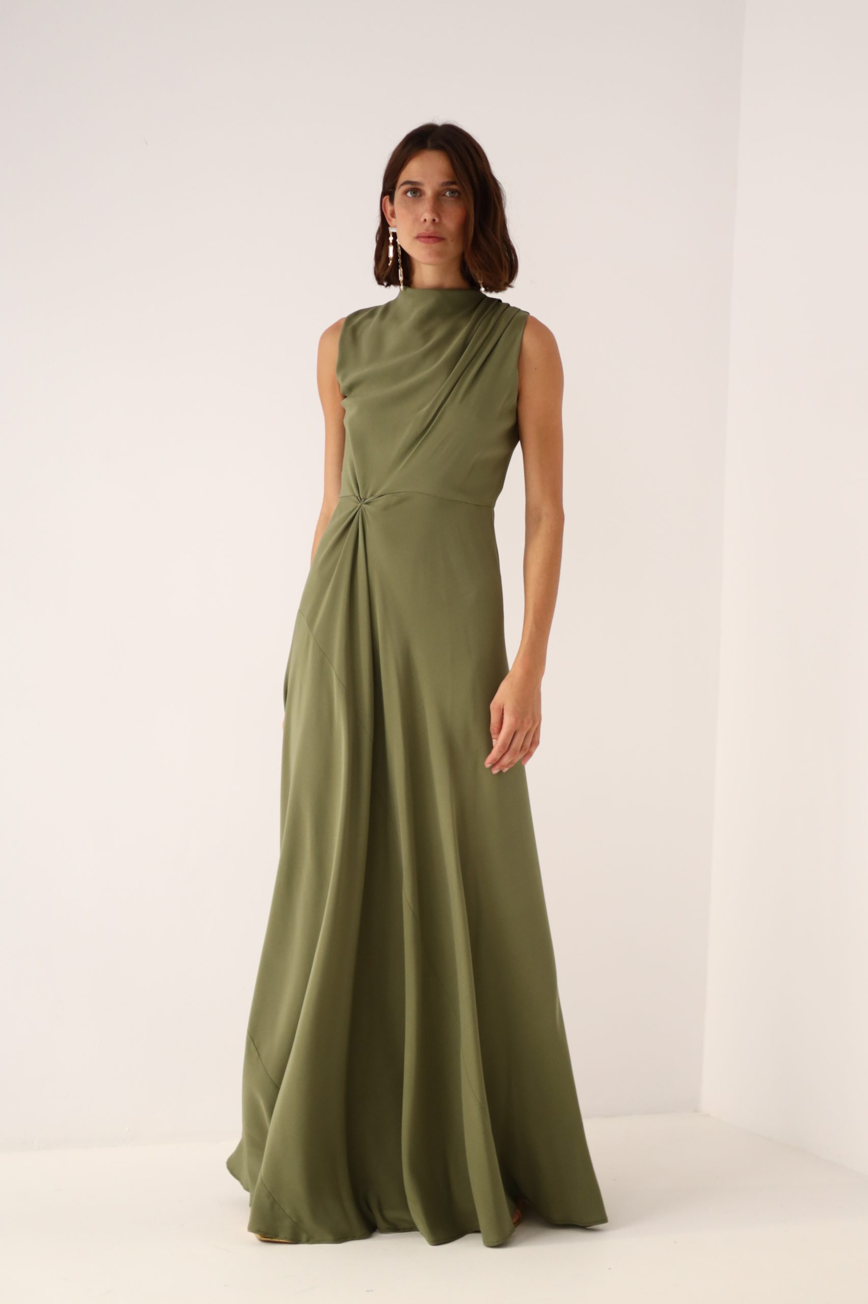 Elegante y estiloso vestido de la Colección Exclusiva By Biombo. Corte cuello barco cerrado con pliegues en un hombro y fruncido en la cintura. Seda 100% natural en color verde aceituna.