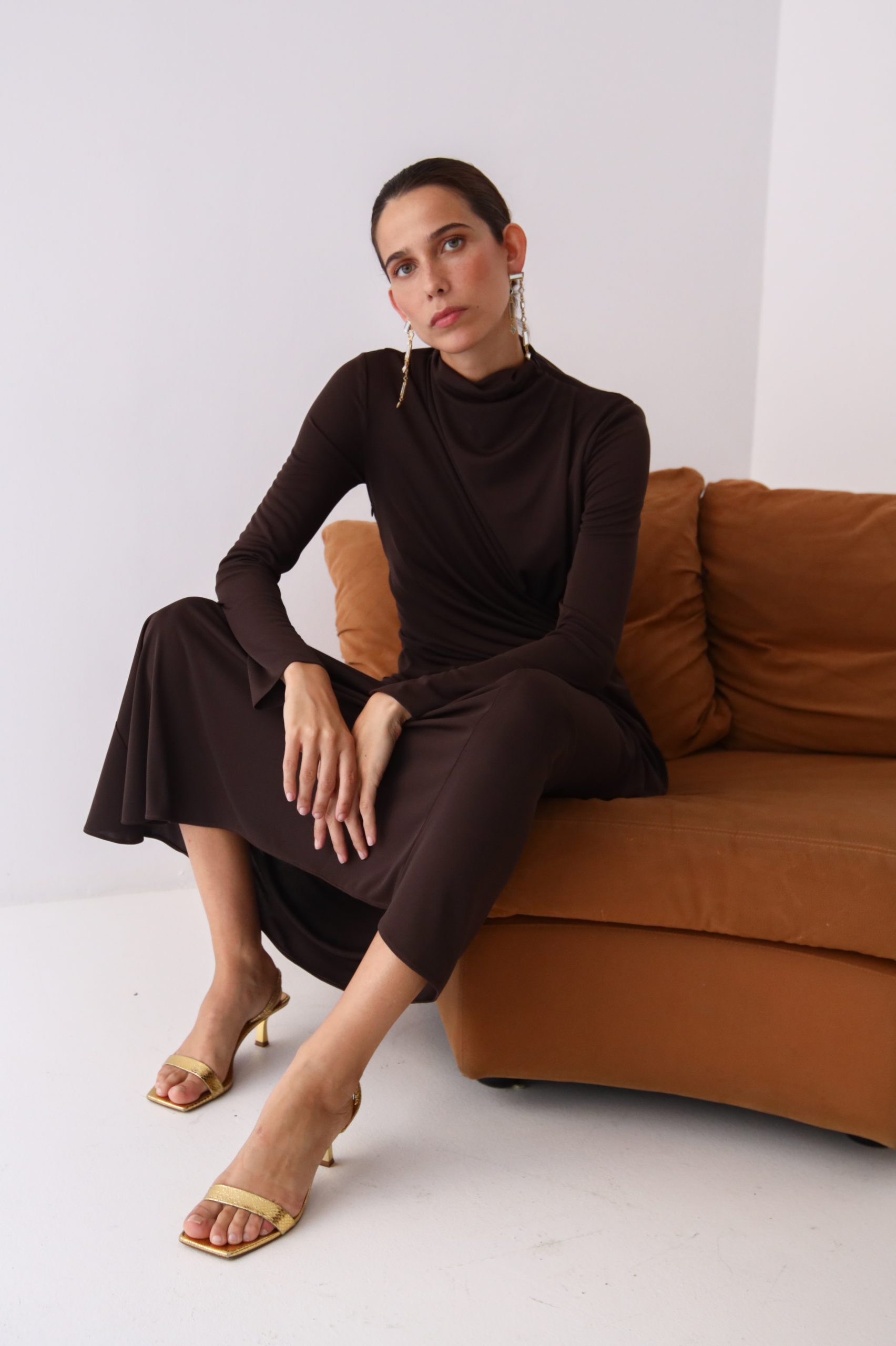 Vestido con cortes asimétricos en punto con manga larga.