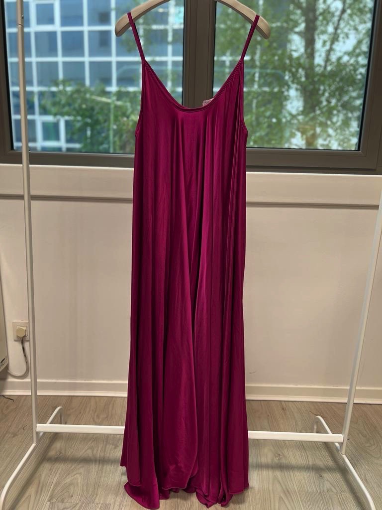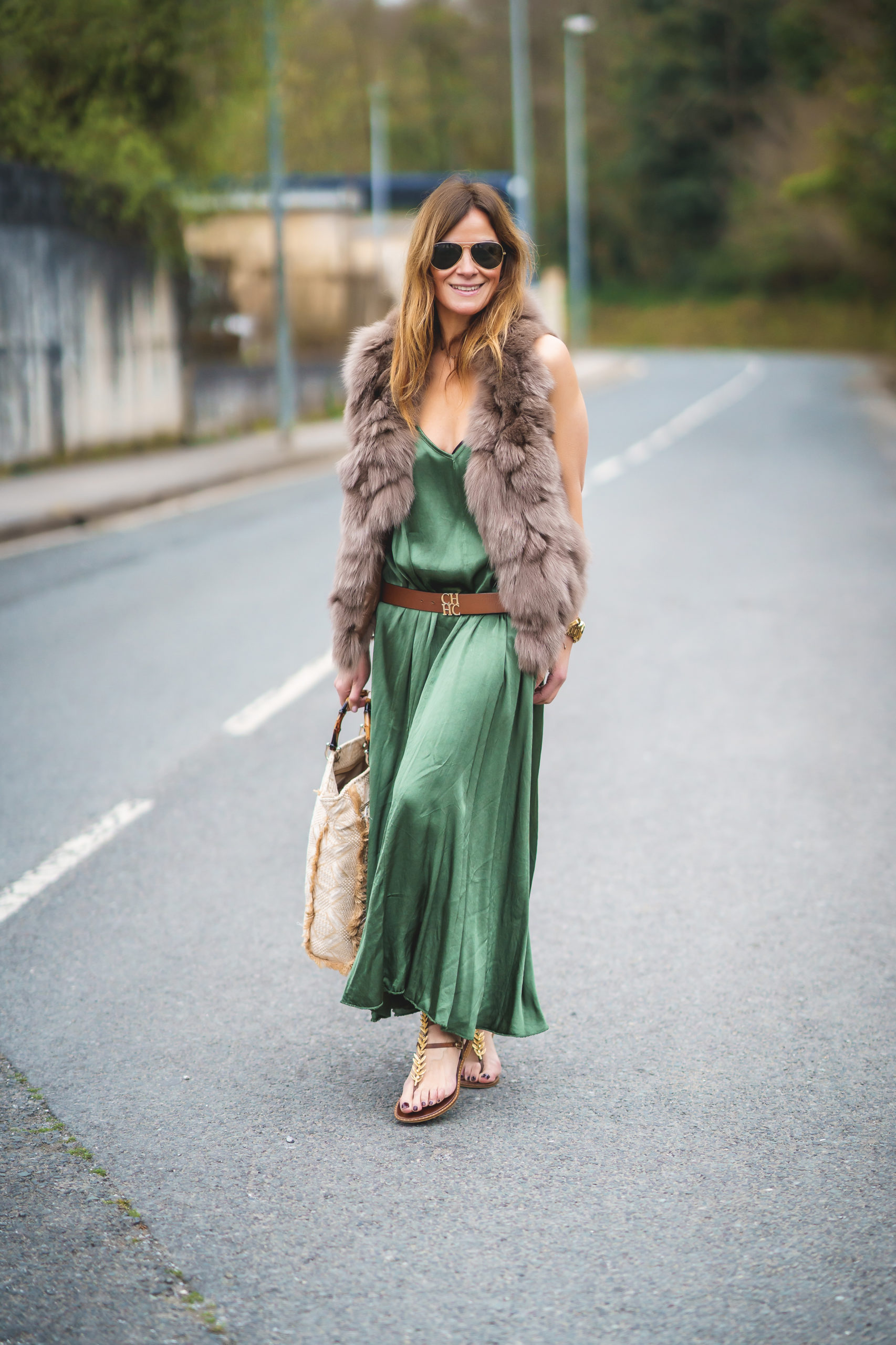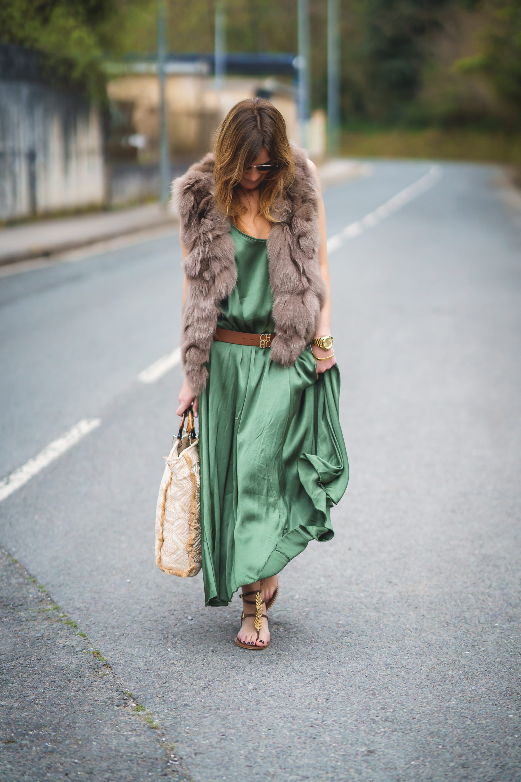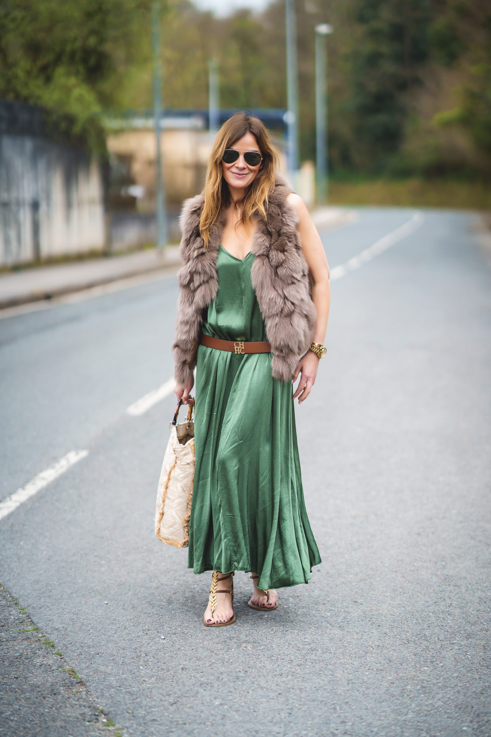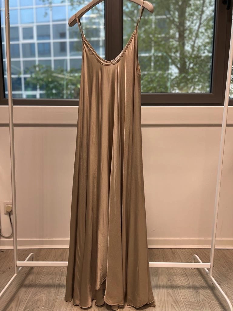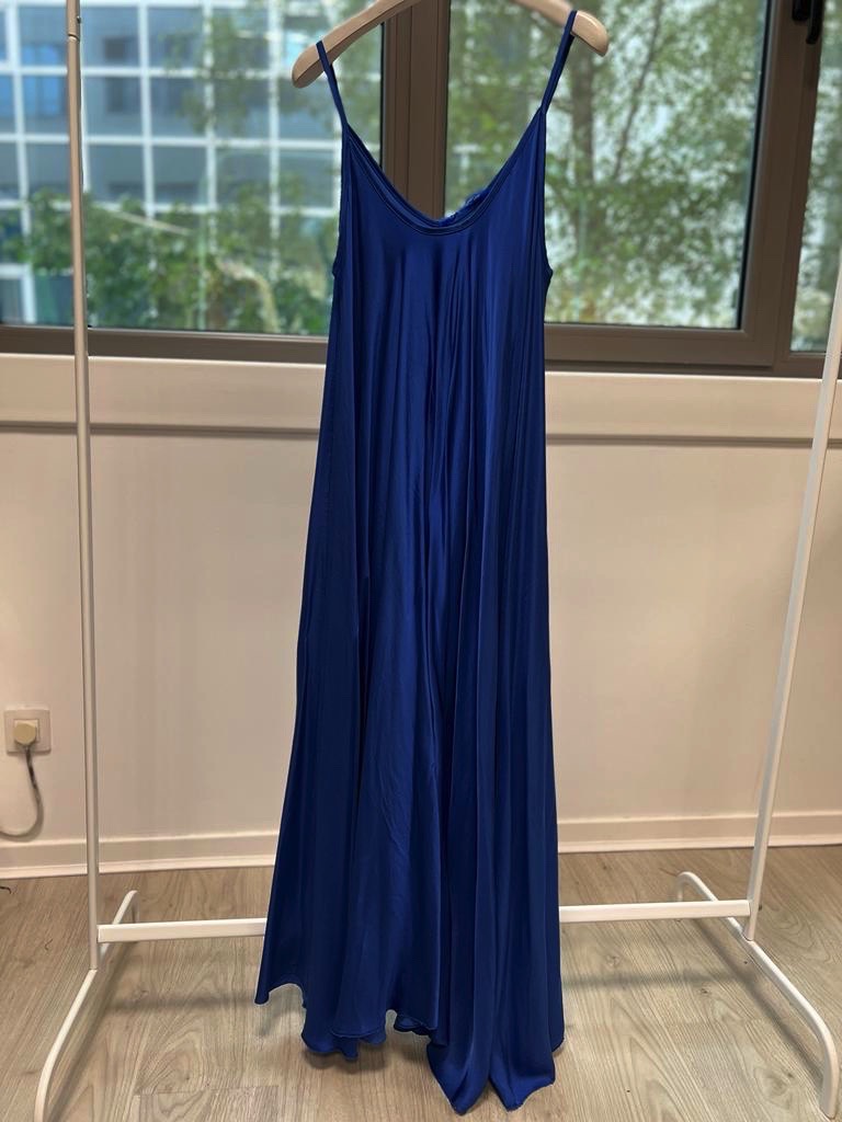 Precioso vestido largo de raso, de tirantes, escote pico por delante y por detrás.