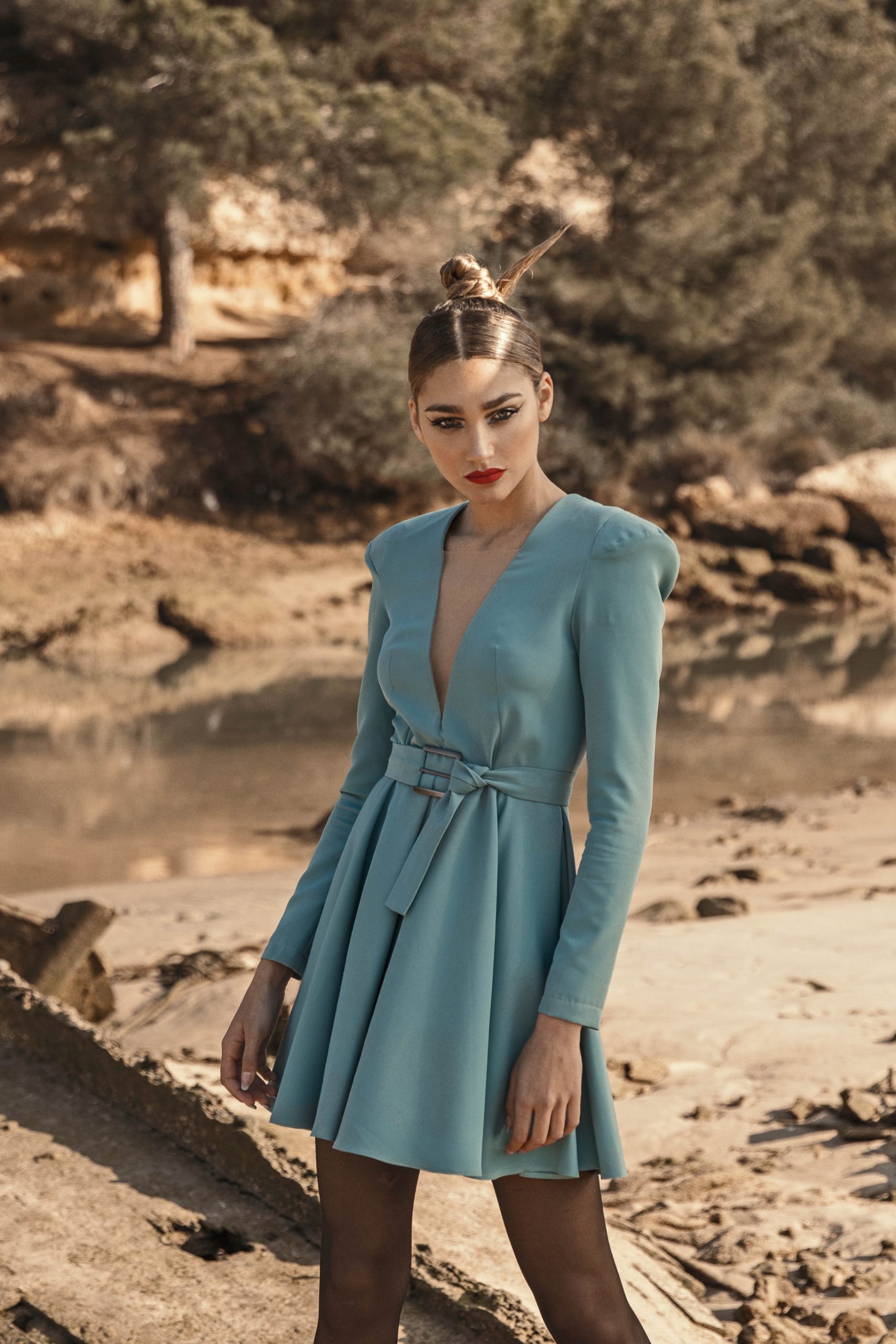 ▫️Este diseño en color azul petróleo, se ajusta en la cintura con un cinturon y eso hace que se pronuncie aún más su falda de vuelo.