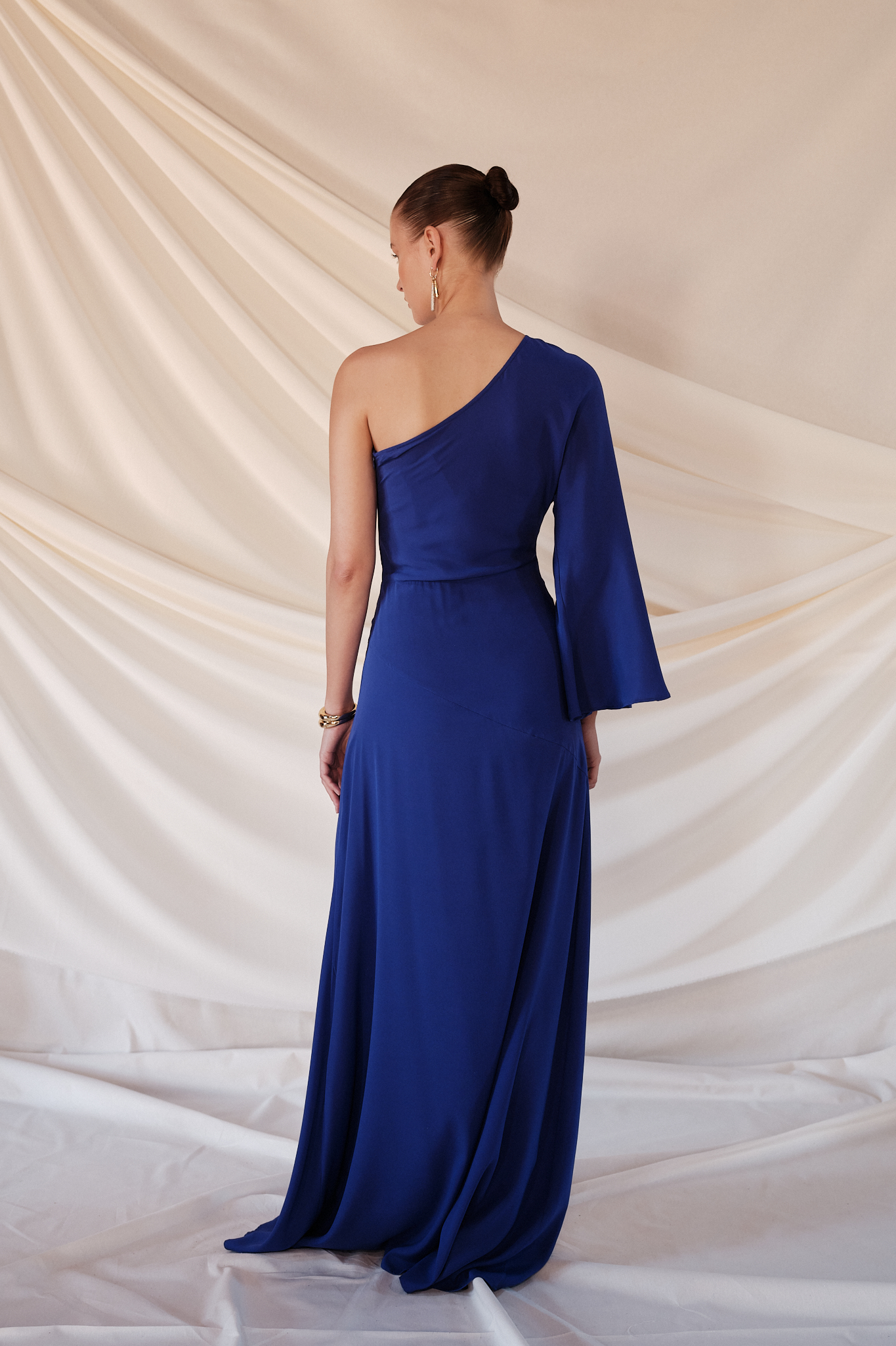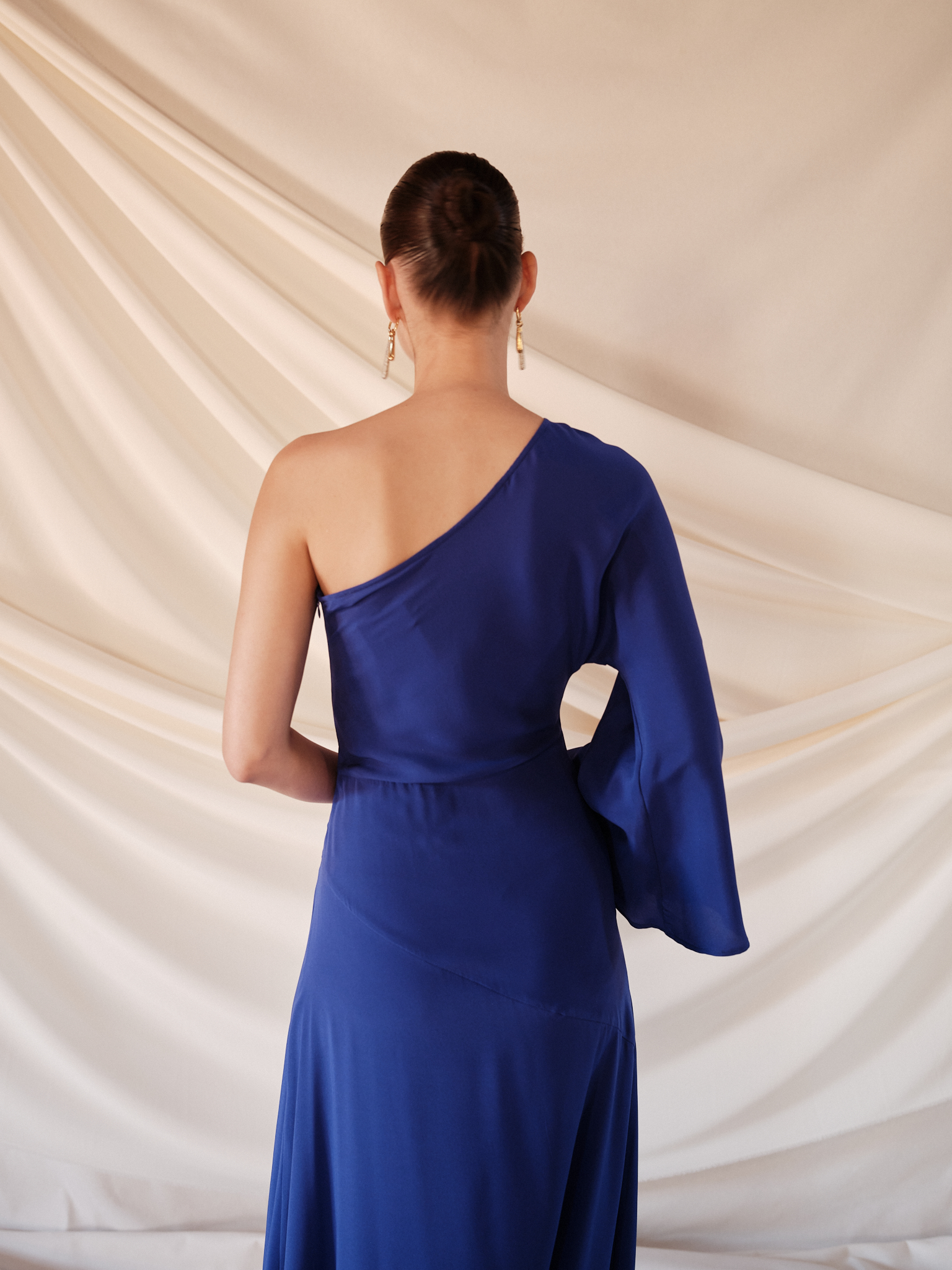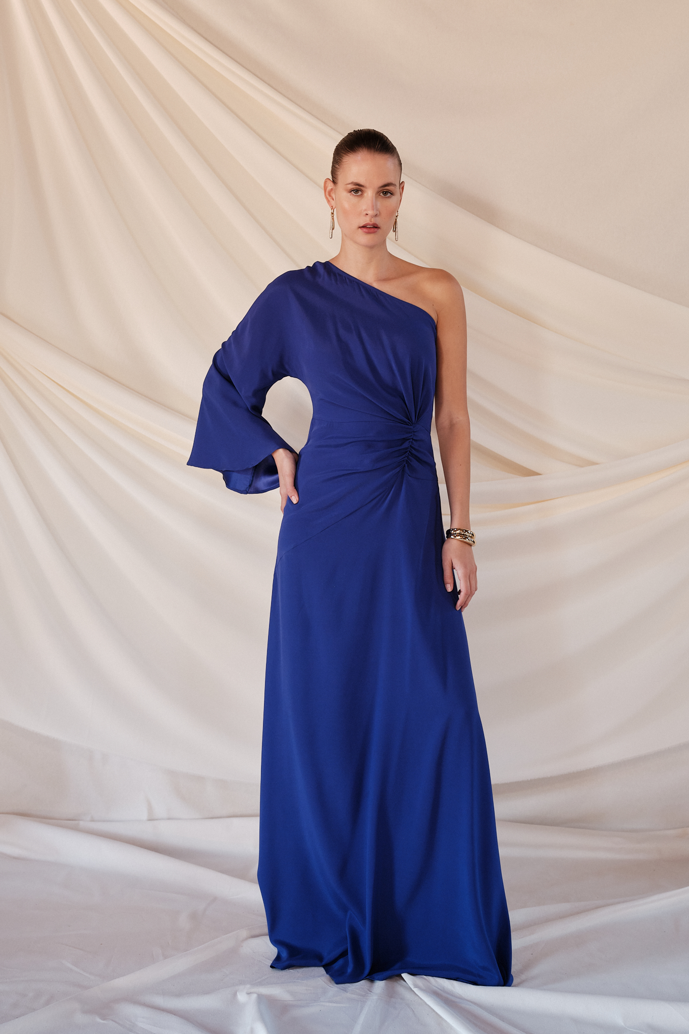 El vestido Zinnia de la colección By Biombo con tejido de seda natural, corte largo y manga asimétrica. Lleva un fruncido en cintura y falda con costuras cruzadas.