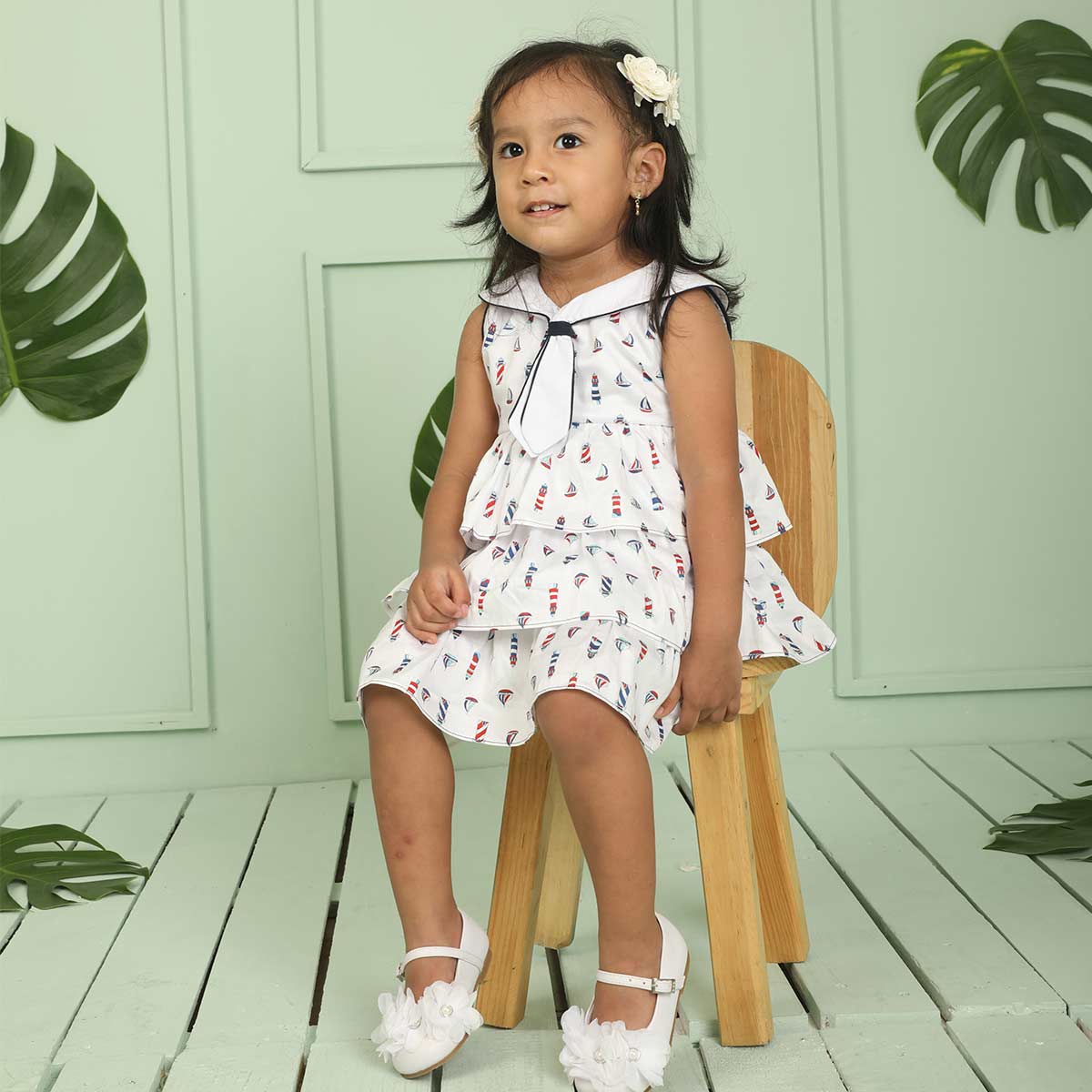 Vestido blanco con sublimado de barcos y una linda solapa marinero. Modelos con estilos unicos. Confeccionado en tela 100% algodon.
