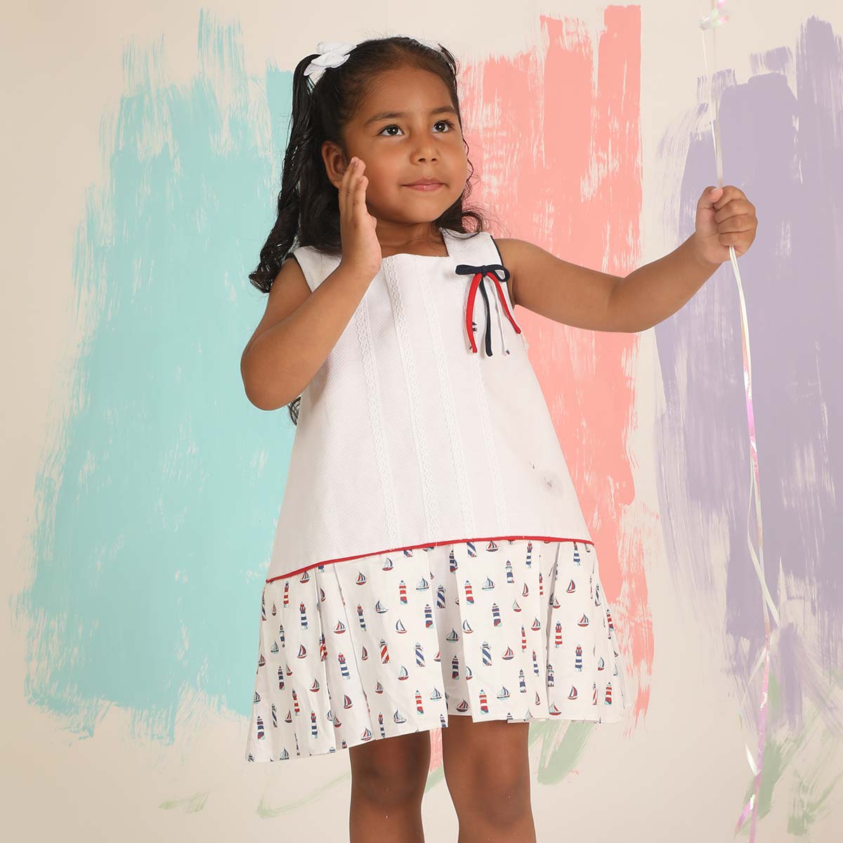 Vestido blanco con detalles de barcos y lazos.