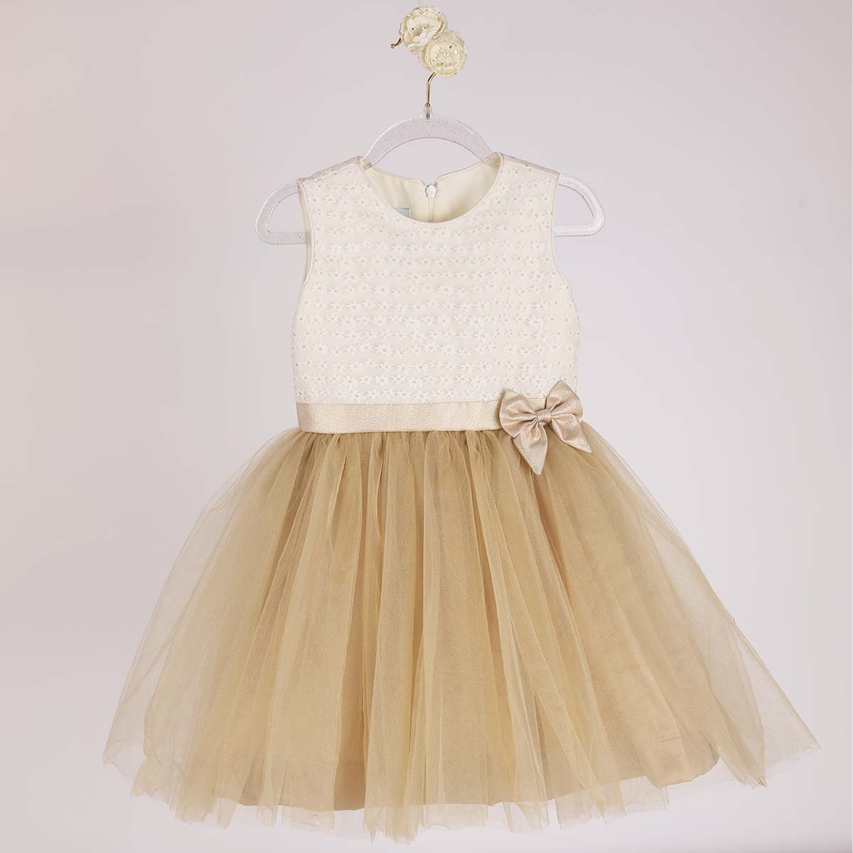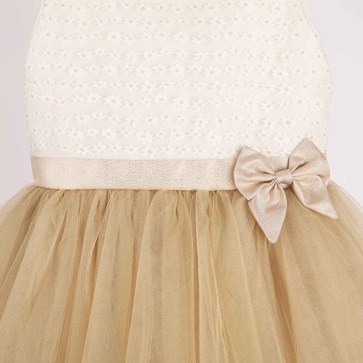 Vestido de niña en tono beige con tul dorado y lazo. Modelos perfecto para una ocasión especial. Confeccionado en tela 100% algodon.