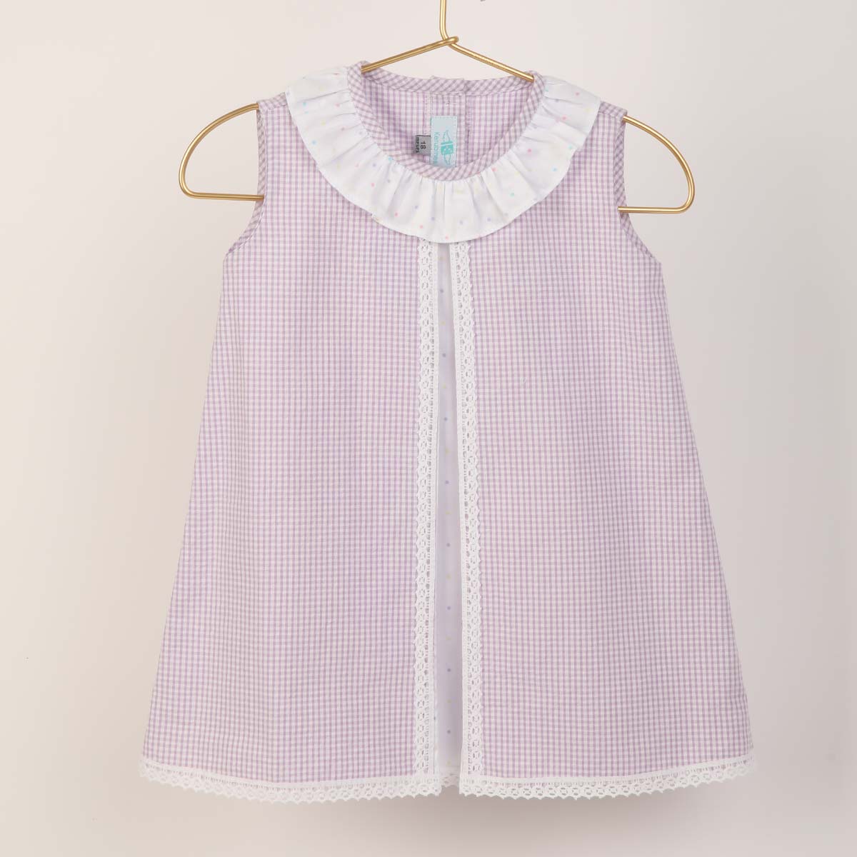 Vestido de niña en tono cuadros lilas con encaje en el centro. Confeccionado en tela 100% algodon.